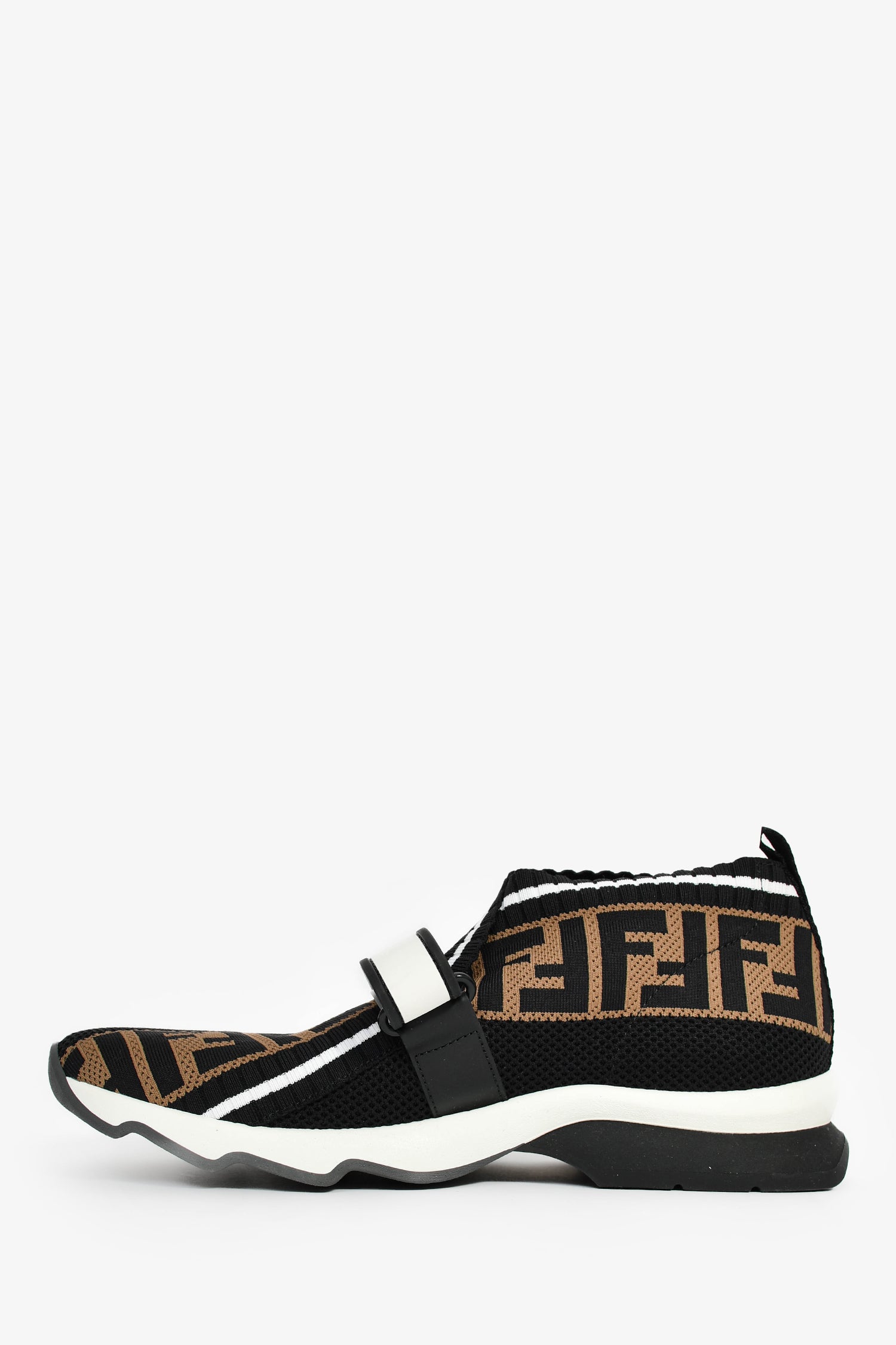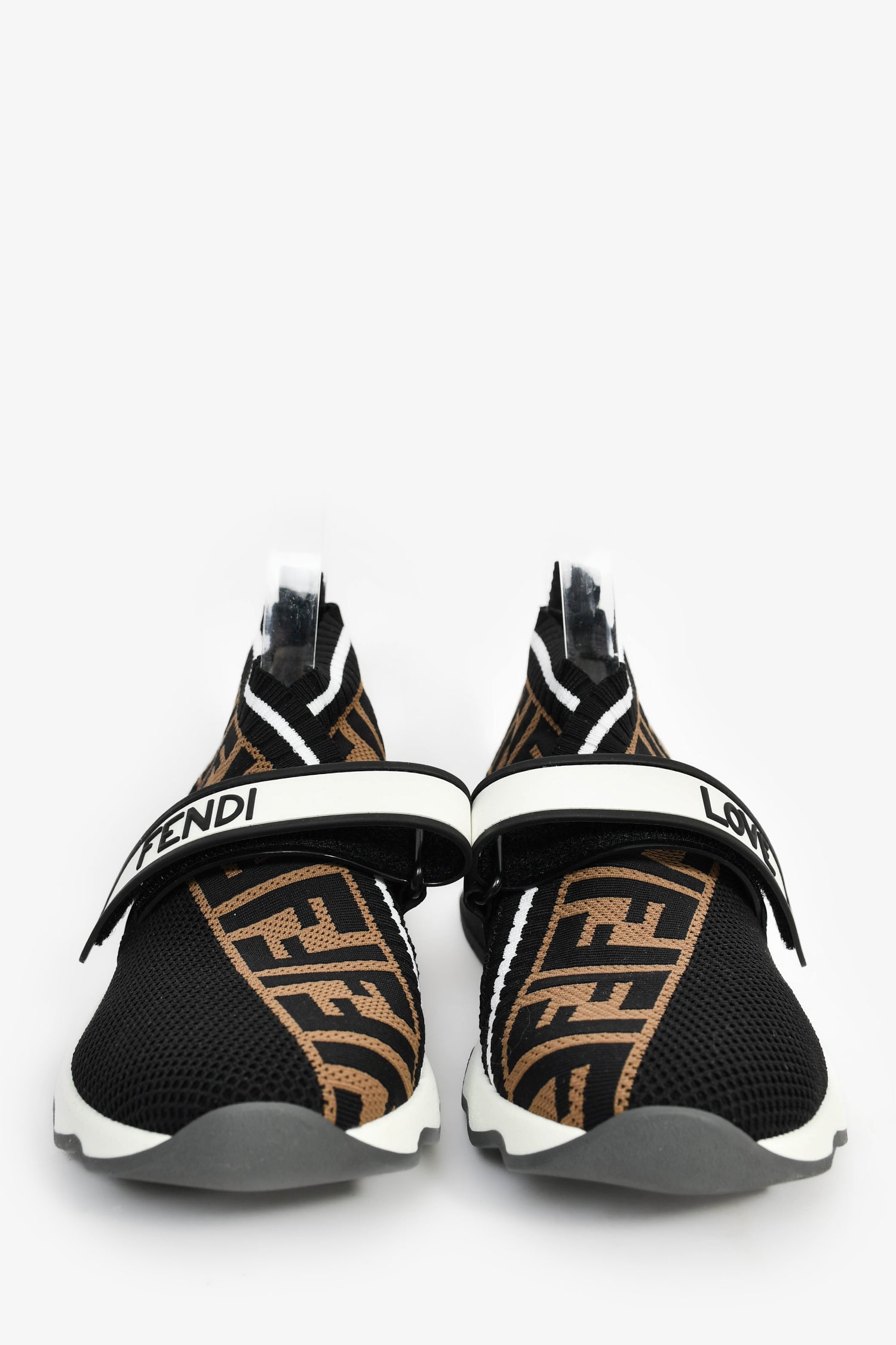 Refresh availabilityFendi Black/Brown Zucca Knit Fabric Rockoko Slip On Sneakers. Almond toe. Front velcro closure. Tonal stitching.