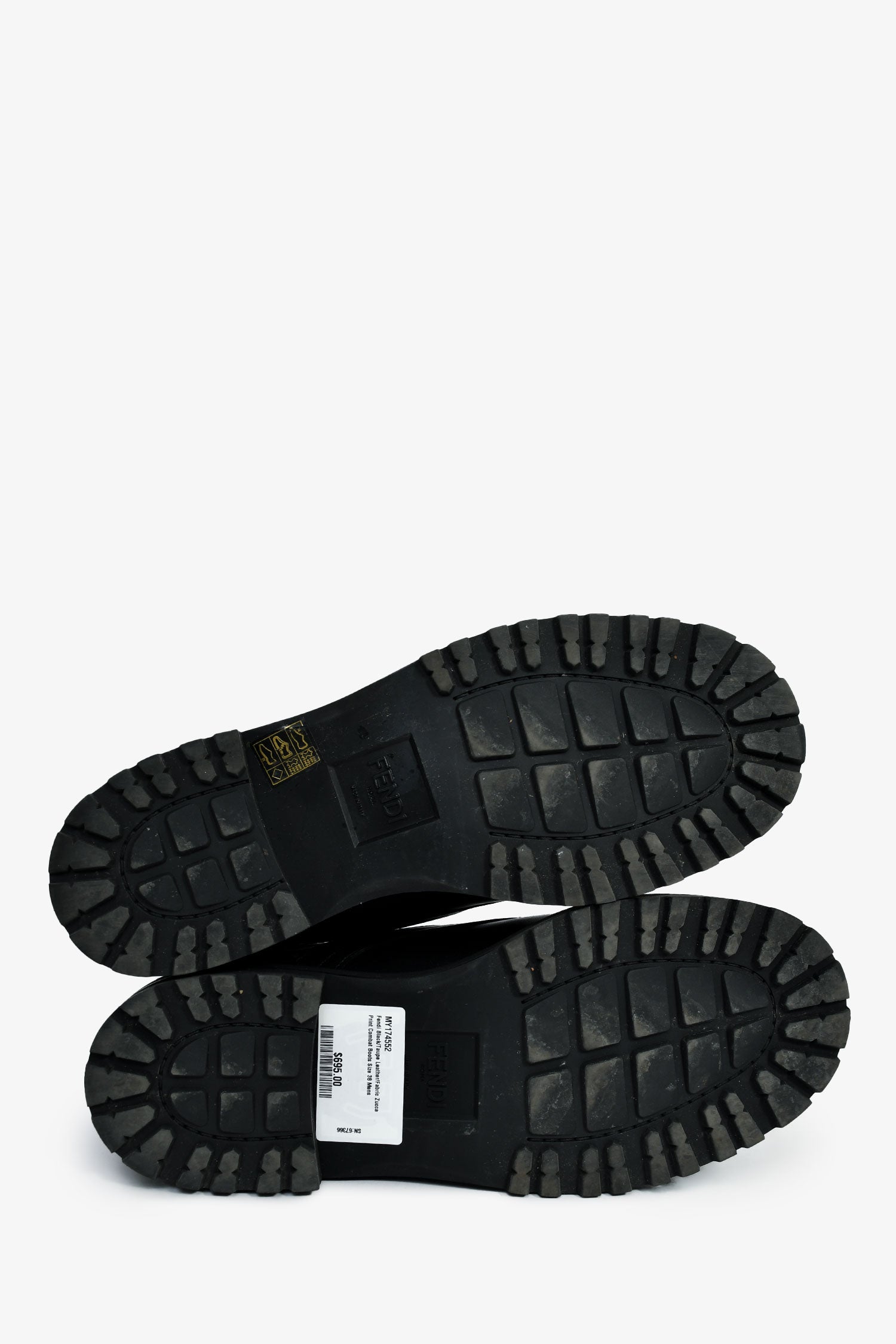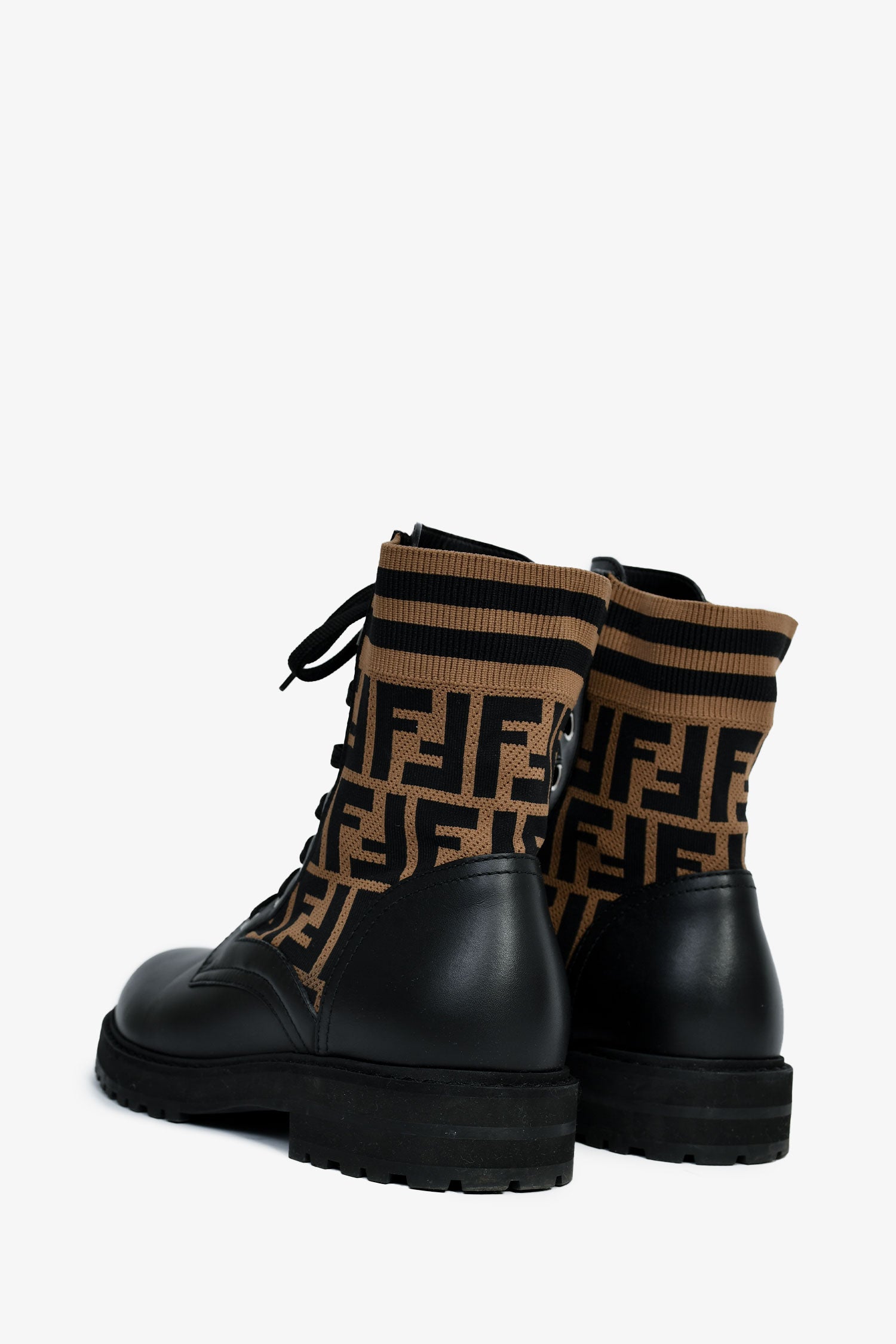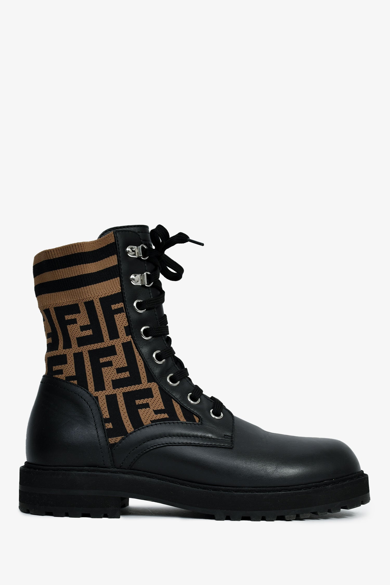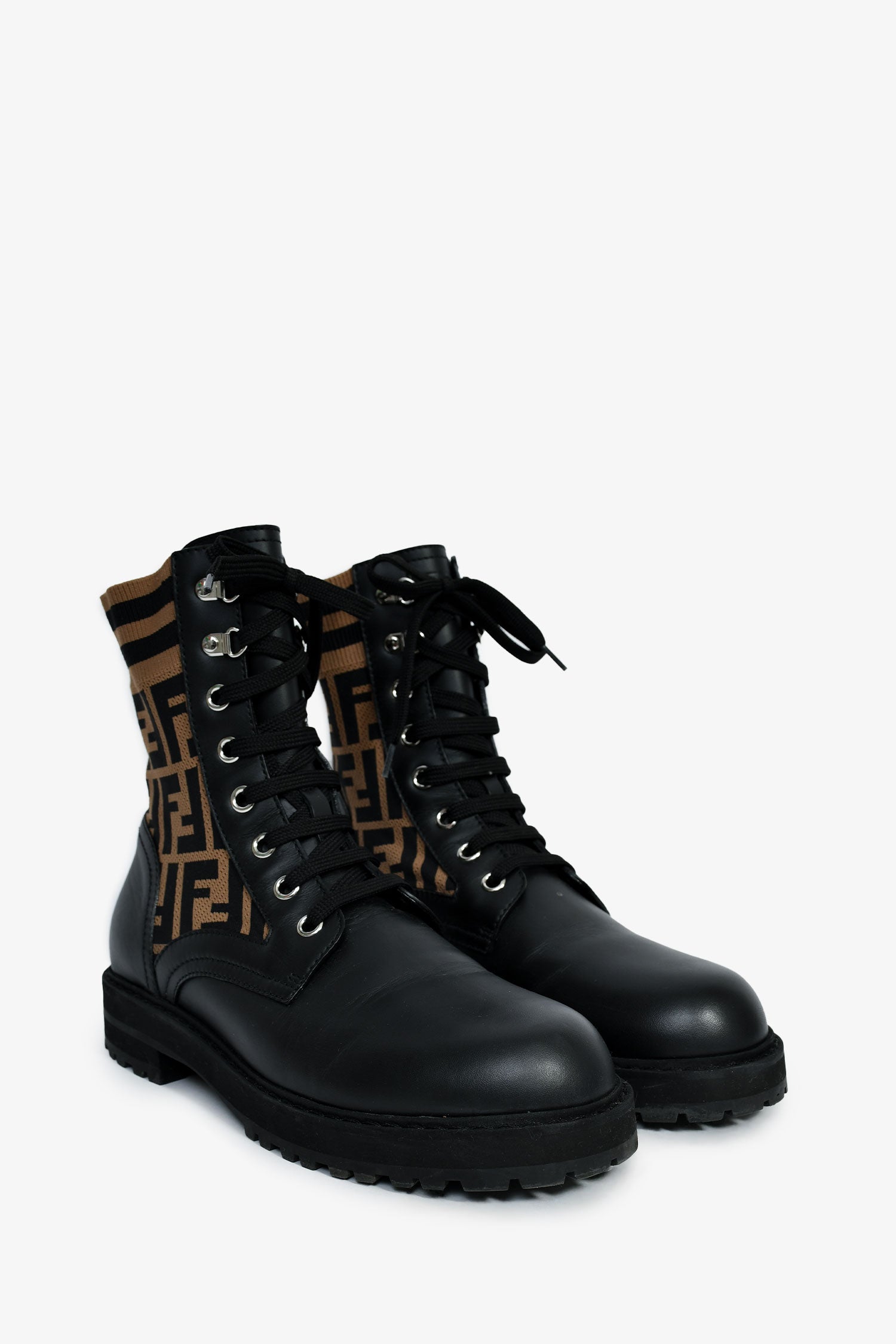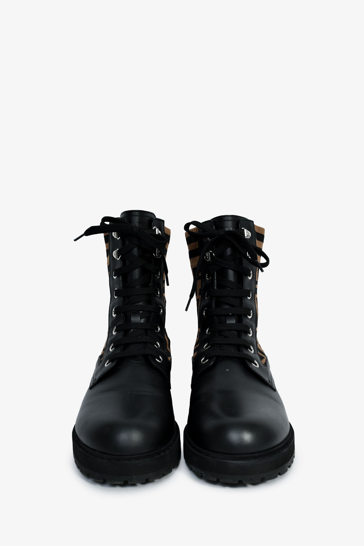 Refresh availabilityFendi Black/Taupe Leather/Fabric Zucca Print Combat Boots. Round toe. Lace front closure. Rubber soles. Zucca print motif. Silver-tone hardware. Tonal stitching.