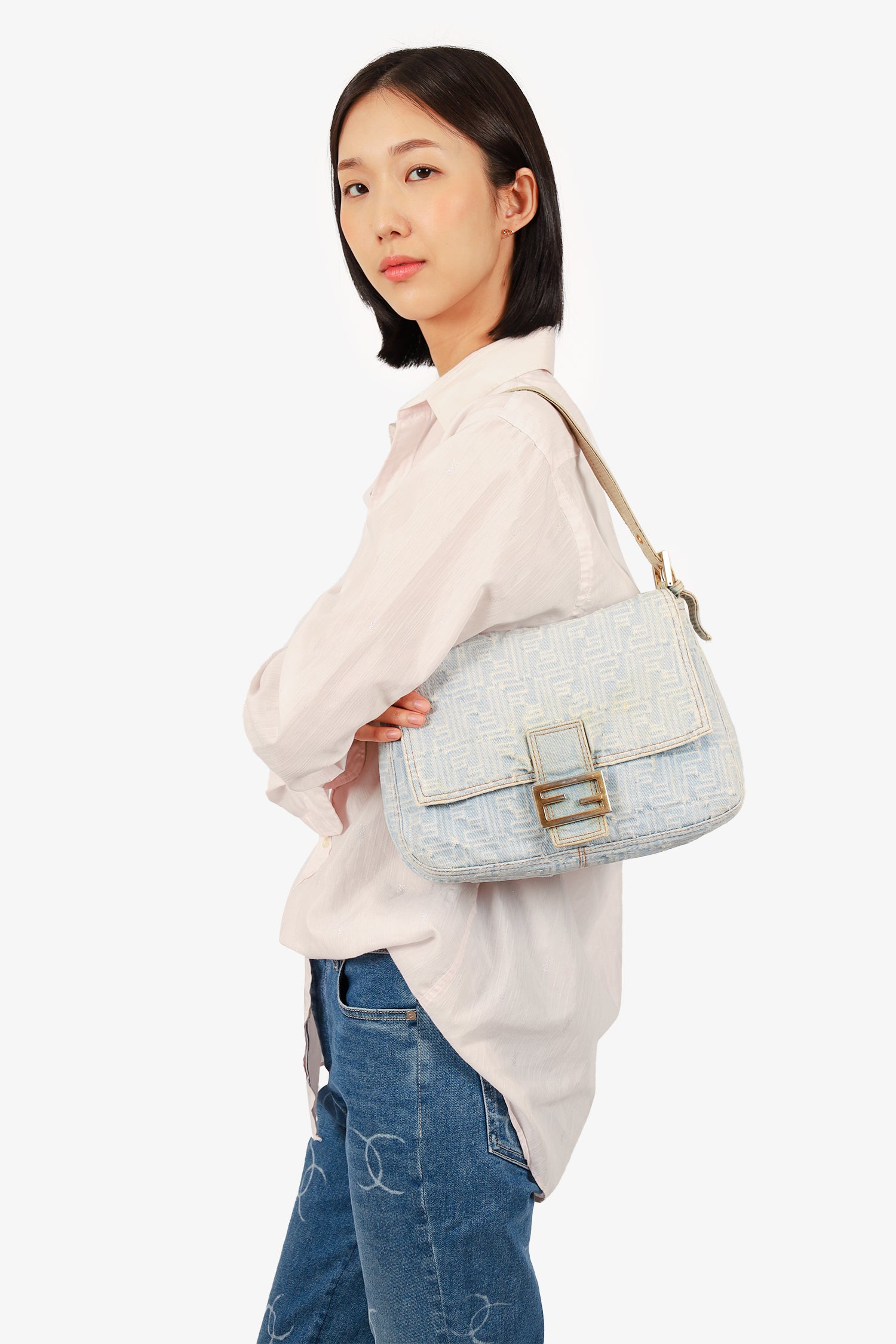 Refresh availabilityFendi Blue Denim Zucca Mama Forever Baguette Bag with Bag Insert. Front fold-over flap with magnetic button closure. Adjustable shoulder strap. Colourful Fendi print lining. 1 interior zip pocket. Removable insert included. Gold-tone hardware. Contrast stitching.