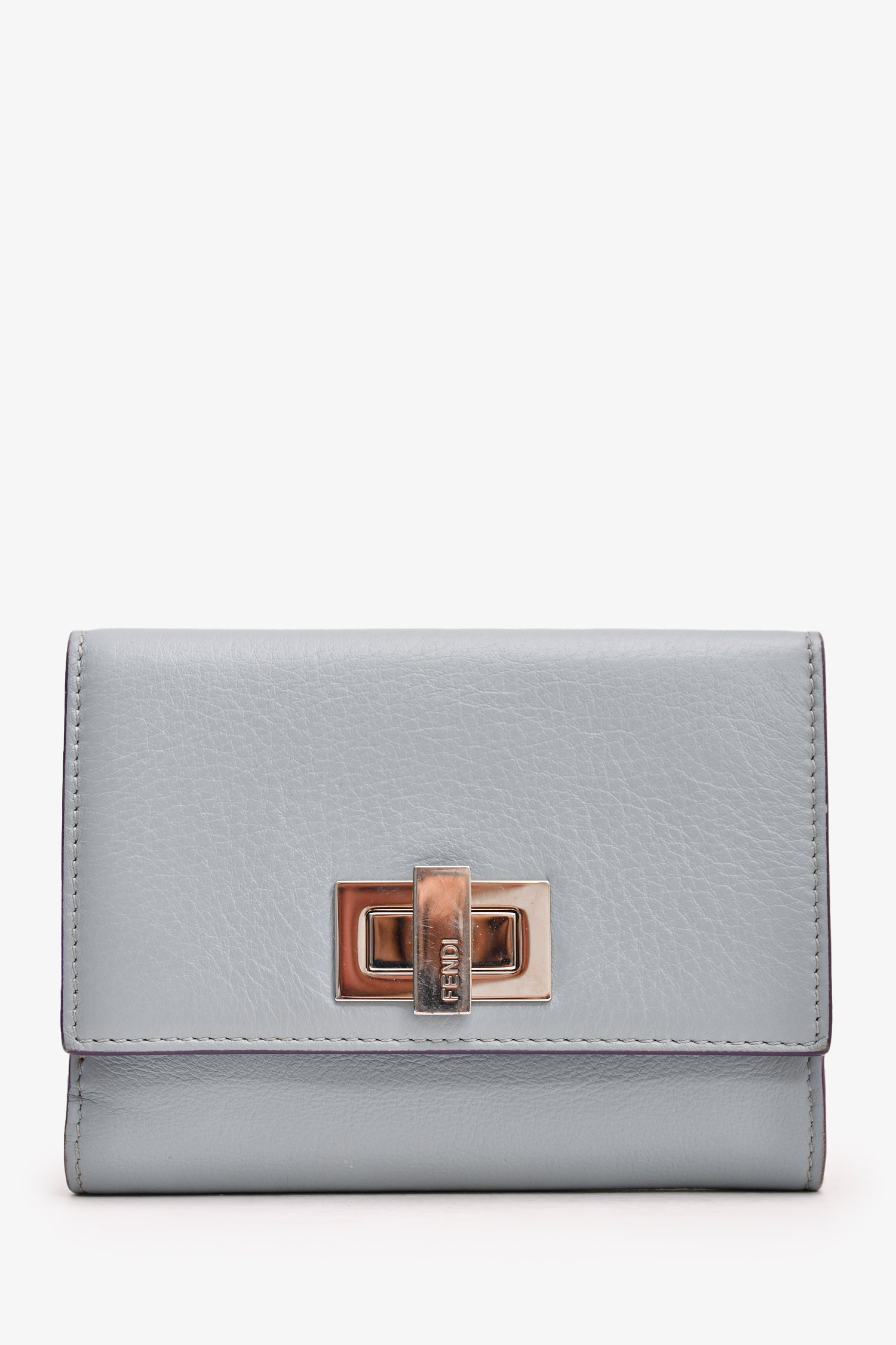 Refresh availabilityFendi Blue Leather Peekaboo Wallet With Red Interior. Rear fold over flap with snap closure. Front fold over flap with twist tab closure. 6 interior card slots. 4 interior slip billfold compartments. 2 interior open compartments. Silver-toned hardware. Tonal stitching.