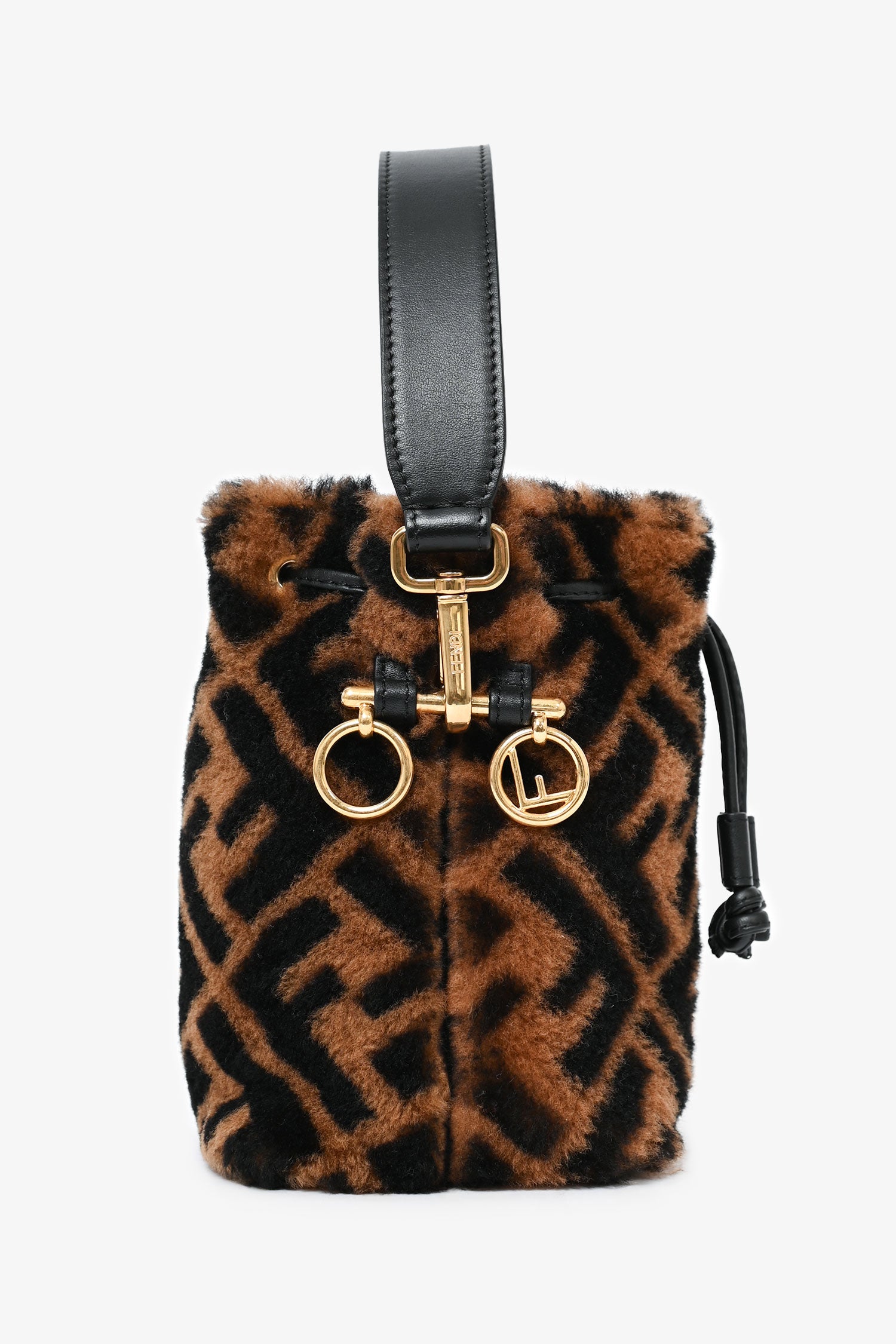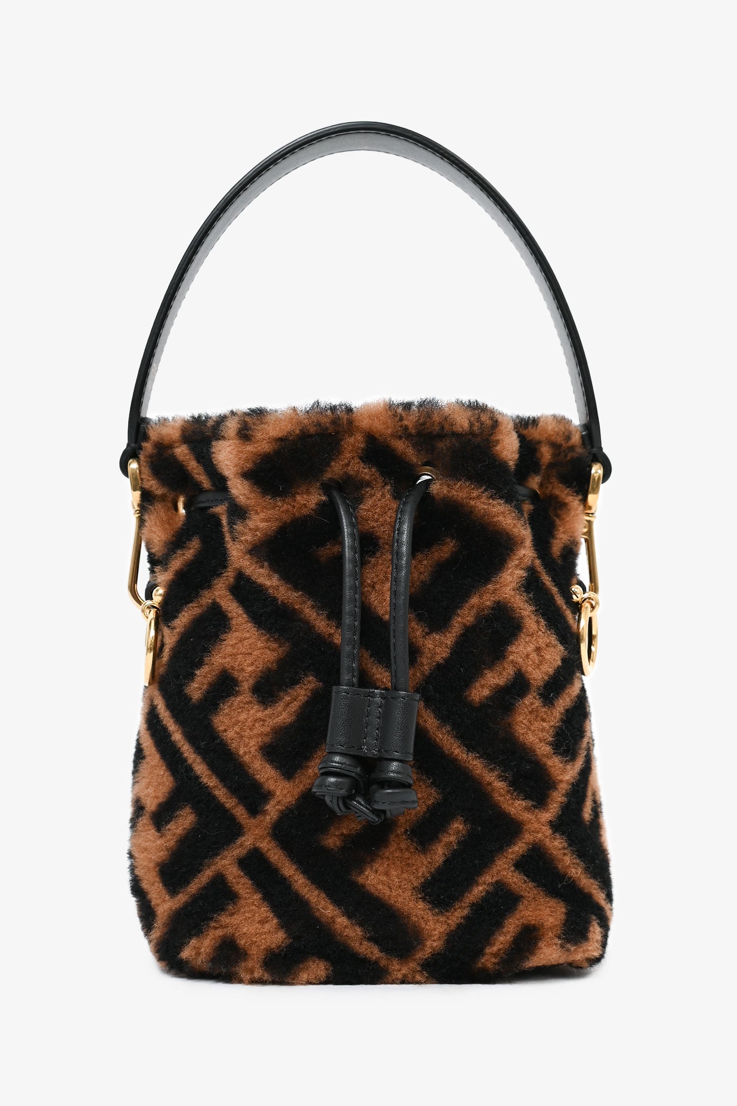Refresh availabilityFendi Brown/Black FF Sherpa Mon Tresor Bucket Bag. Gold-tone hardware. Suede lined interior. Leather pull tabs. Single leather flat handle. Sherpa throughout. Leather trimming. Comes with a strap. Tonal stitching.