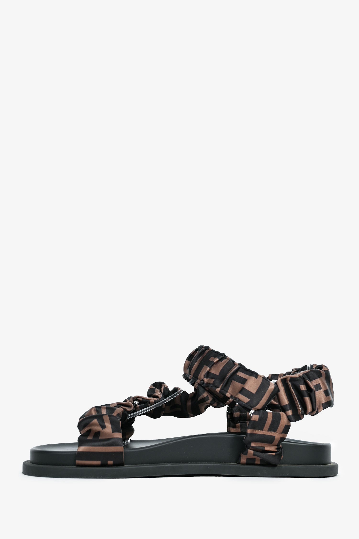 Refresh availabilityFendi Brown/Black Zucca Satin Feel Sandals. Open toe. Elasticized shoe straps with velcro closure. Gold-tone hardware. Tonal stitching.