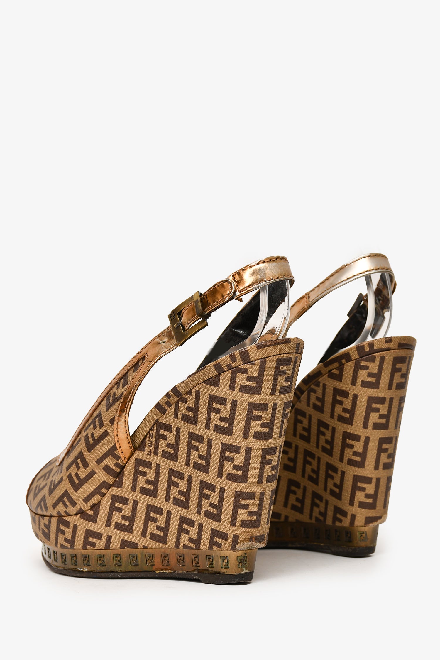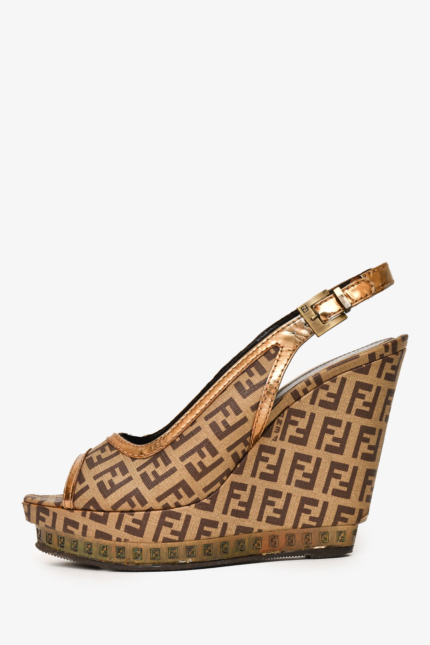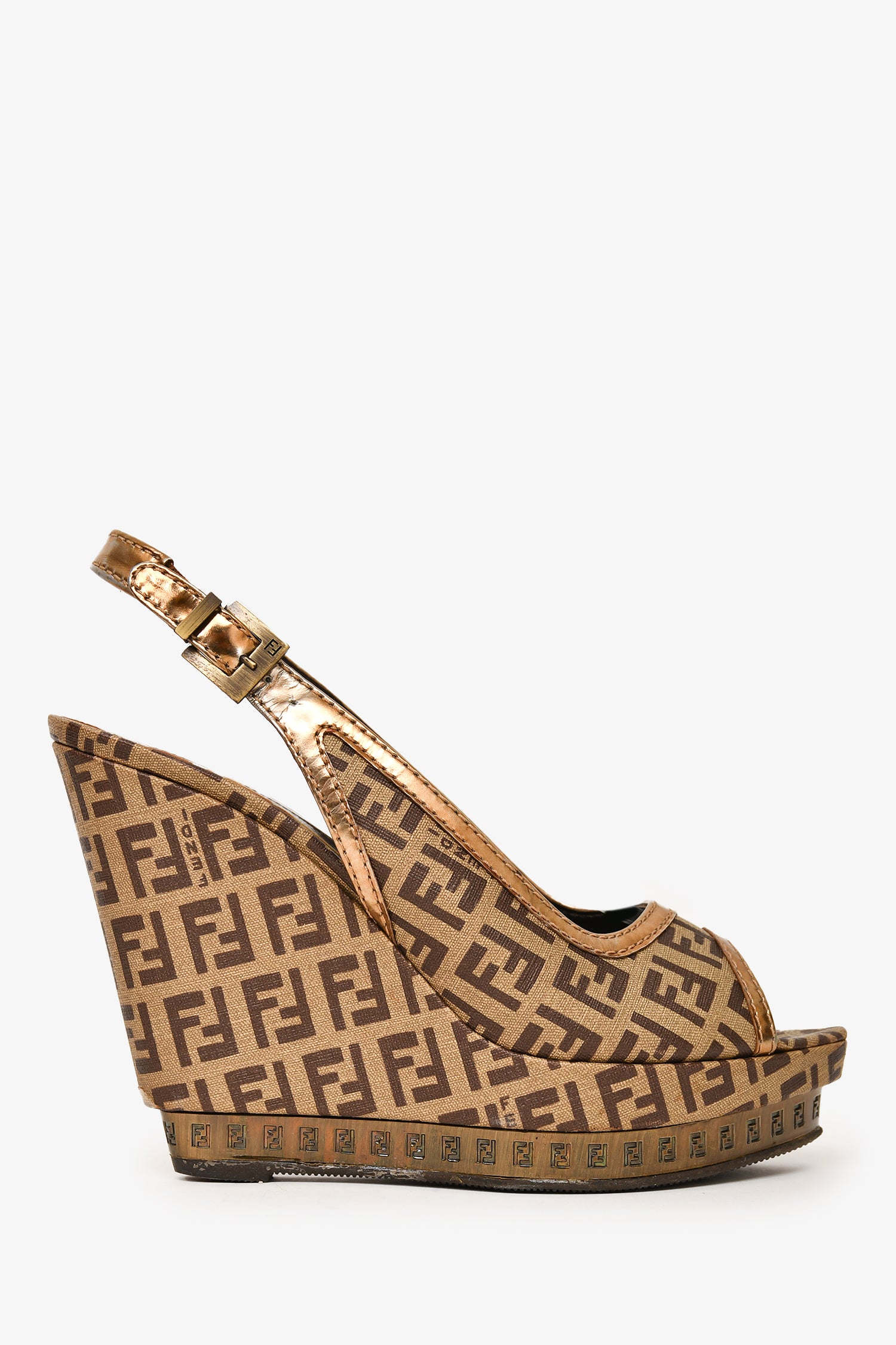 Refresh availabilityFendi Brown FF Zucca Peep Toe Slingback Heels. Pointed toe. Buckle closure at the ankle. Wedged heel. Hardware detailing on the platform. Gold-tone hardware. Tonal stitching.