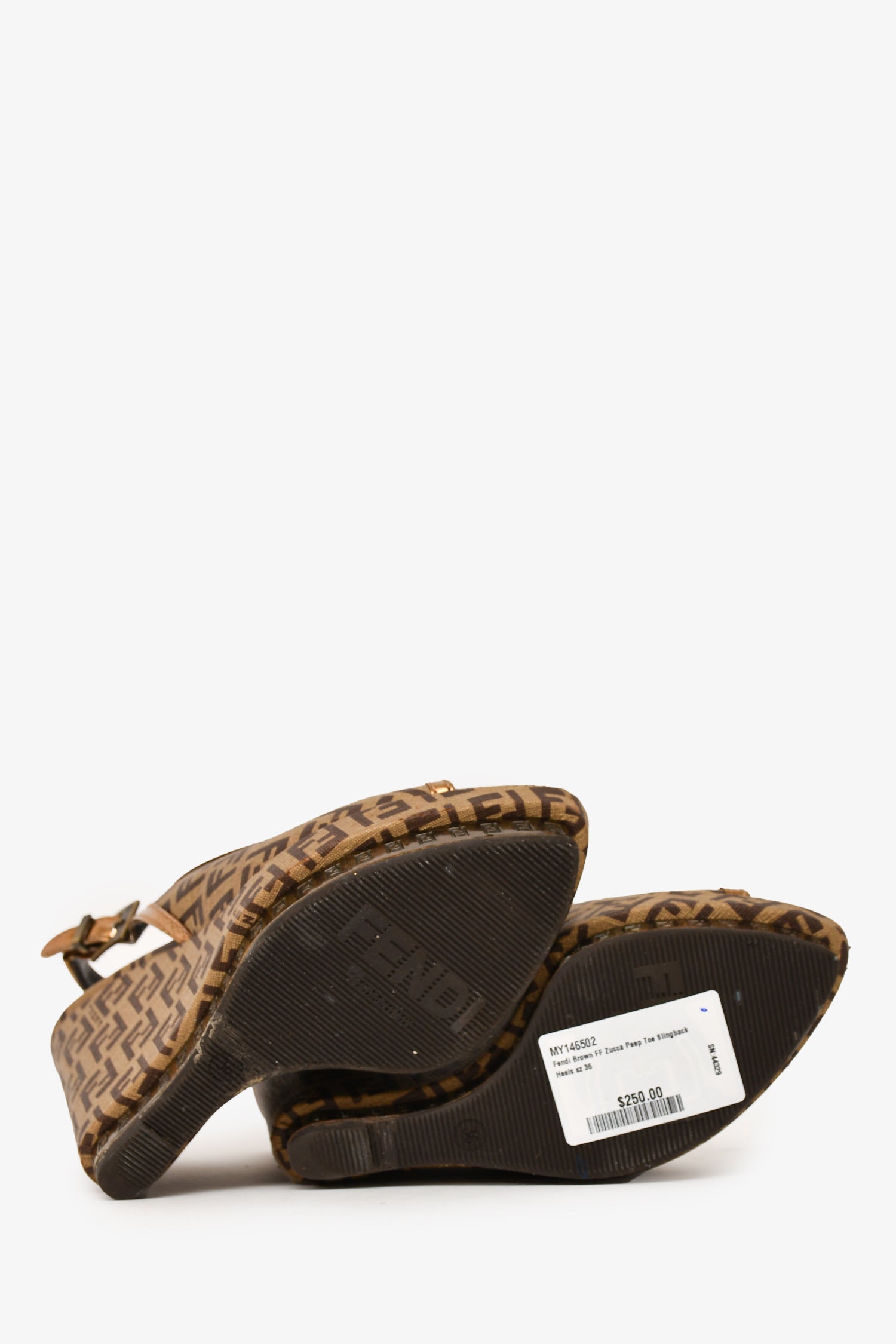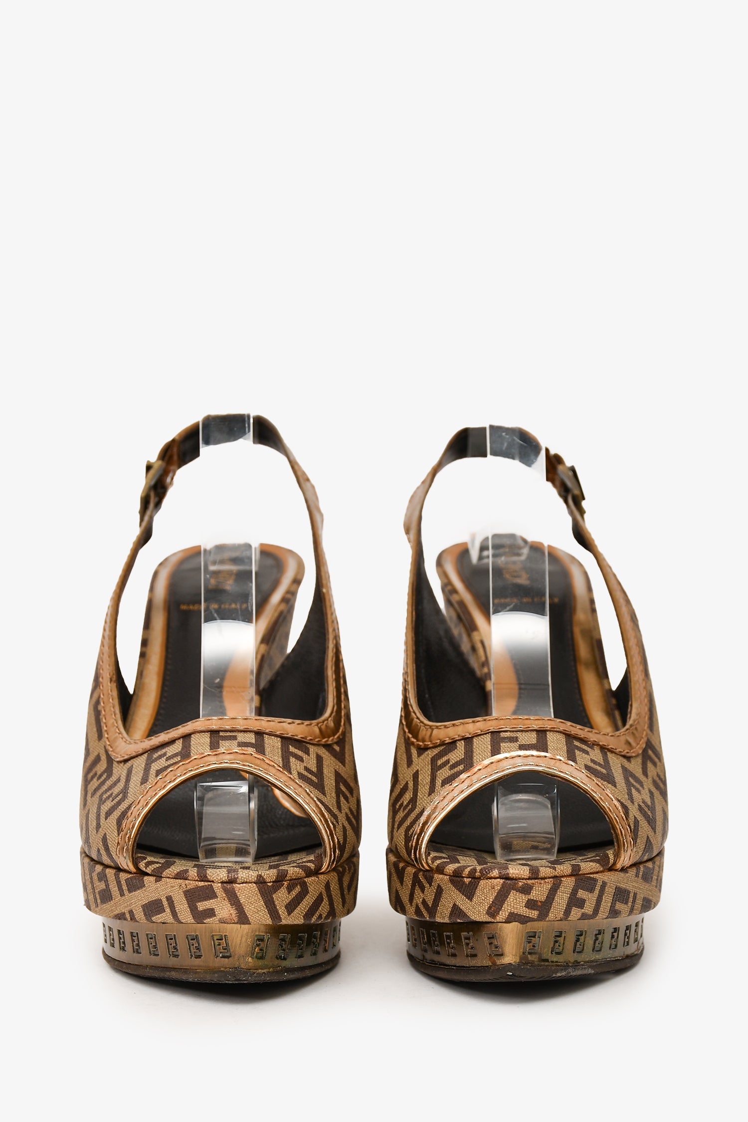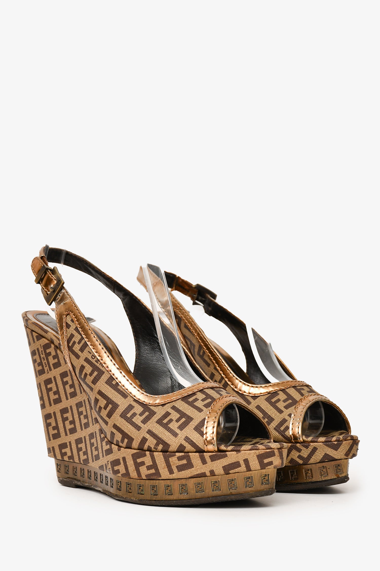 Refresh availabilityFendi Brown FF Zucca Peep Toe Slingback Heels. Pointed toe. Buckle closure at the ankle. Wedged heel. Hardware detailing on the platform. Gold-tone hardware. Tonal stitching.