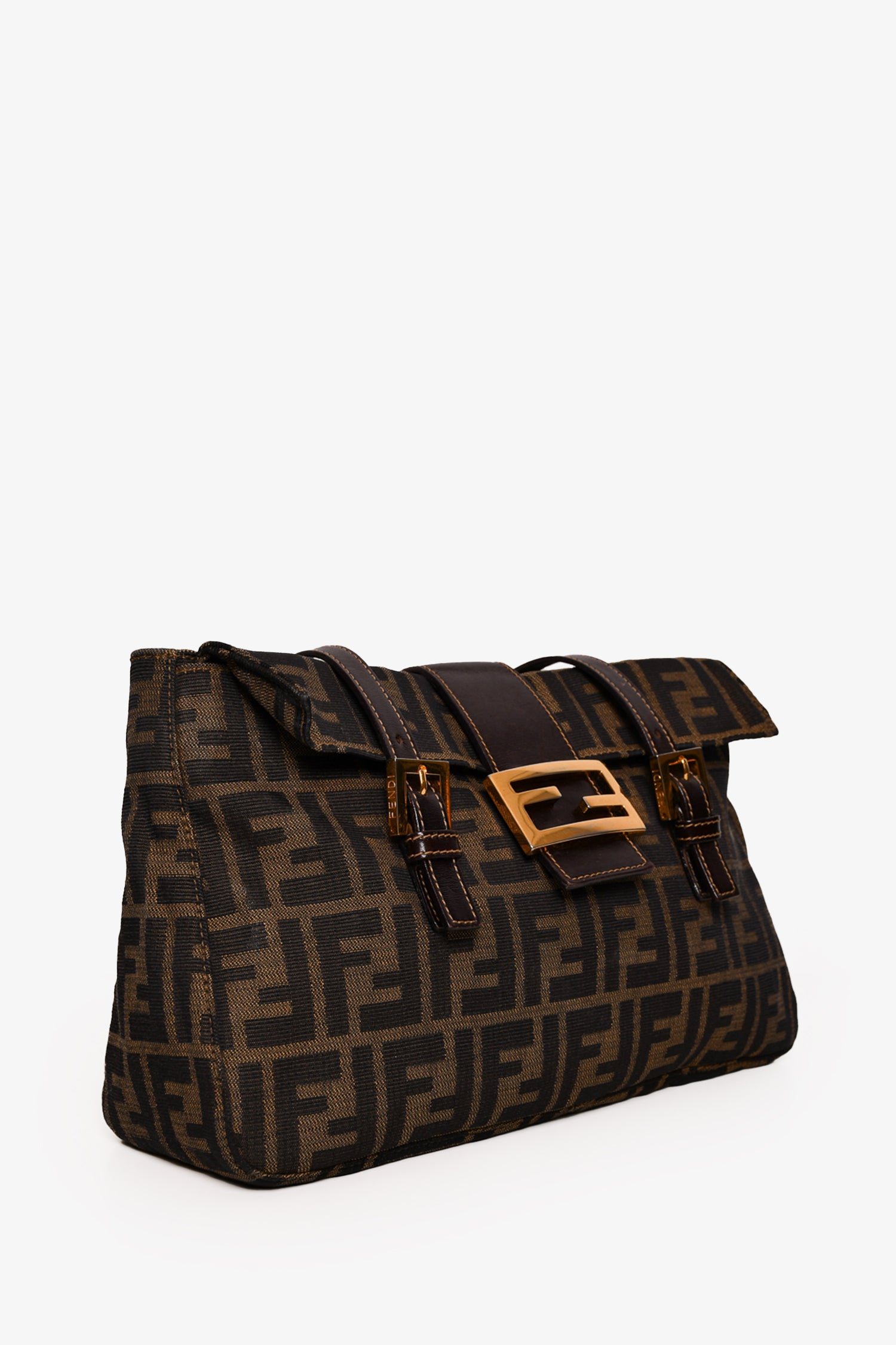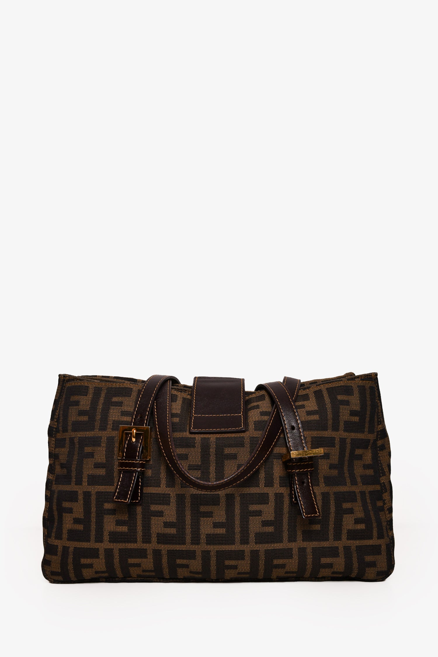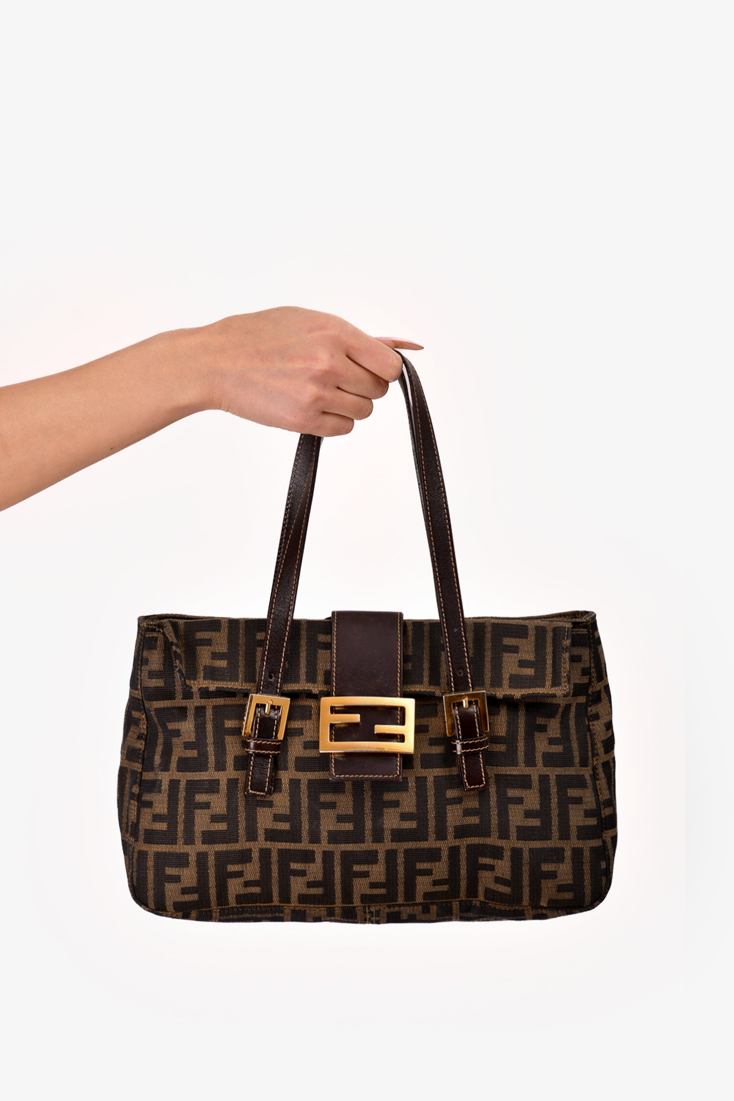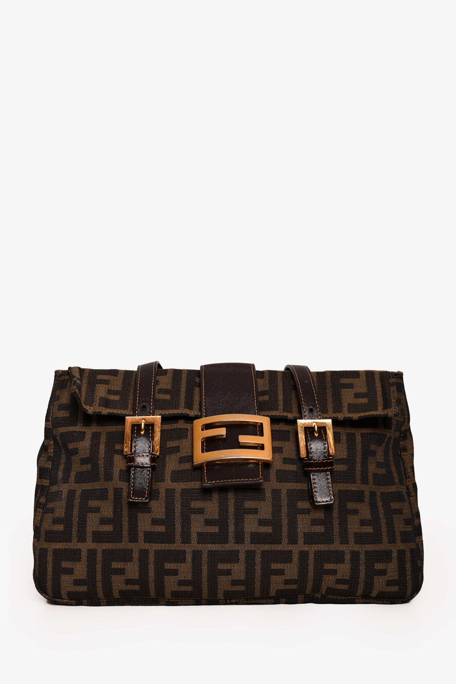 Refresh availabilityFendi Brown Zucca Canvas Double Handle Bag. Front fold-over strap with magnetic button closure. Dual adjustable handles. Tonal textile interior lining. Single interior wall zip pocket. Gold-tone hardware. Tonal stitching.