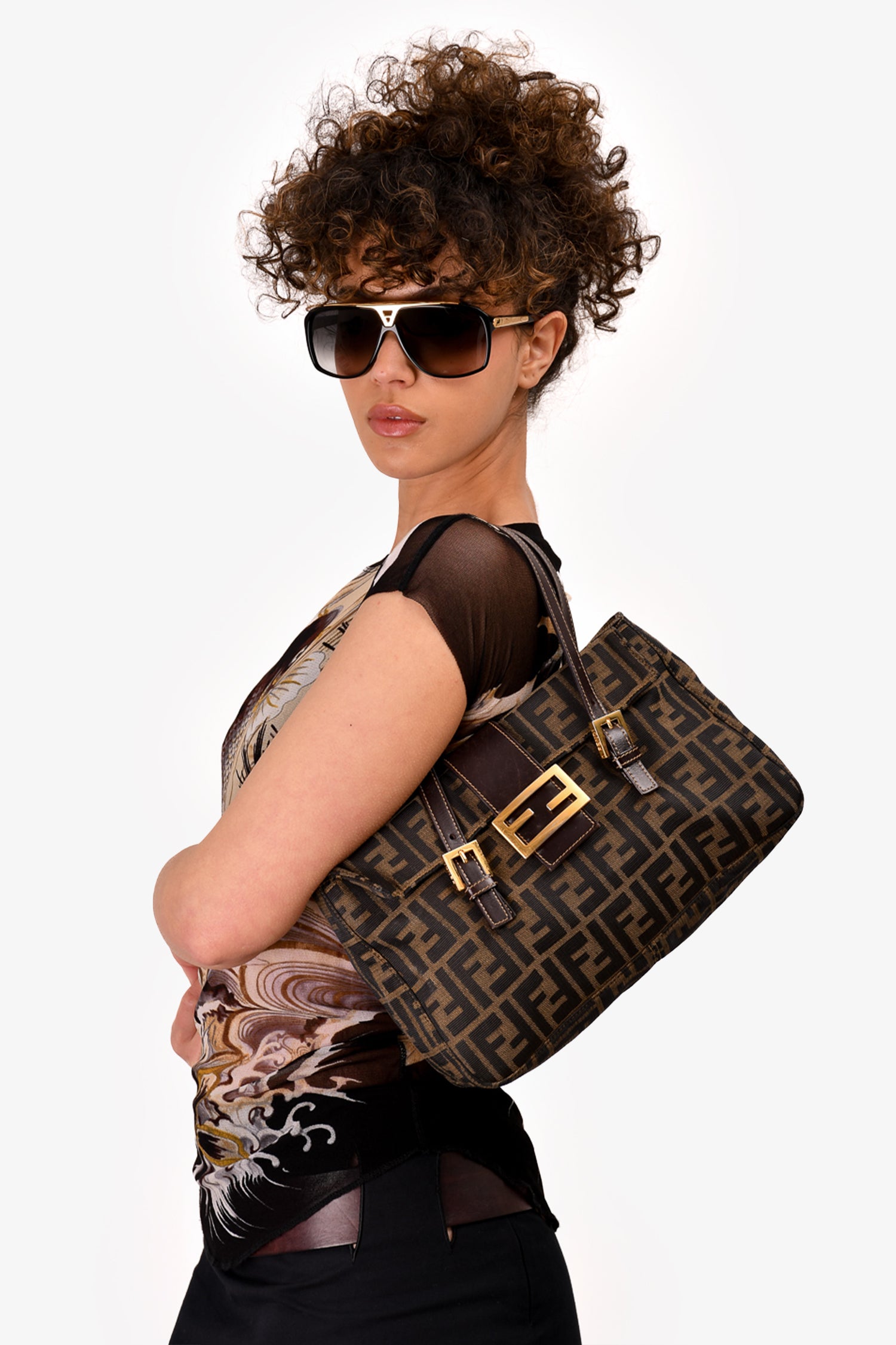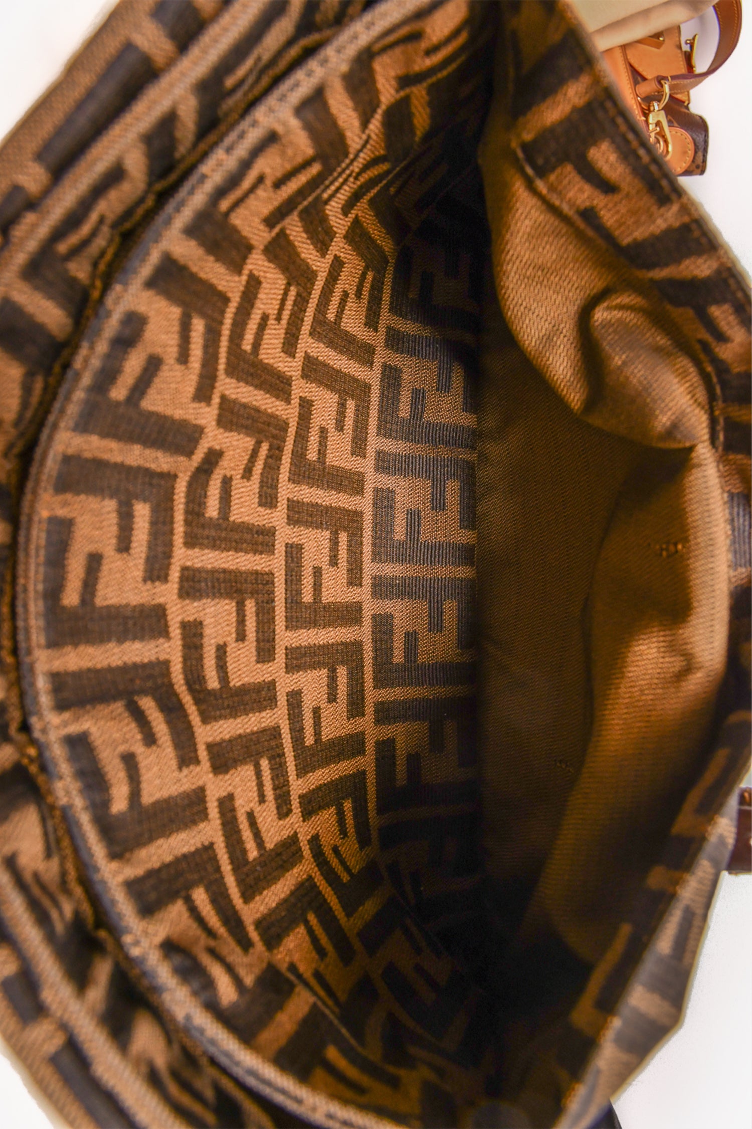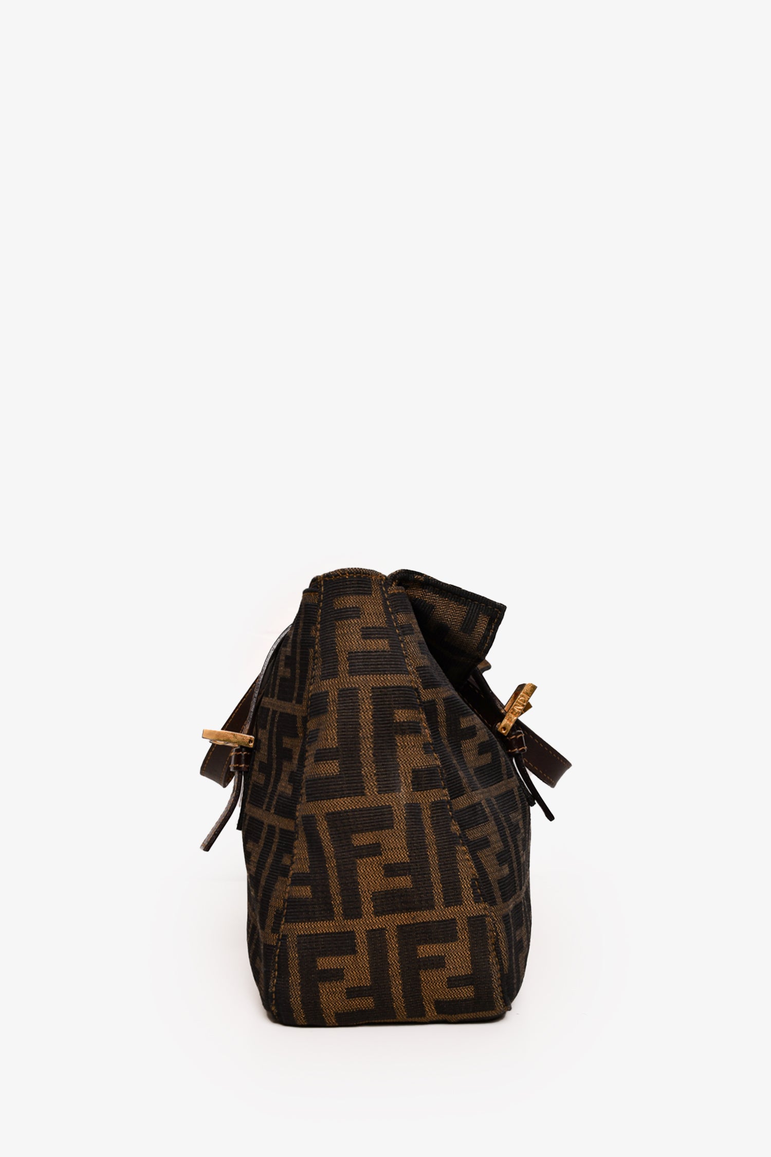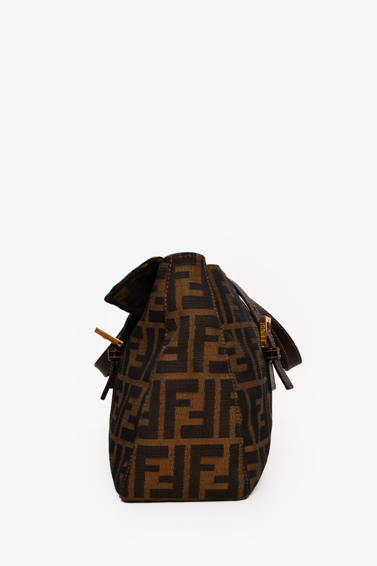 Refresh availabilityFendi Brown Zucca Canvas Double Handle Bag. Front fold-over strap with magnetic button closure. Dual adjustable handles. Tonal textile interior lining. Single interior wall zip pocket. Gold-tone hardware. Tonal stitching.
