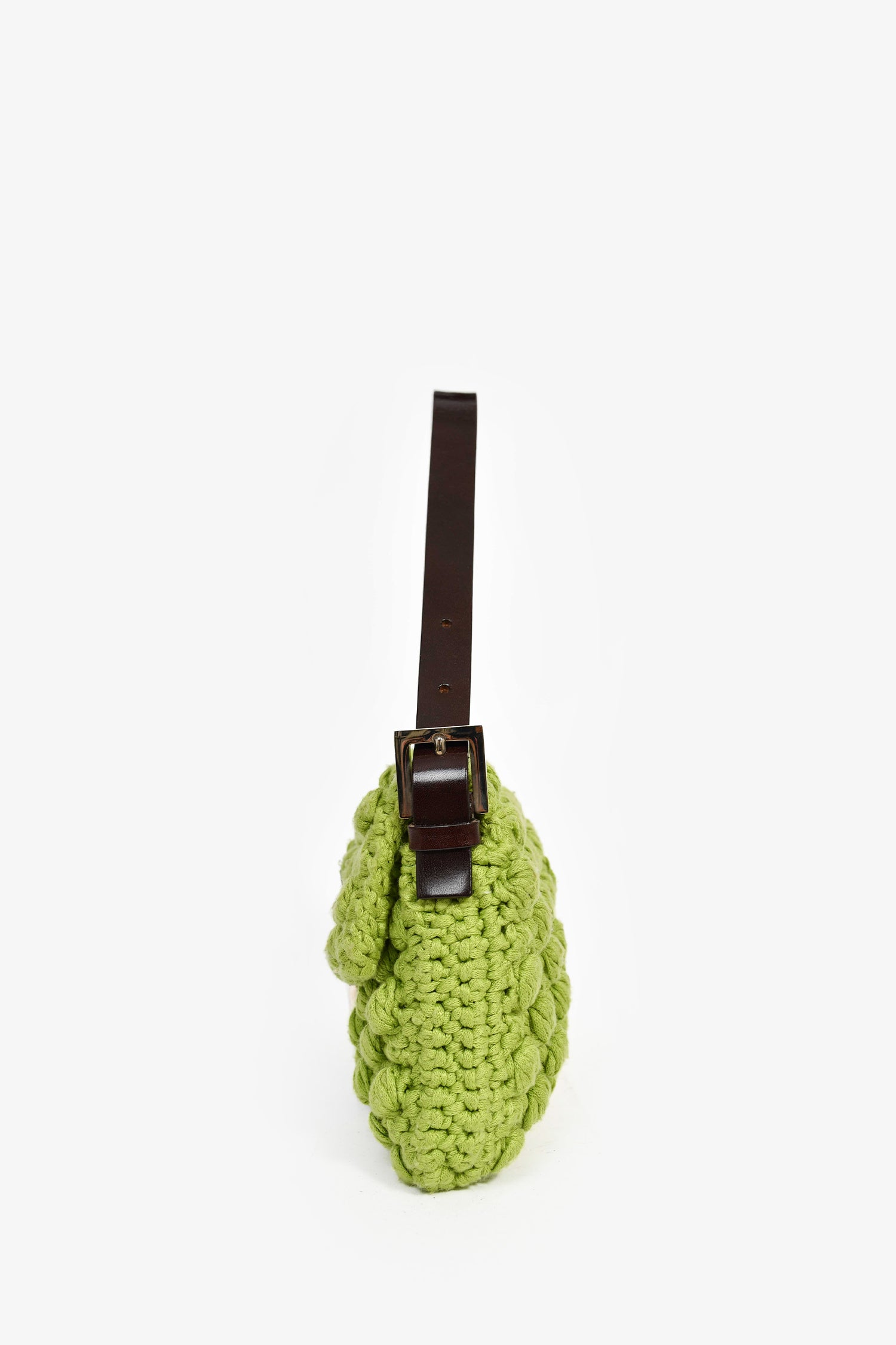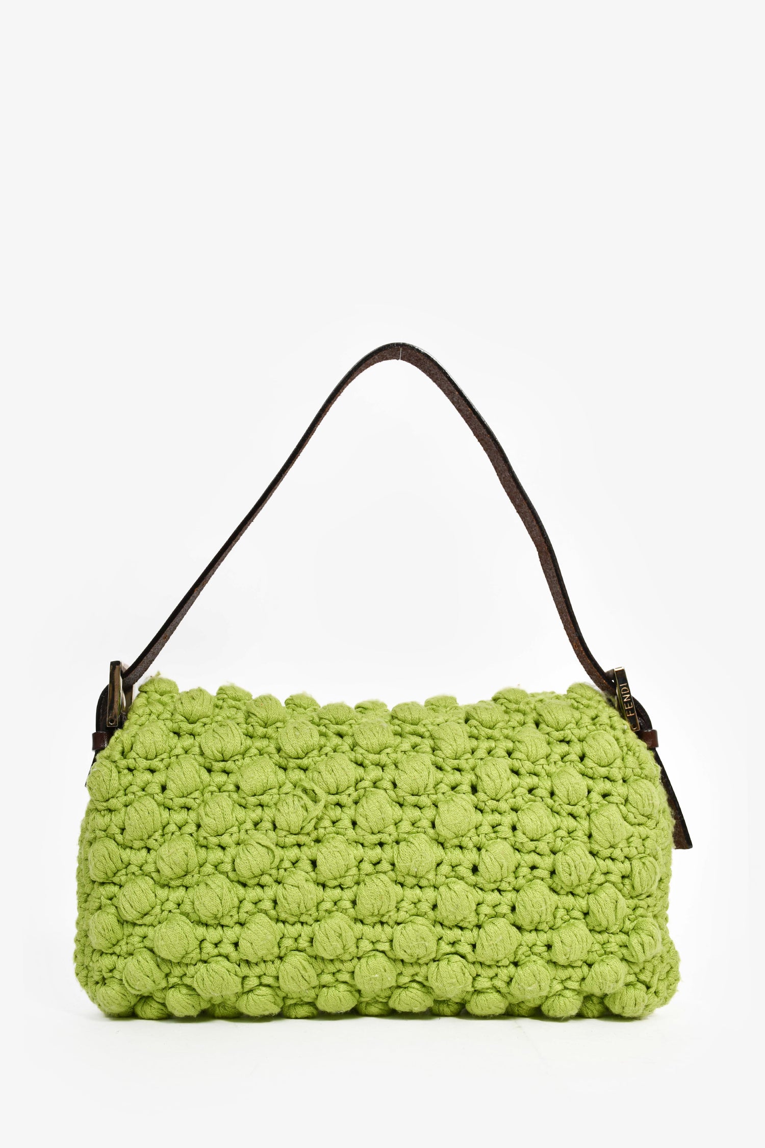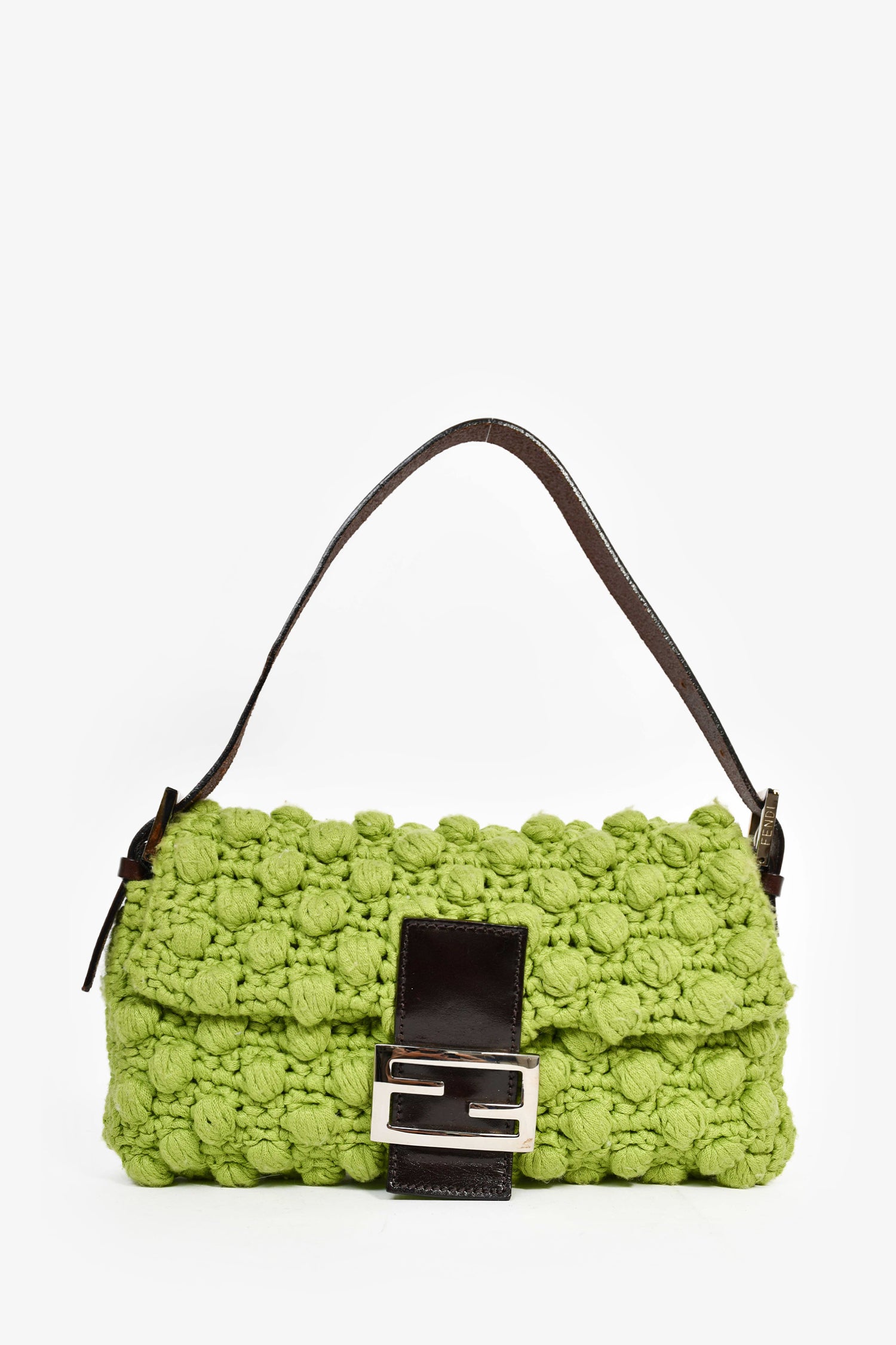 Refresh availabilityFendi Green/Brown Crochet/Leather Baguette Shoulder Bag. Front fold-over flap with magnetic button closure. Tonal textile interior lining. Single interior wall zip pocket. Adjustable shoulder strap.