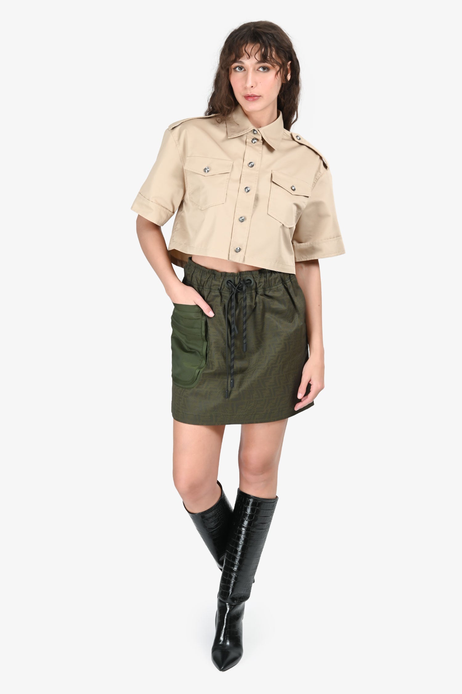 Refresh availabilityFendi Green Zucca Cotton Cargo Mini Skirt. Pull-on. Elasticized waistband with adjustable drawstrings. 2 slip pockets and 1 zip pocket in the front. Tonal stitching.
