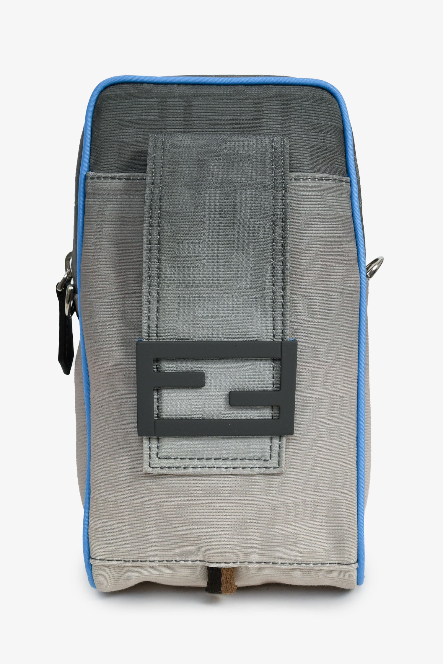 Refresh availabilityFendi Grey Ombre Canvas Blue Trim Vertical Crossbody. Top zip closure. Detachable and adjustable strap. Front exterior pocket with fold-over strap and magnetic button closure. Open lined interior. Silver-tone hardware. Tonal stitching.