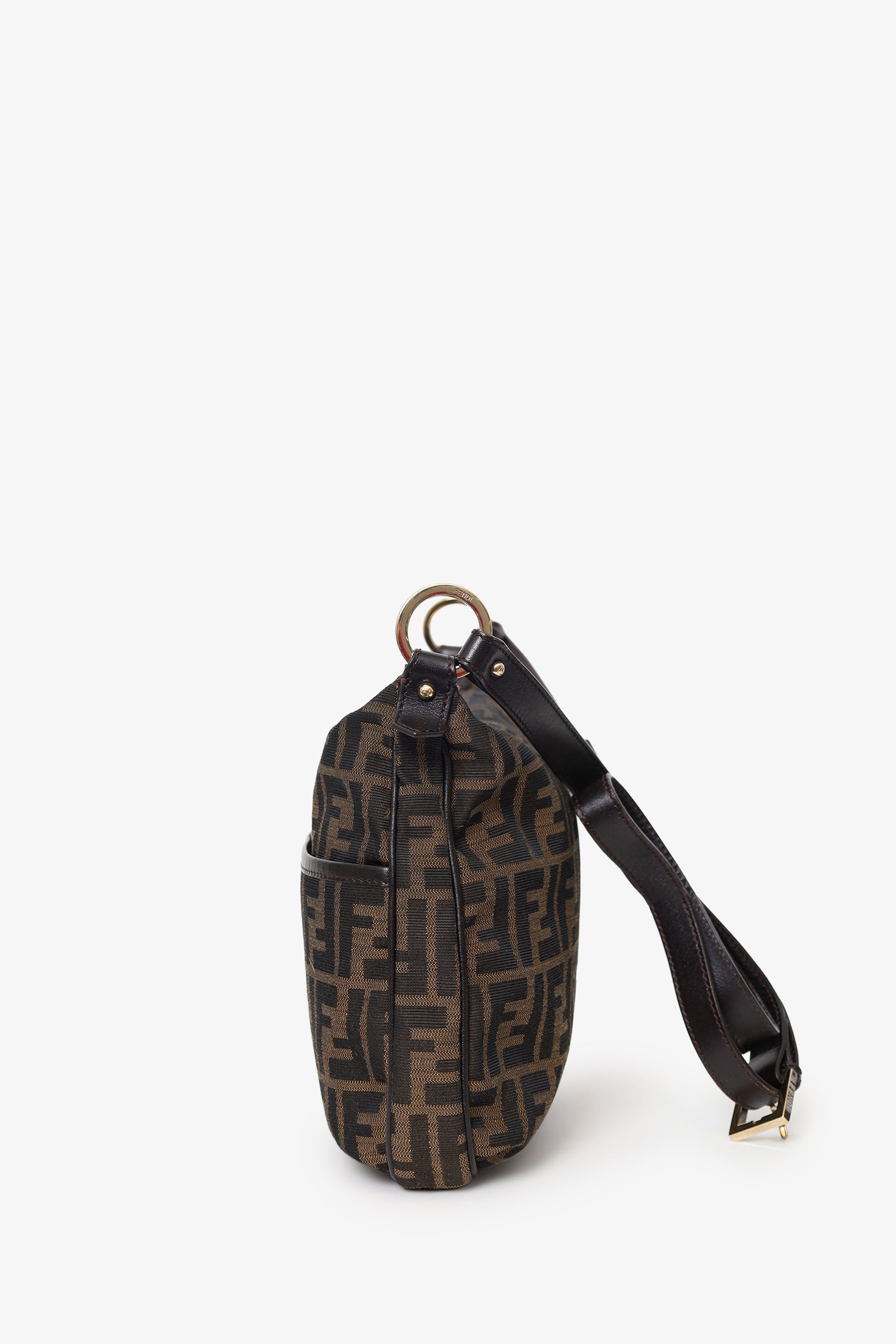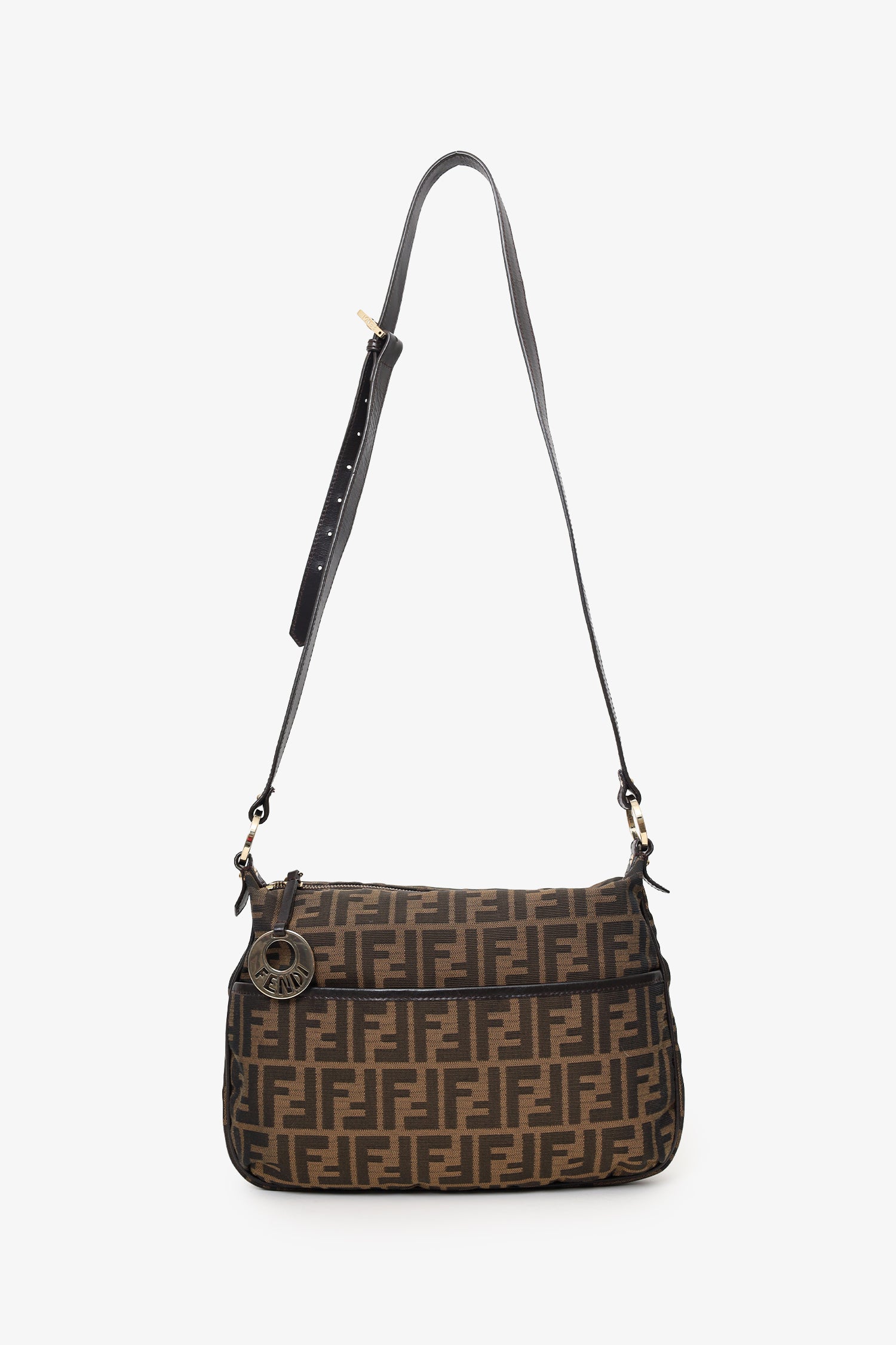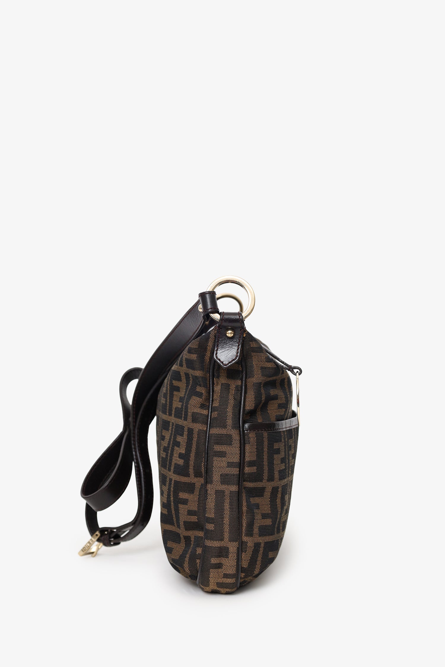 Refresh availabilityFendi Vintage Brown Zucca Canvas Crossbody Bag. Top zip-up closure. Crossbody strap with adjustable pull-through buckle closure. Single exterior snap-button-up pocket. Lined interior with single rear slit pocket. Gold-tone hardware. Tonal stitching.
