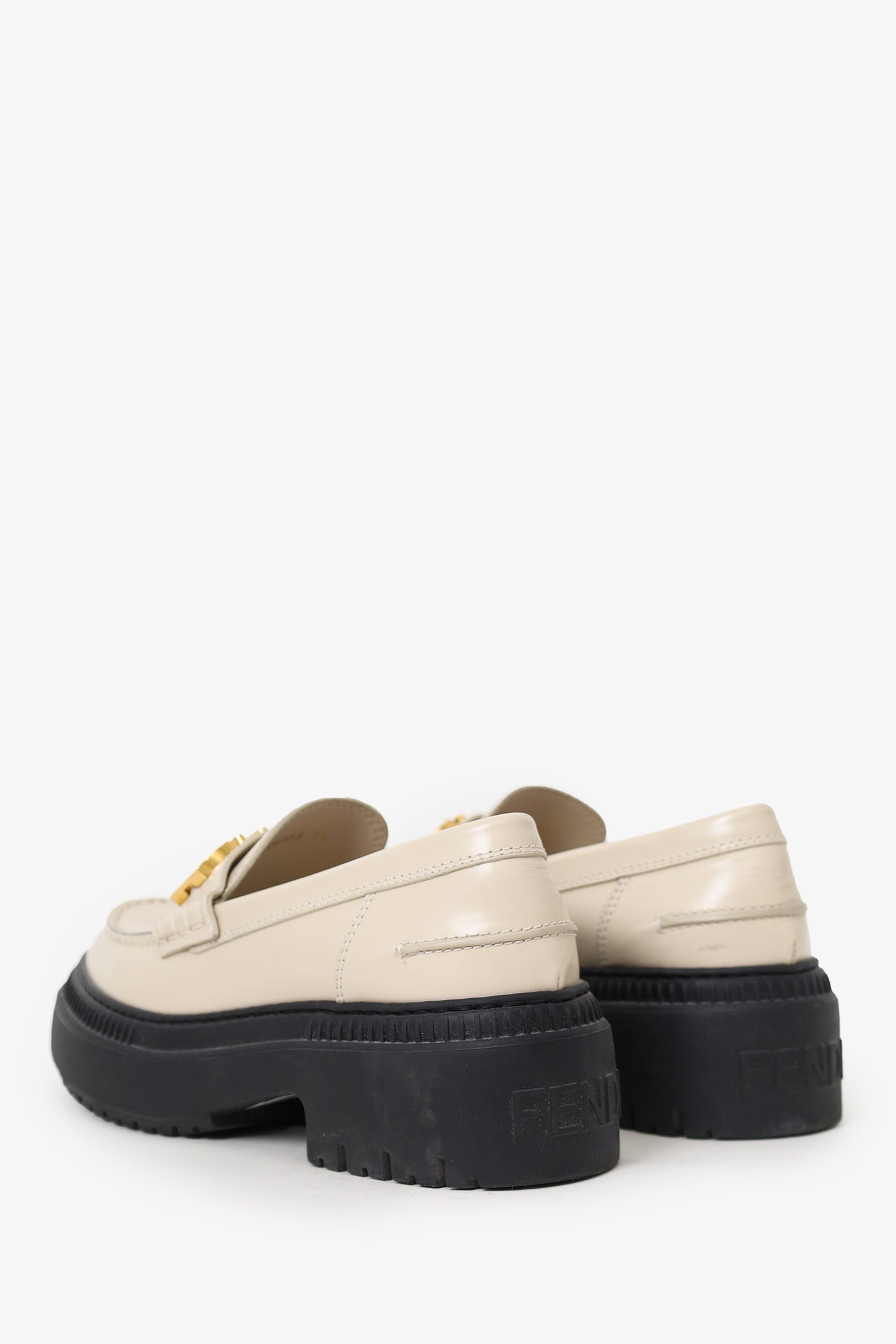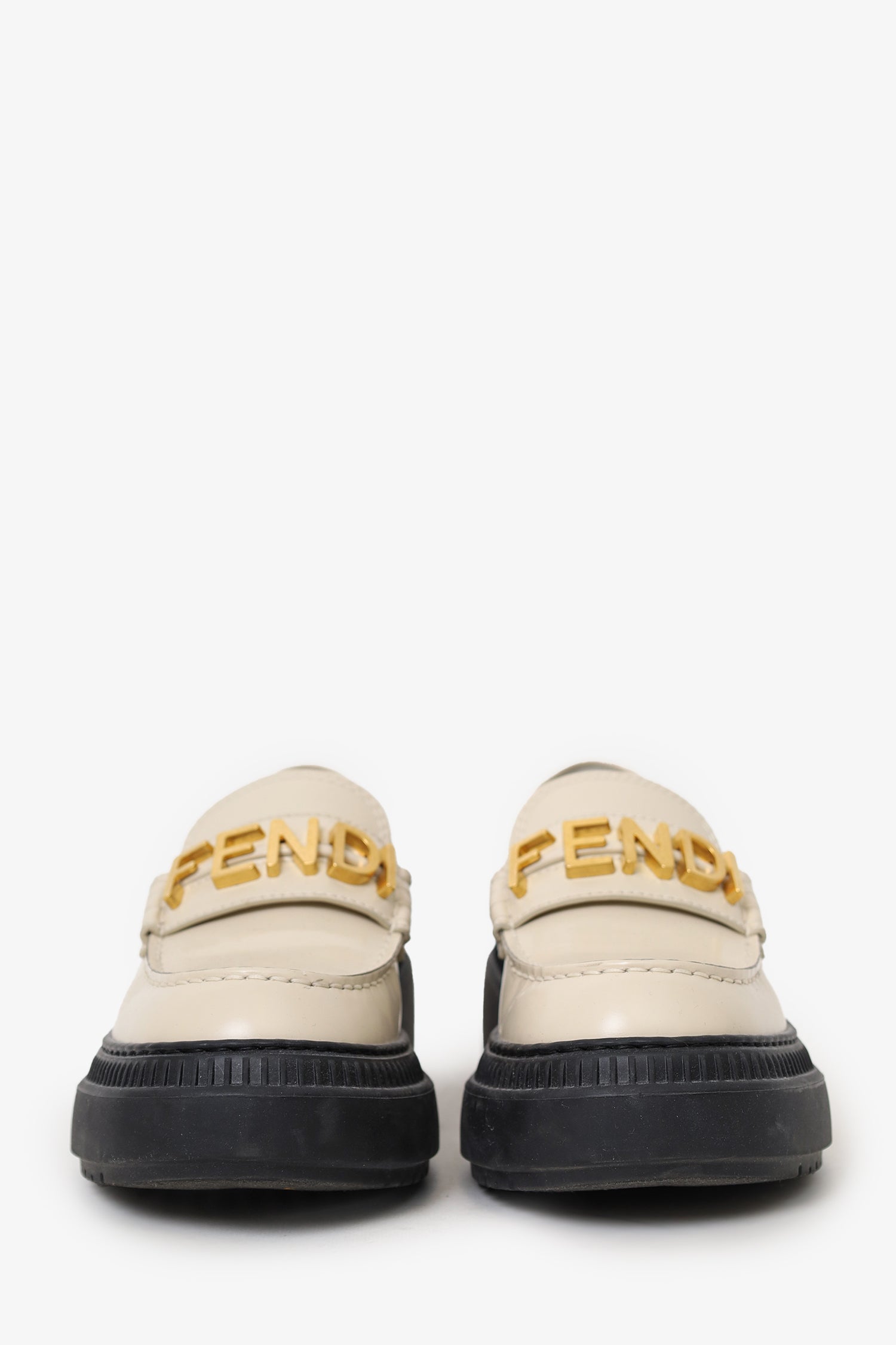 Refresh availabilityFendi White Leather Fendigraphy Lug Sole Loafers. Slip-on. Round-toe. Logo hardware at vamp. Gold-tone hardware. Tonal stitching.