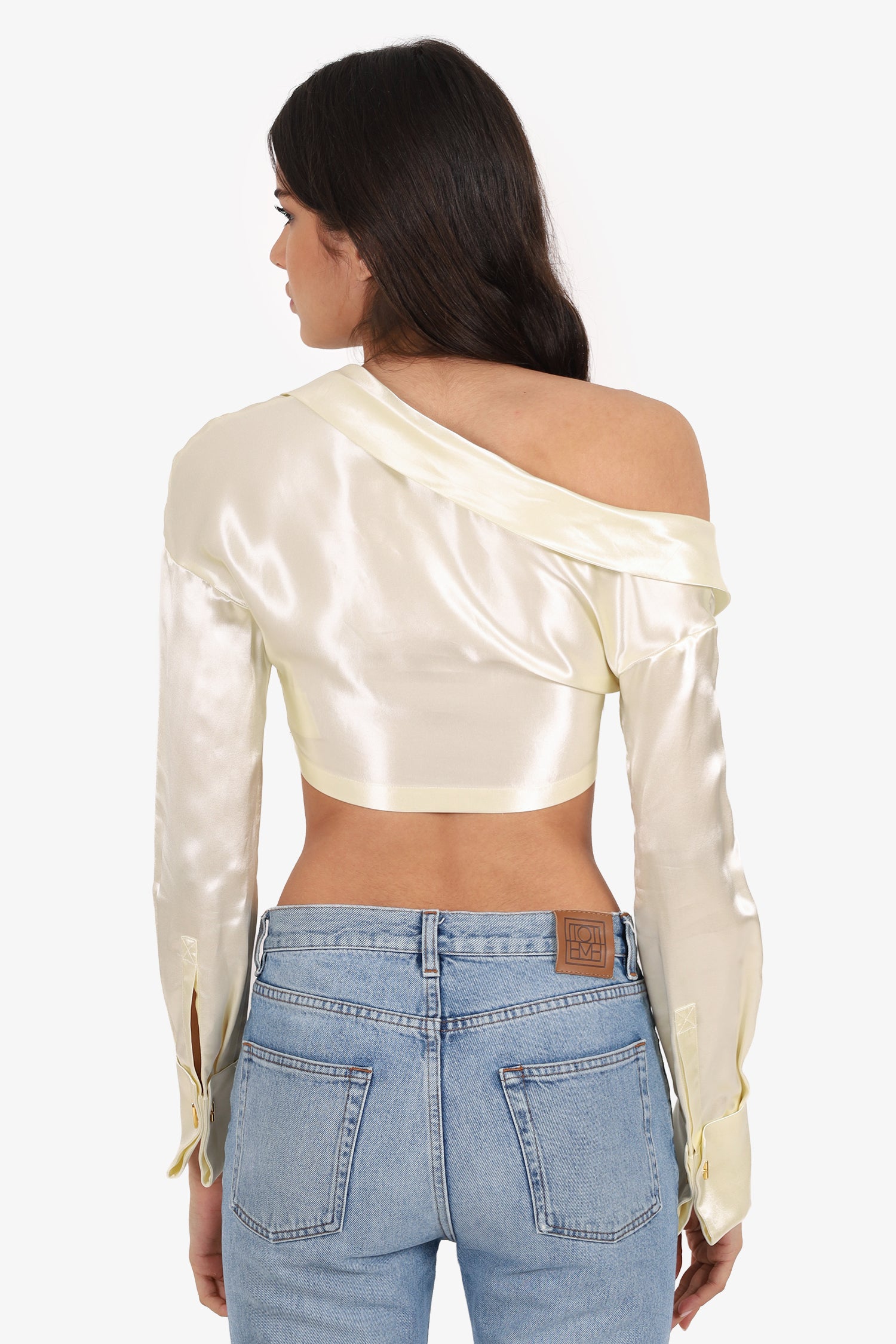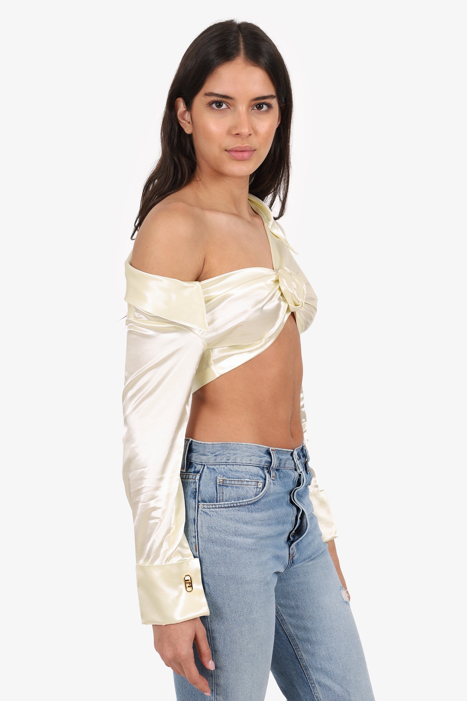 Refresh availabilityFendi White Silk Flower Front Long Sleeve Crop Top. Pull-on. Asymmetrical collared-neckline. Sleeve cuffs with cuff link closure. Gold-tone hardware. Tonal stitching.