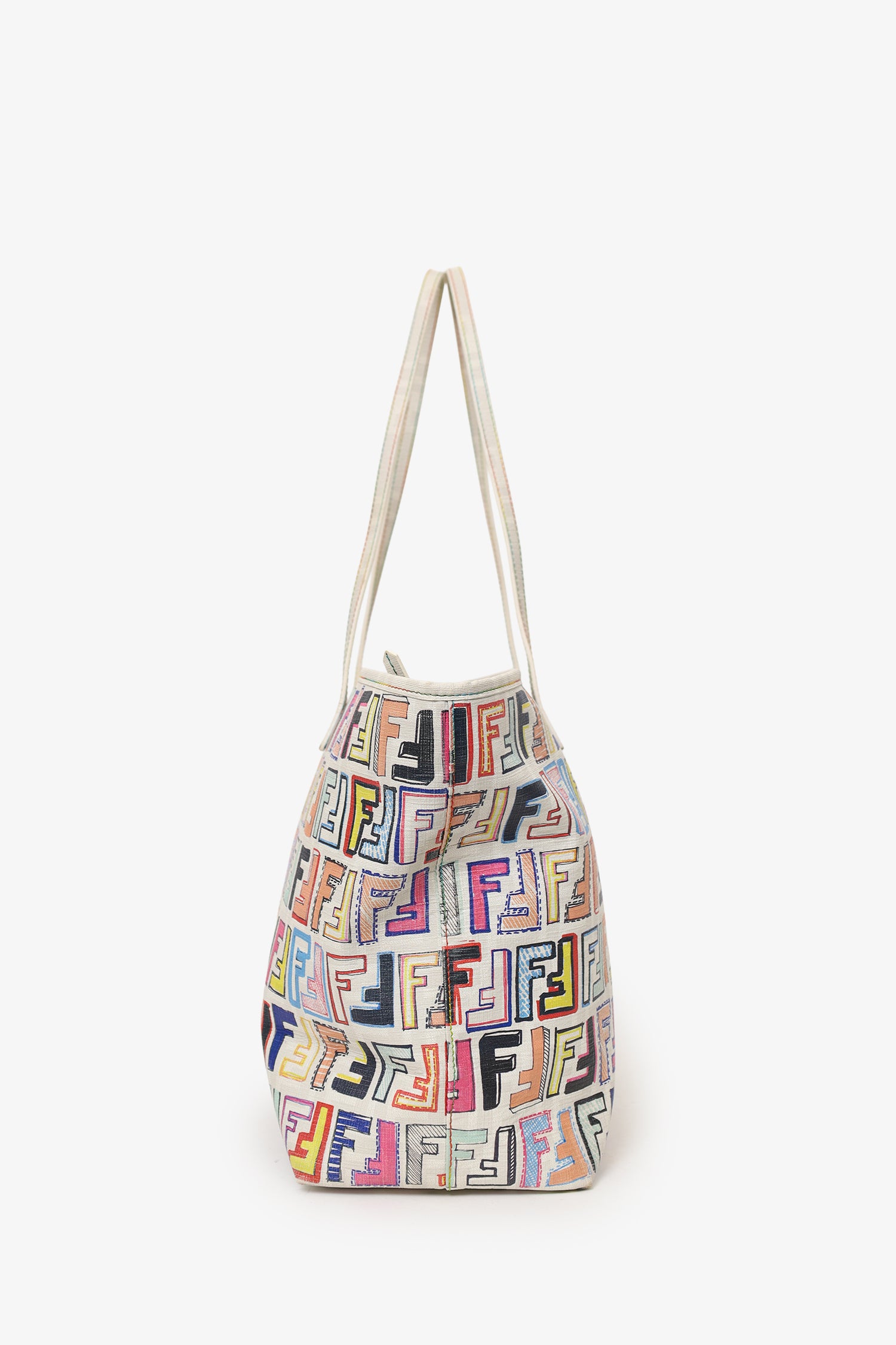 Refresh availabilityFendi White/Multicolour Zucca Spalmati Roll Tote. Top zip closure. Twin shoulder straps. Lined interior. 3 interior pockets; 2 slip and 1 zip. Gold-tone hardware. Tonal and contrast stitching.