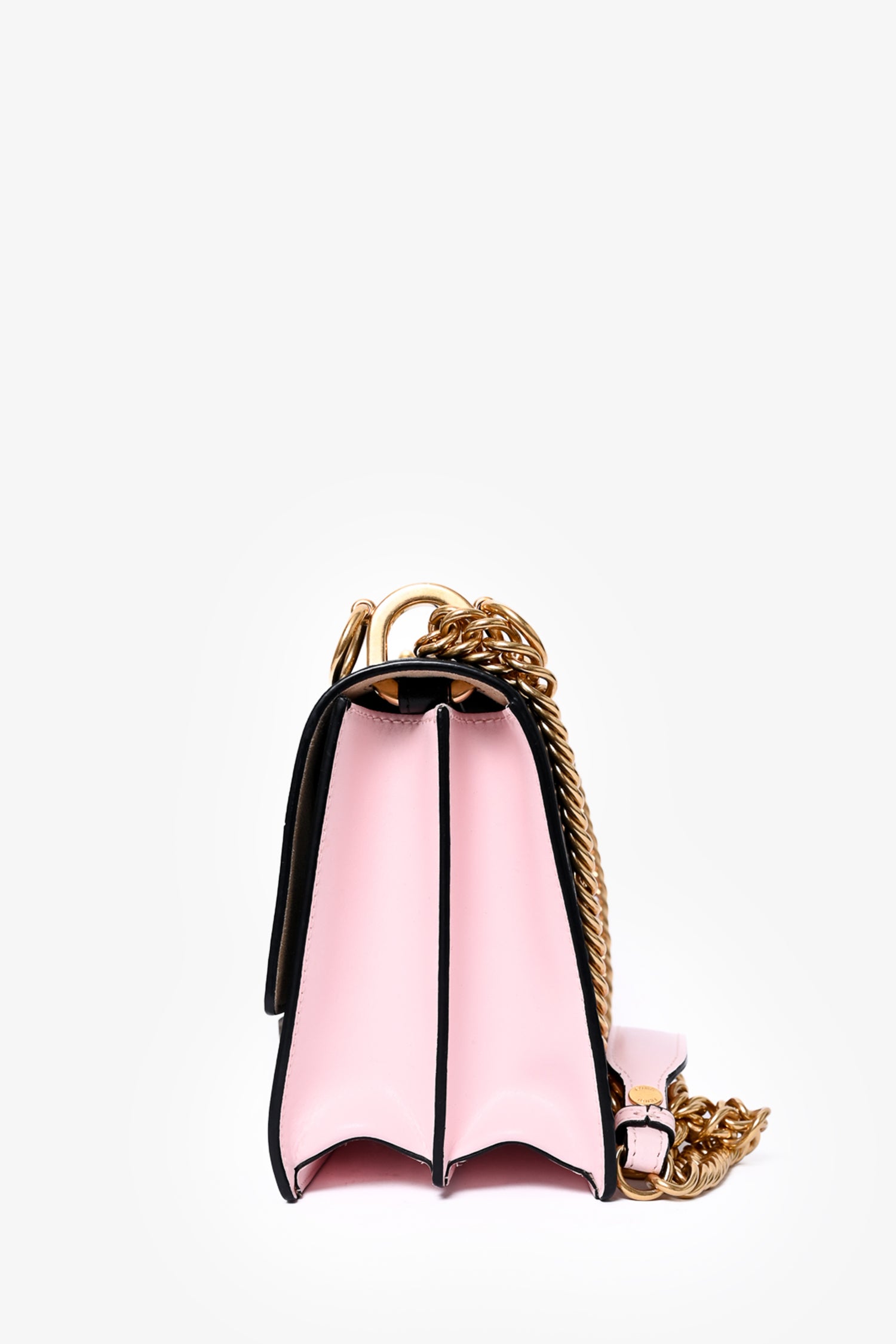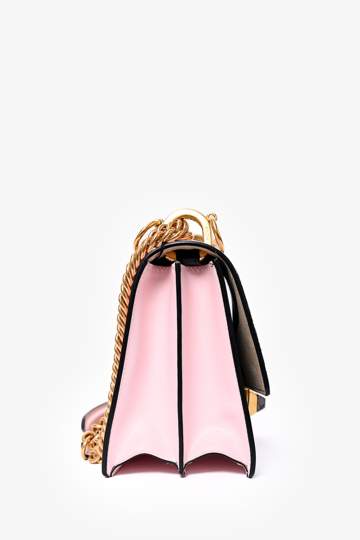 Refresh availabilityFendi x Fila Black/White Leather Mania Shoulder Bag. Contrast and tonal stitching. Chain-link shoulder strap with pink leather accent. Leather trimming. Pusj-lock pyramidal closure at centre. Suede lined interior. Dual compartments with interior wall slip. Embossed Fendi 'Zucca' throughout. Colour blocked detail. Accordion sides.