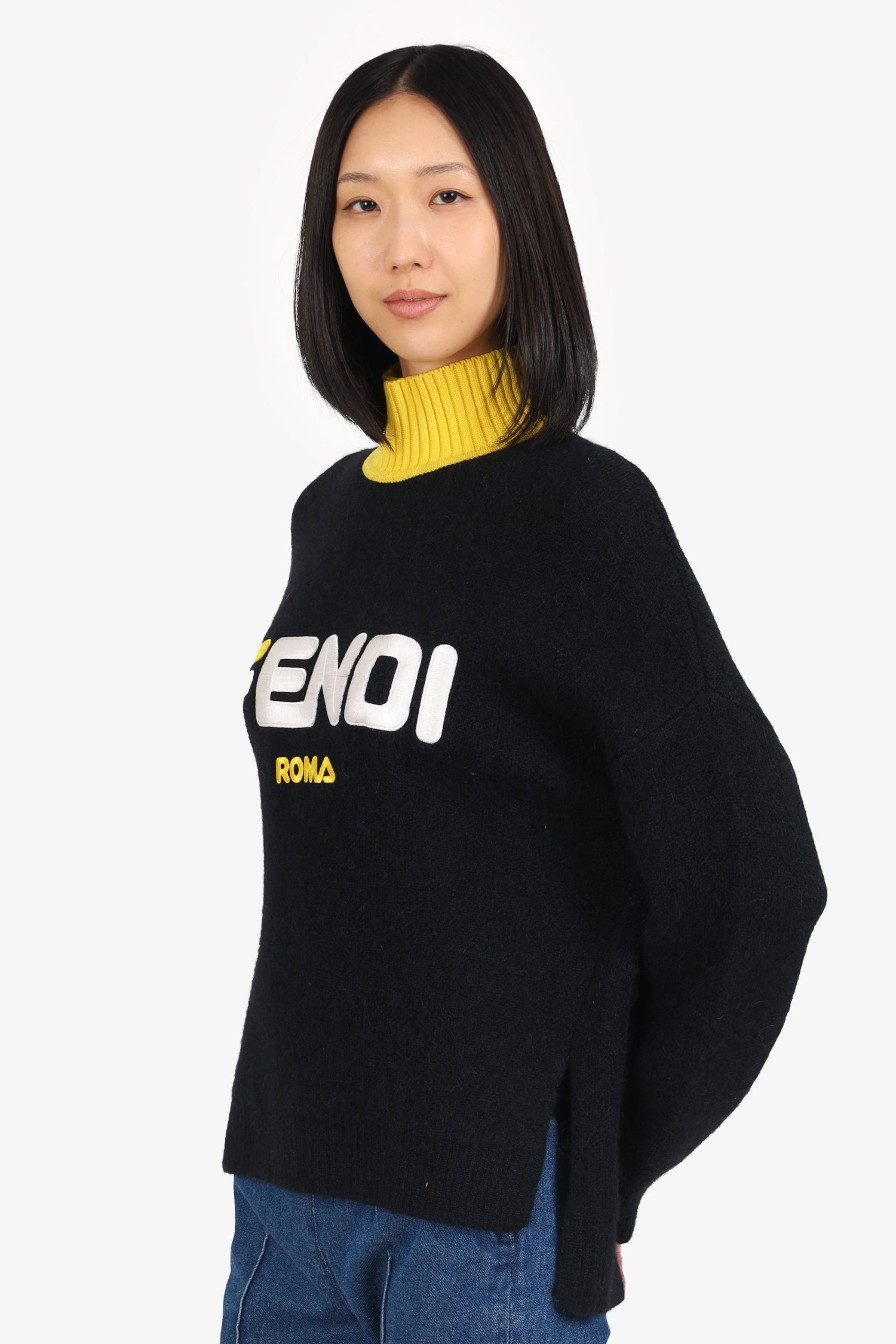 Refresh availabilityFendi X Fila Black/Yellow Mohair Sweater. Pull-on. Turtleneck. 2 side hem slits. Contrast and tonal stitching.