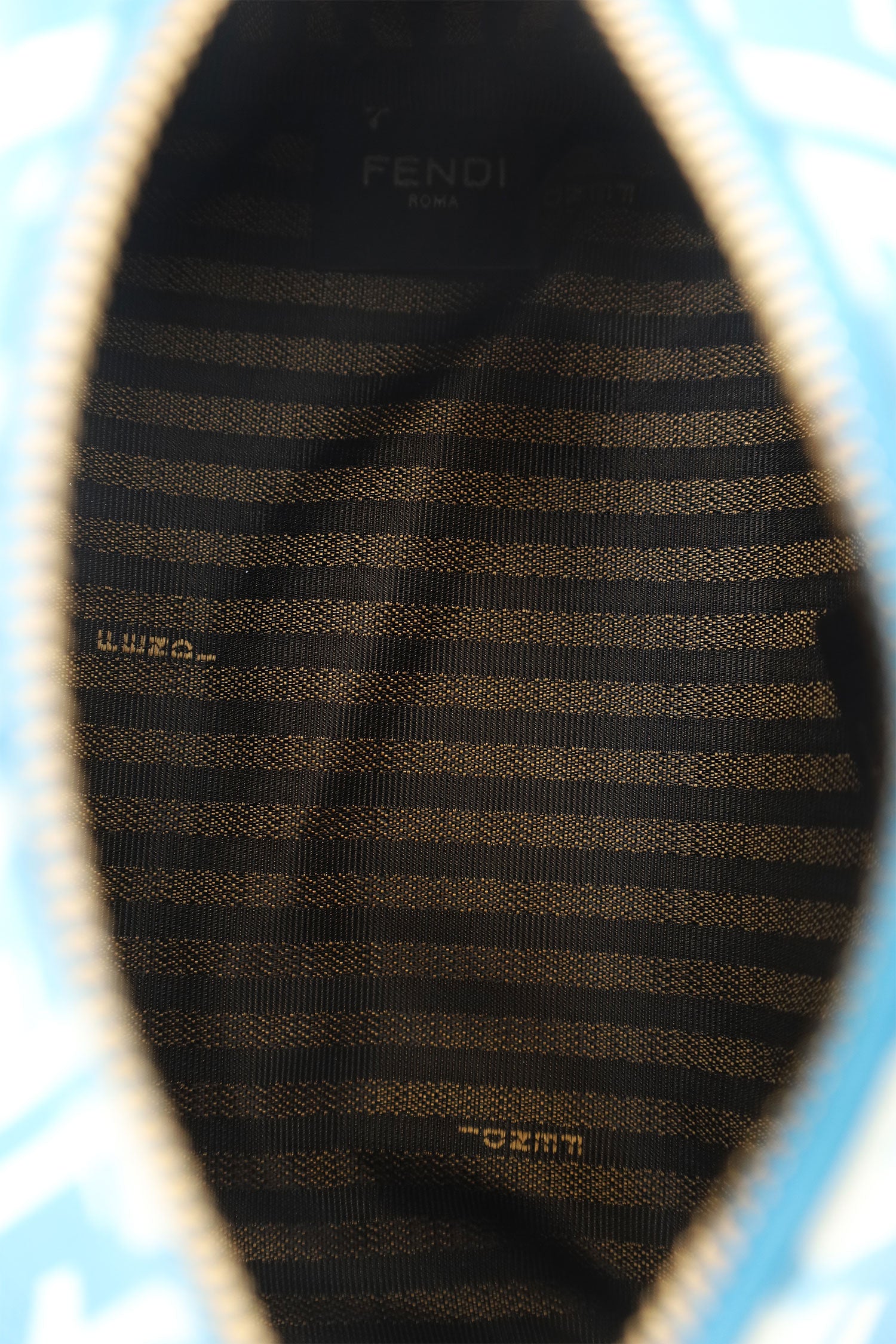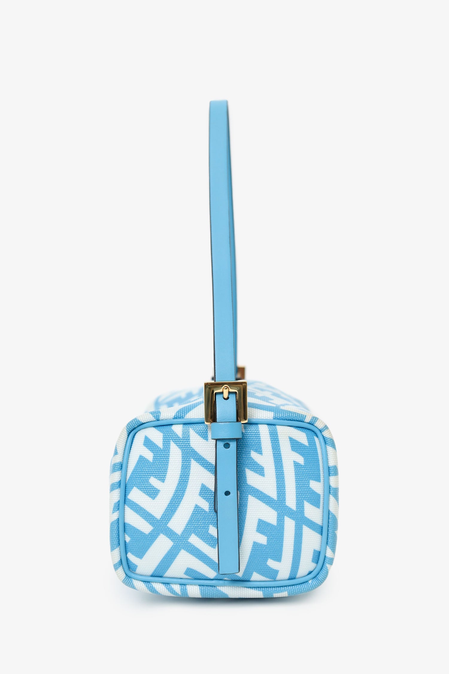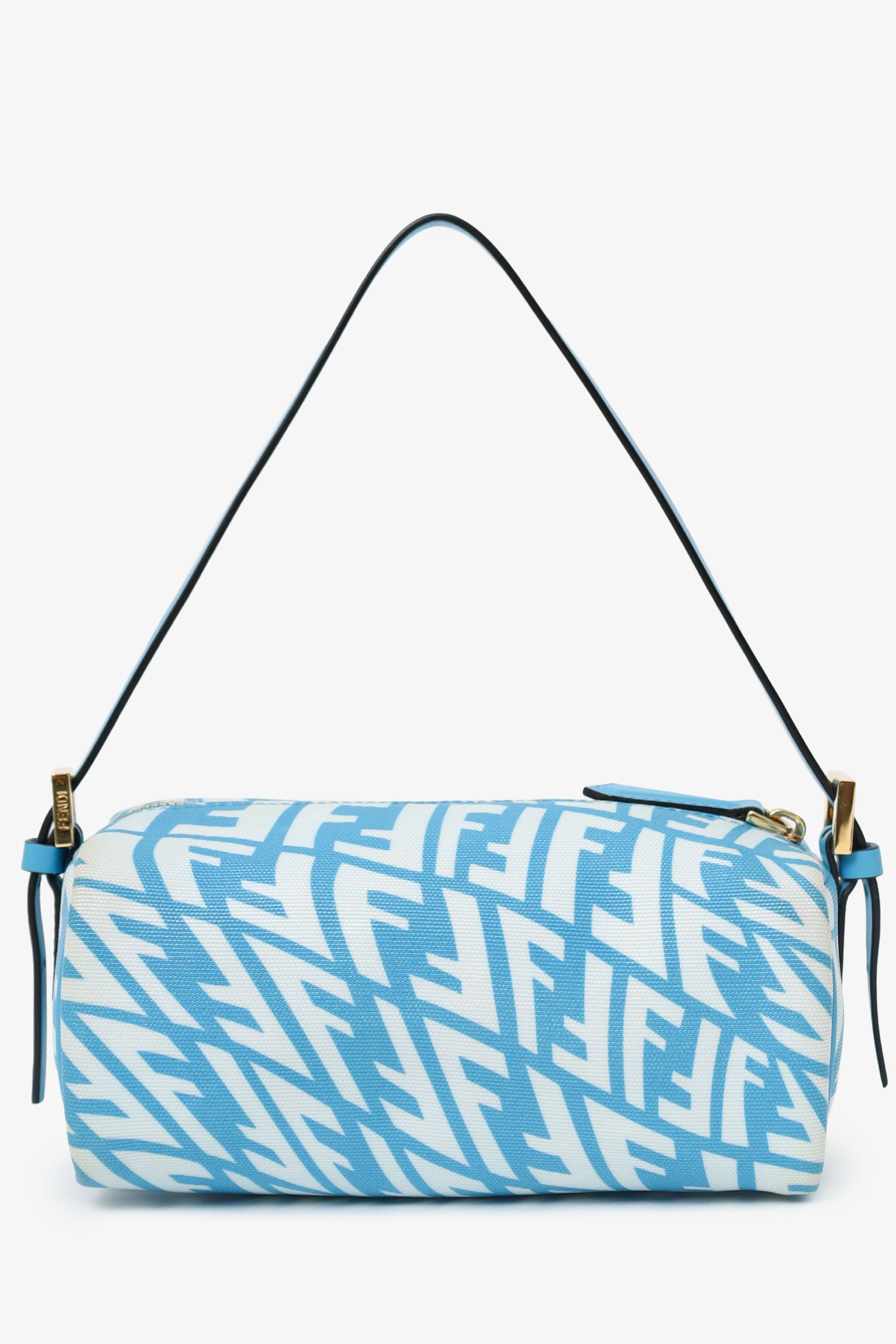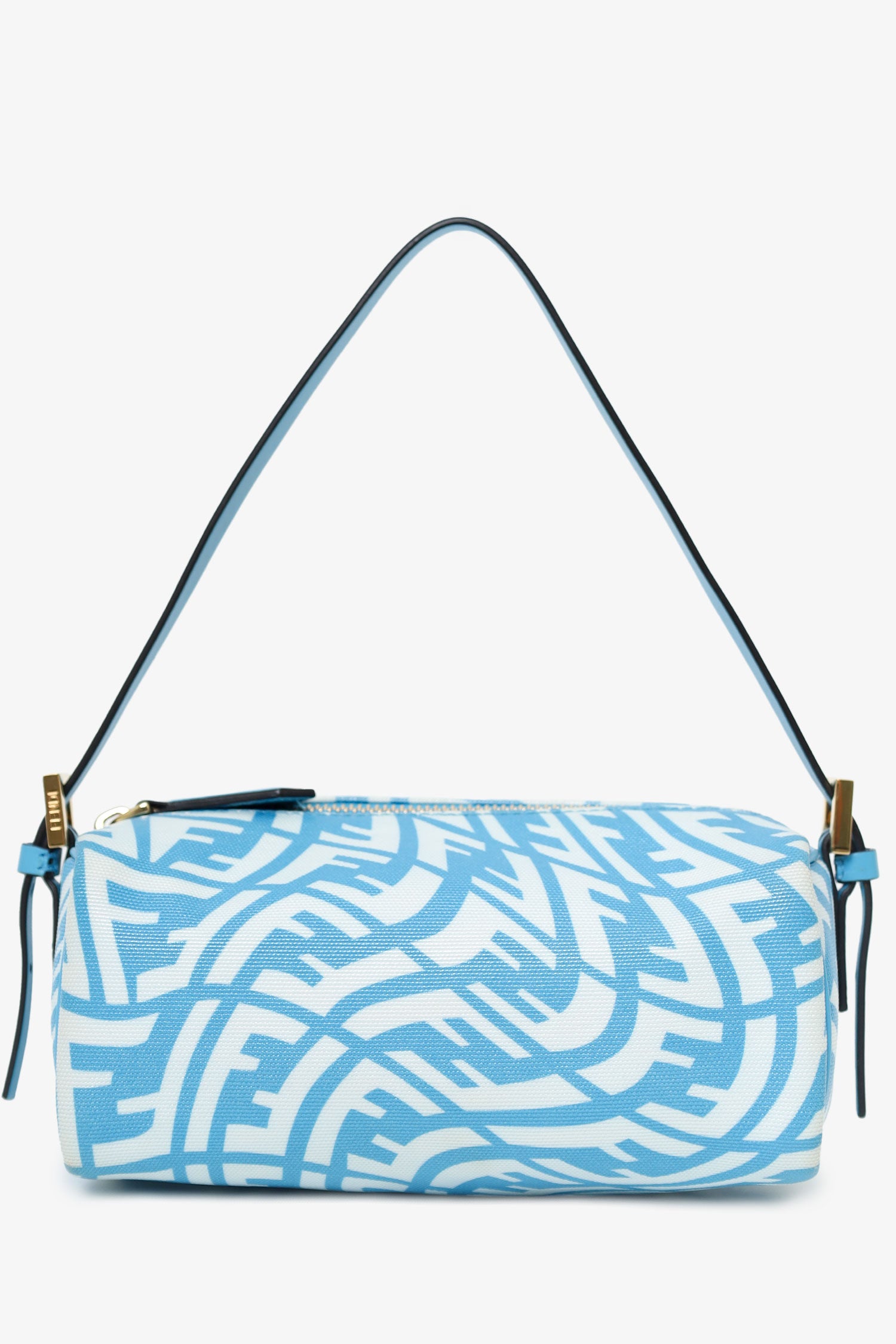 Refresh availabilityFendi x Sarah Coleman Blue and White Mini FF Vertigo Top Handle Bag. Top zip closure. Leather strap with adjustable buckle closure. Open lined interior. Gold-tone hardware. Tonal stitching.