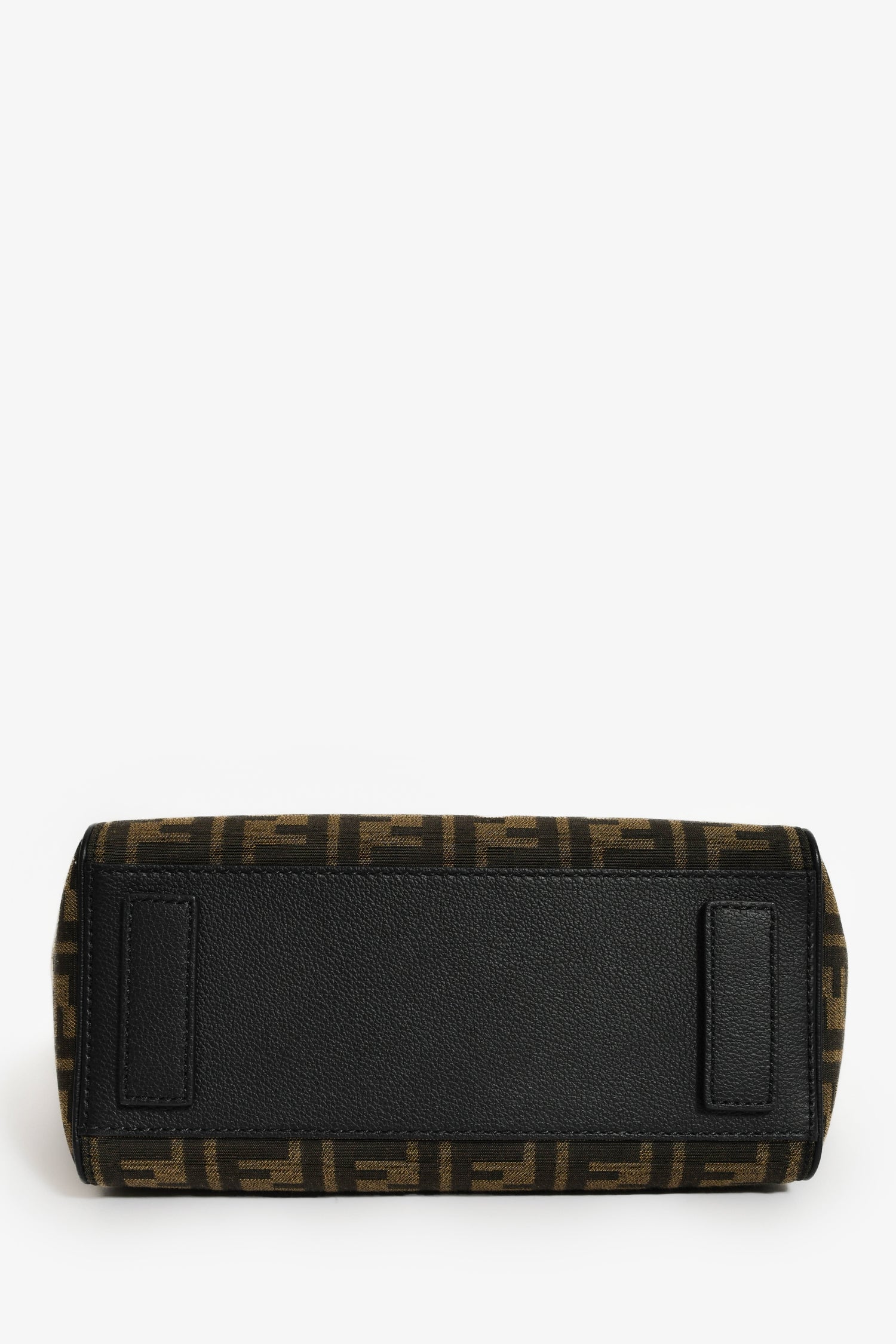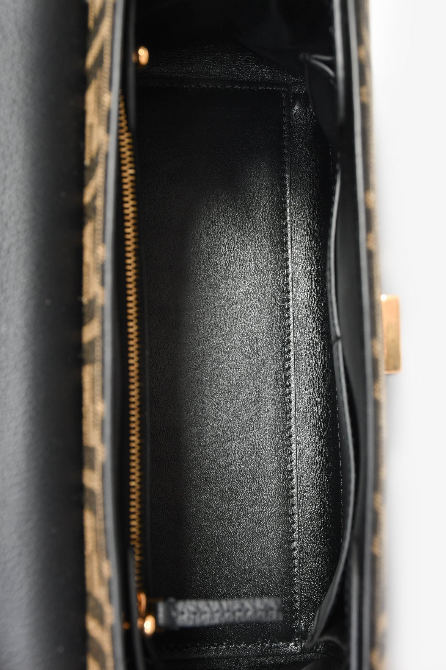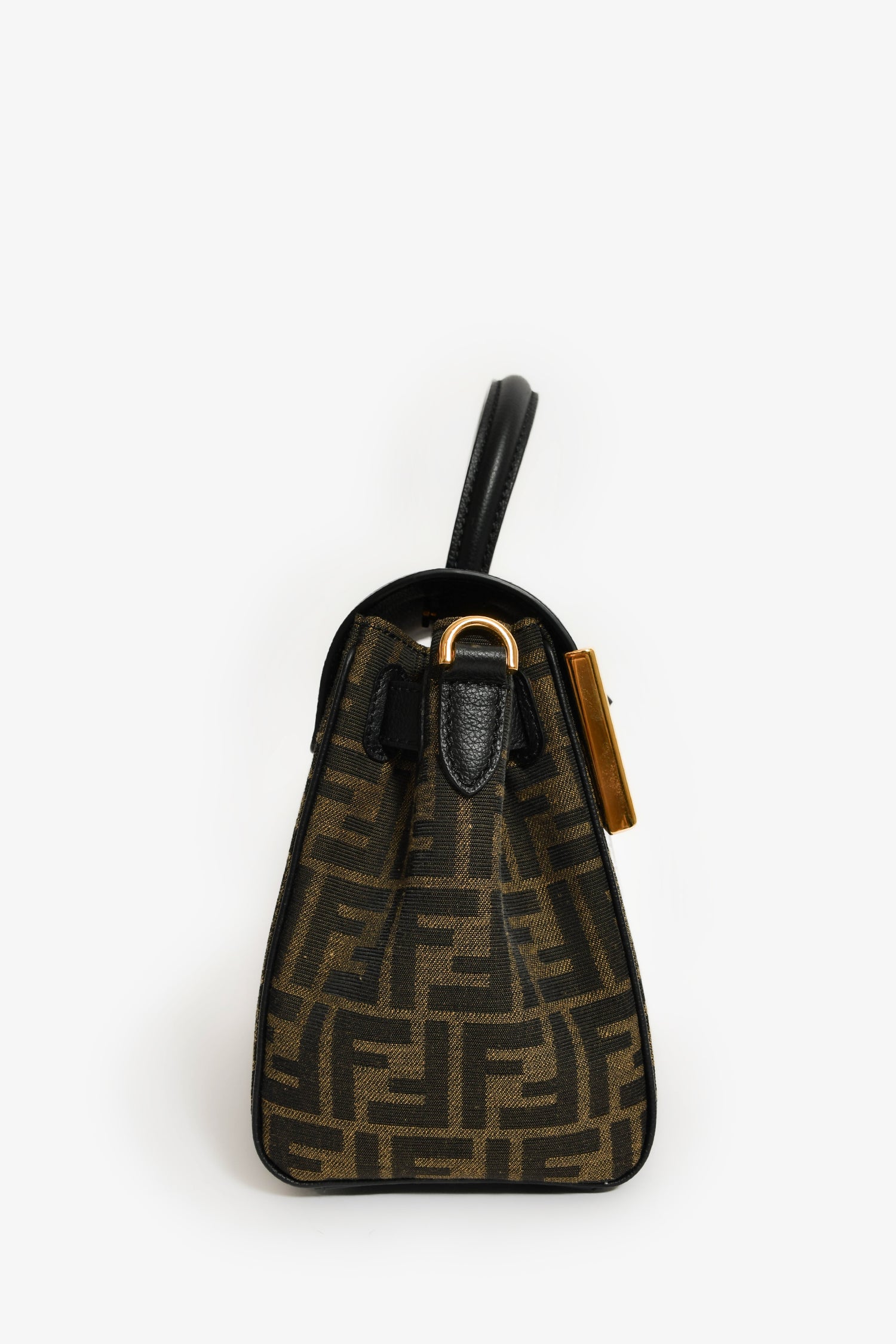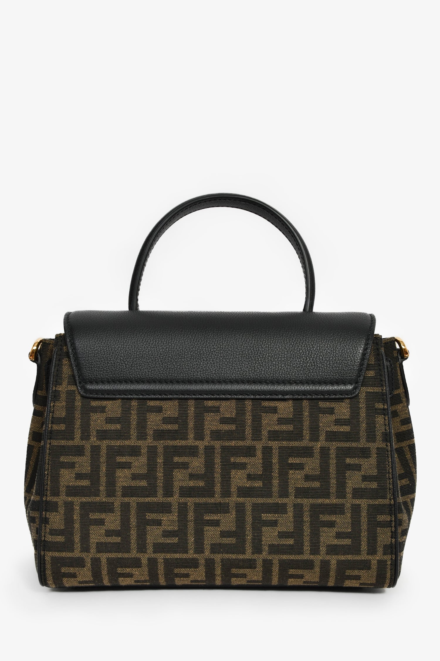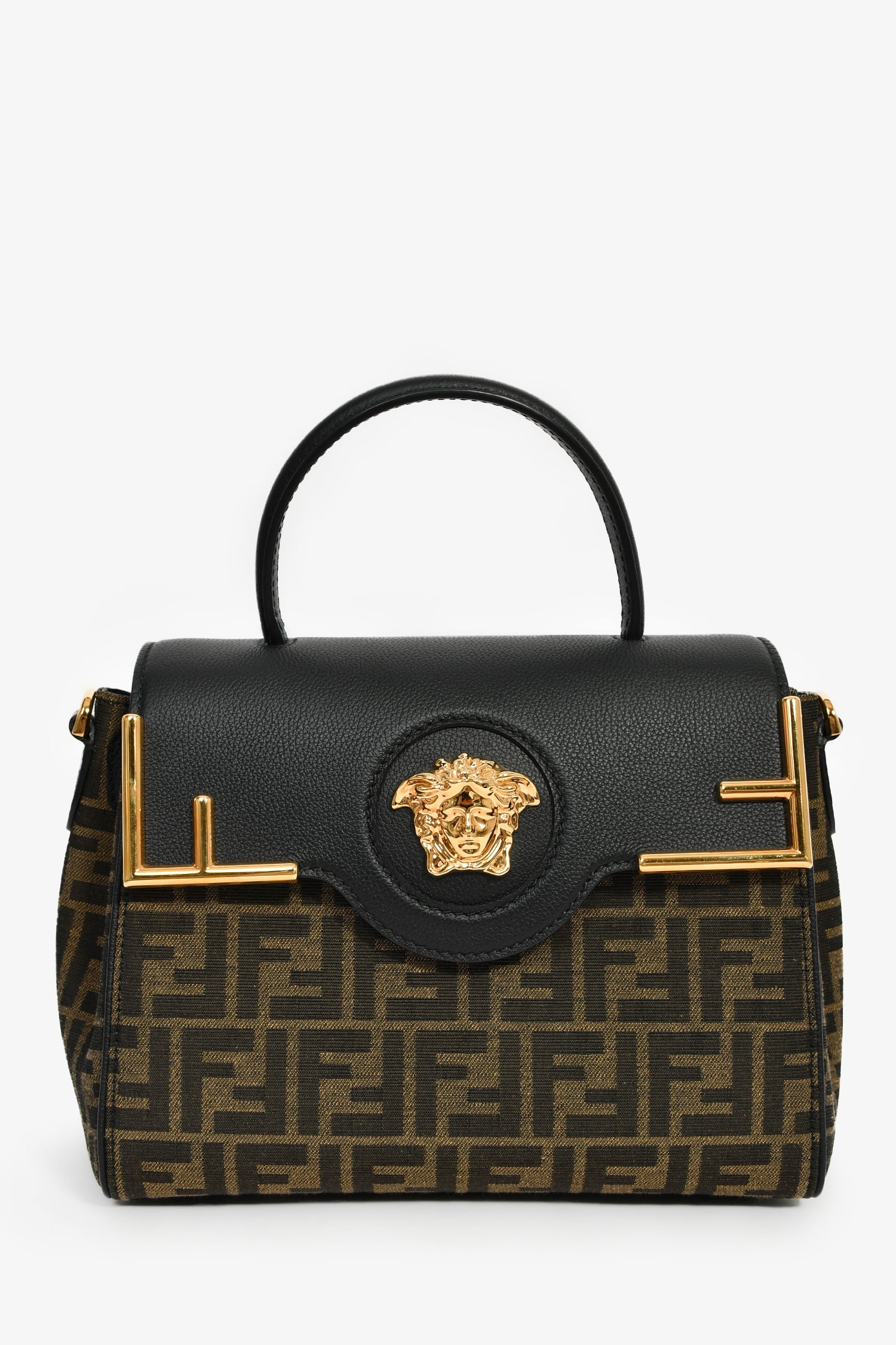 Refresh availabilityFendi x Versace Black Leather/Zucca Top Handle Bag. Fold-over flap with a snap closure. Single top handle, chain-link shoulder strap, and adjustable leather strap. Leather lined interior with 1 zip and 2 pockets. Gold-tone hardware. Tonal stitching.