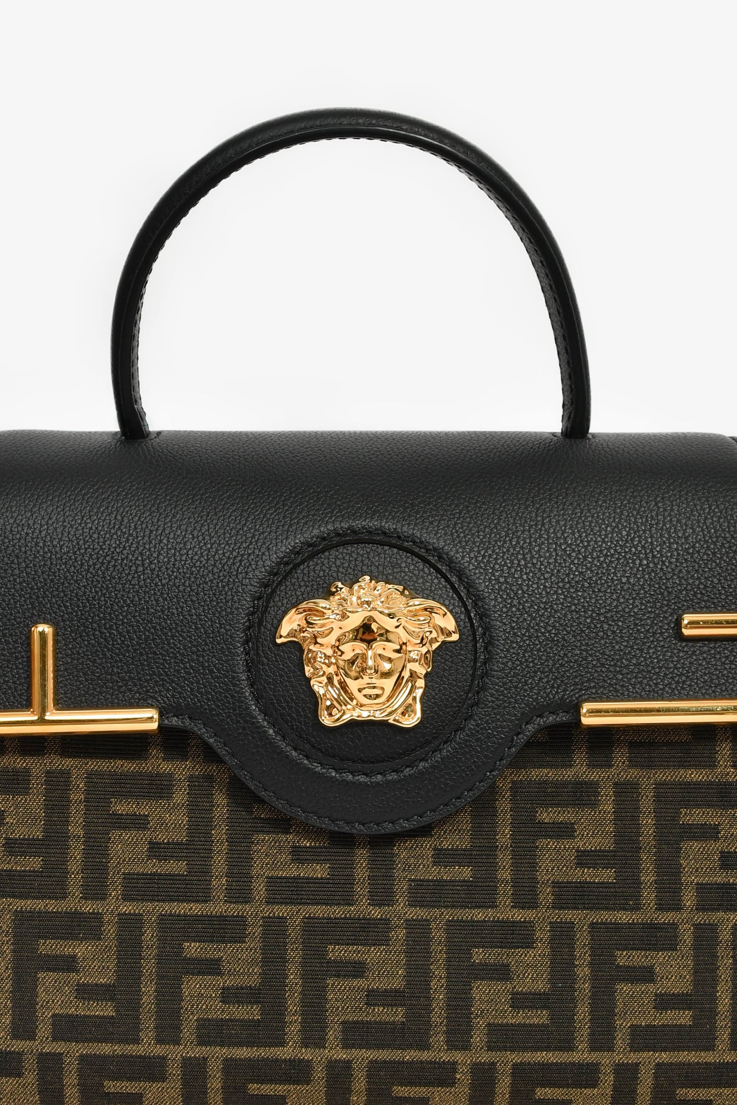 Fendi x Versace Black Leather/Zucca Top Handle Bag with Strap