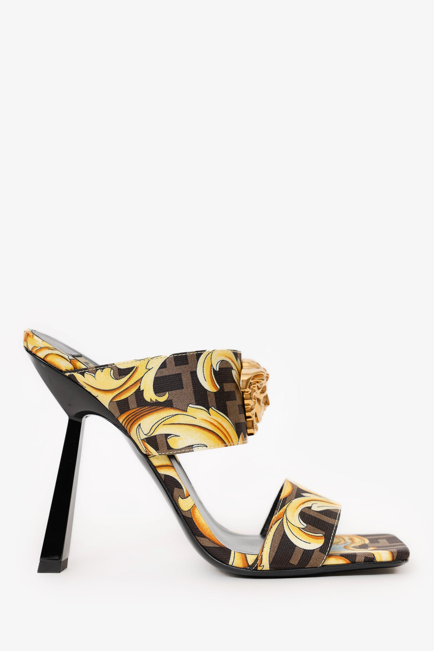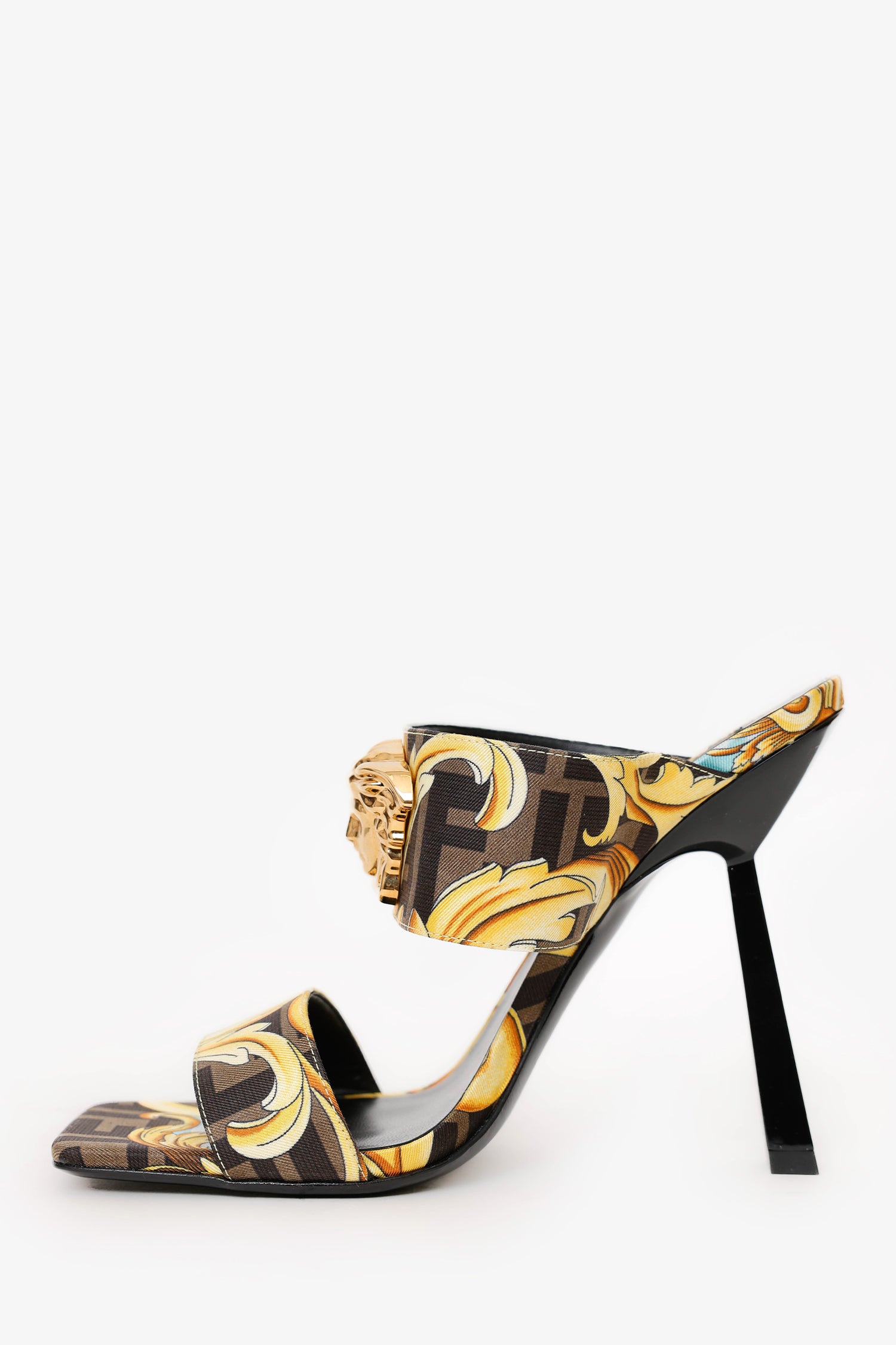 Refresh availabilityFendi X Versace Brown/Yellow Zuca Medusa Heels. Square toe. Leather-lined interior. Gold-tone hardware. Tonal stitching.