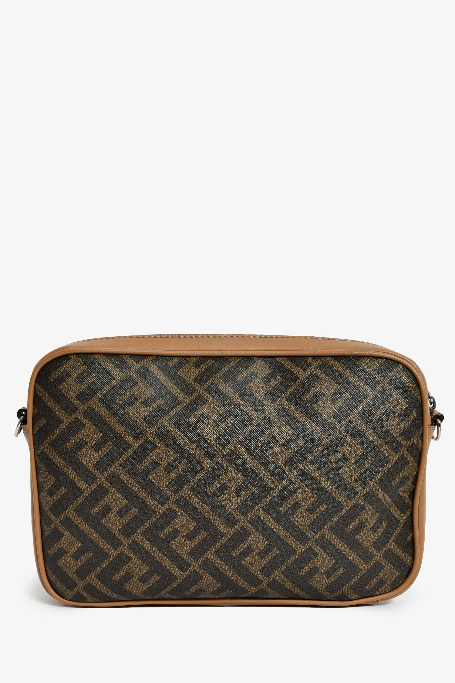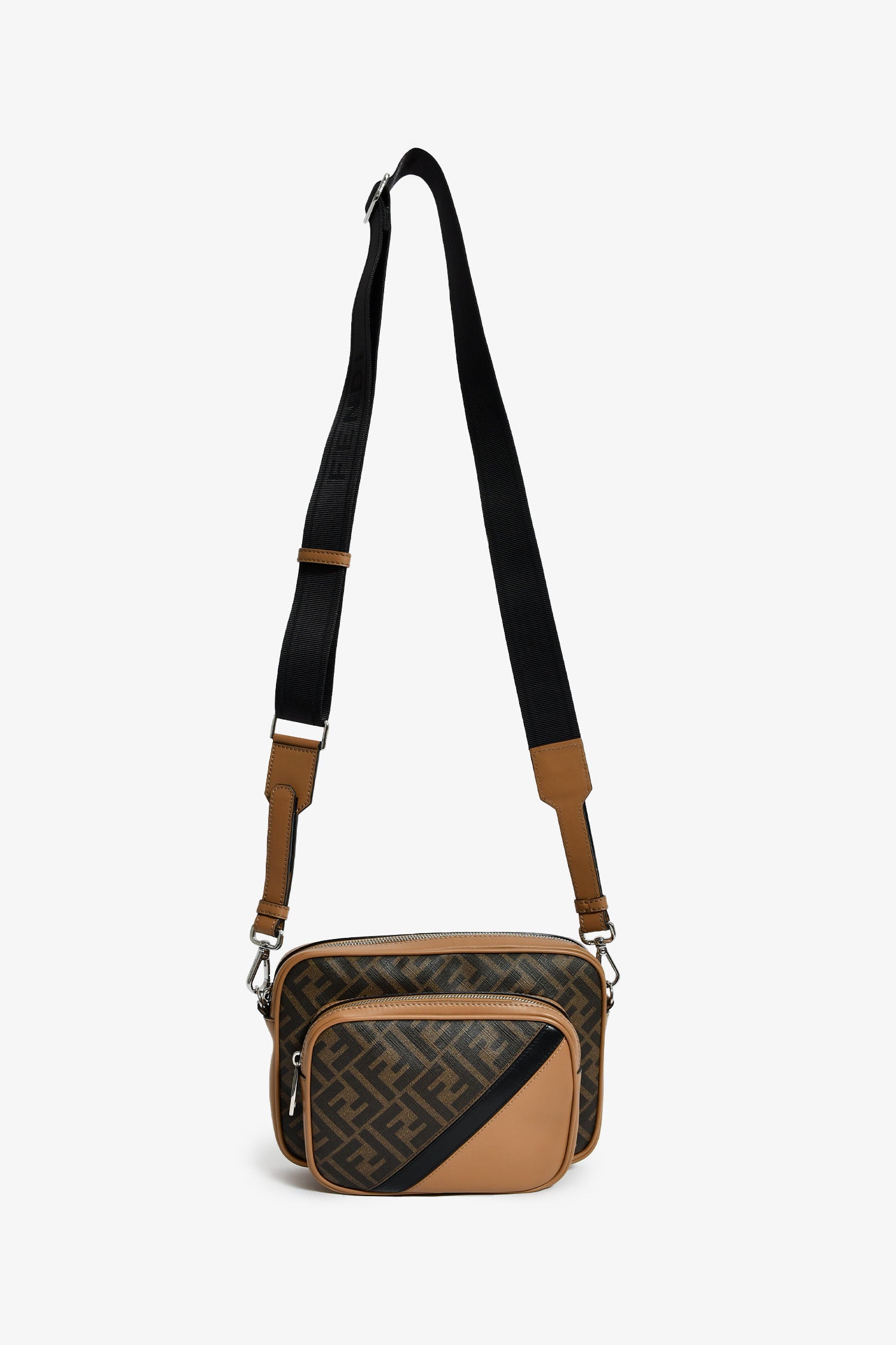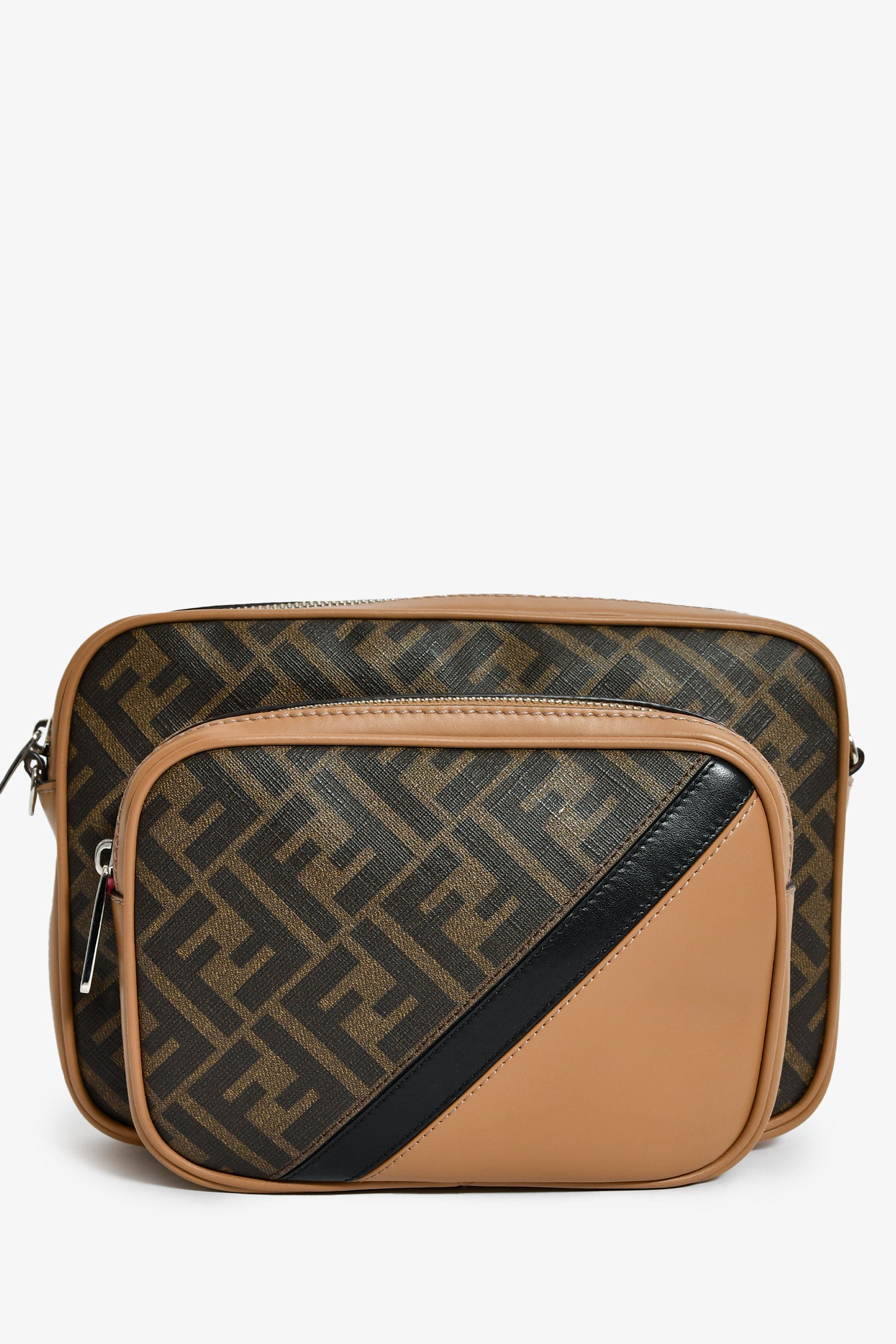 Refresh availabilityFendi Zucca Canvas Diagonal Duo Camera Case. 2 top zip closures. 1 exterior pouch. Webbed and leather crossbody strap. Lined interior. Silver-tone hardware. Tonal stitching.