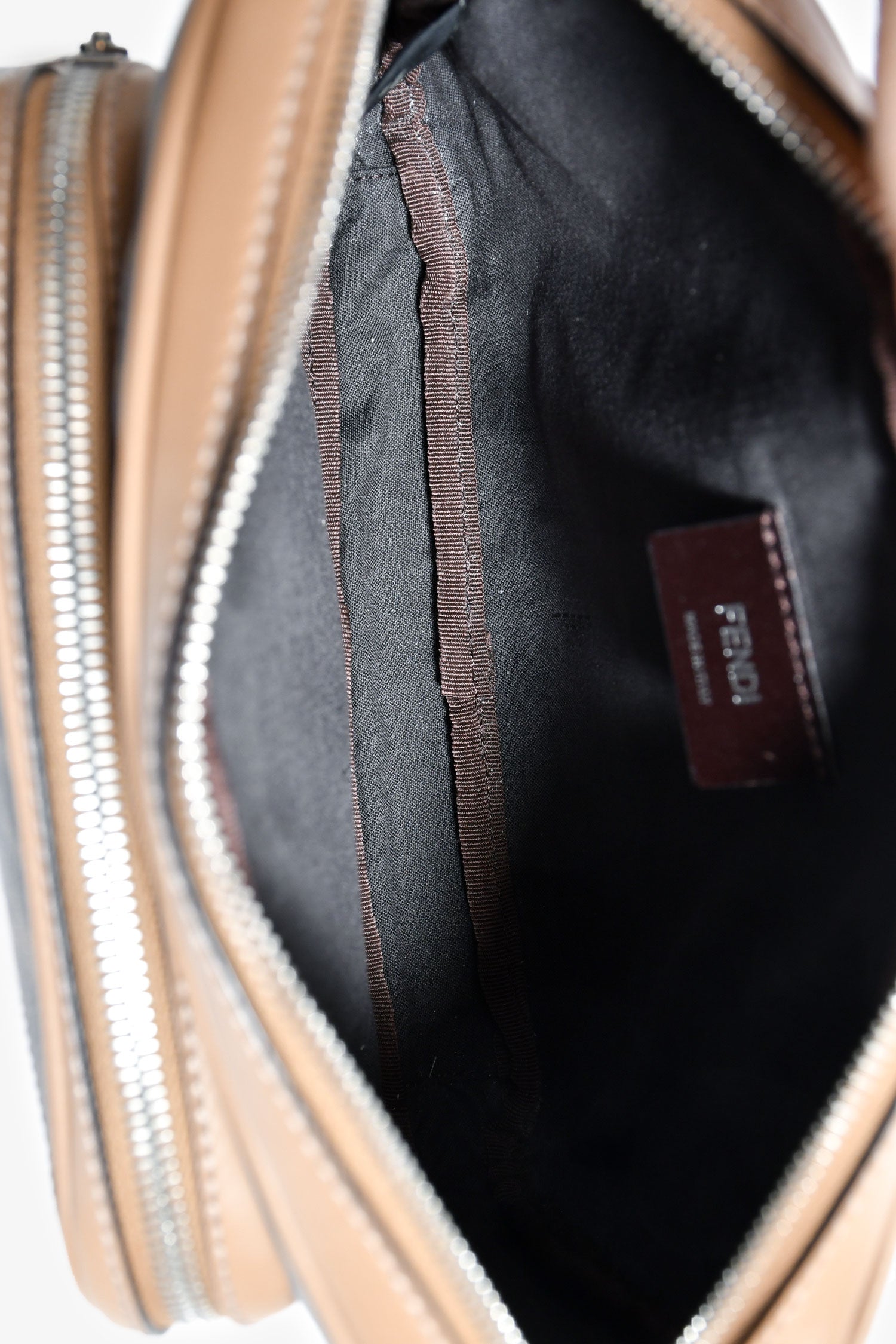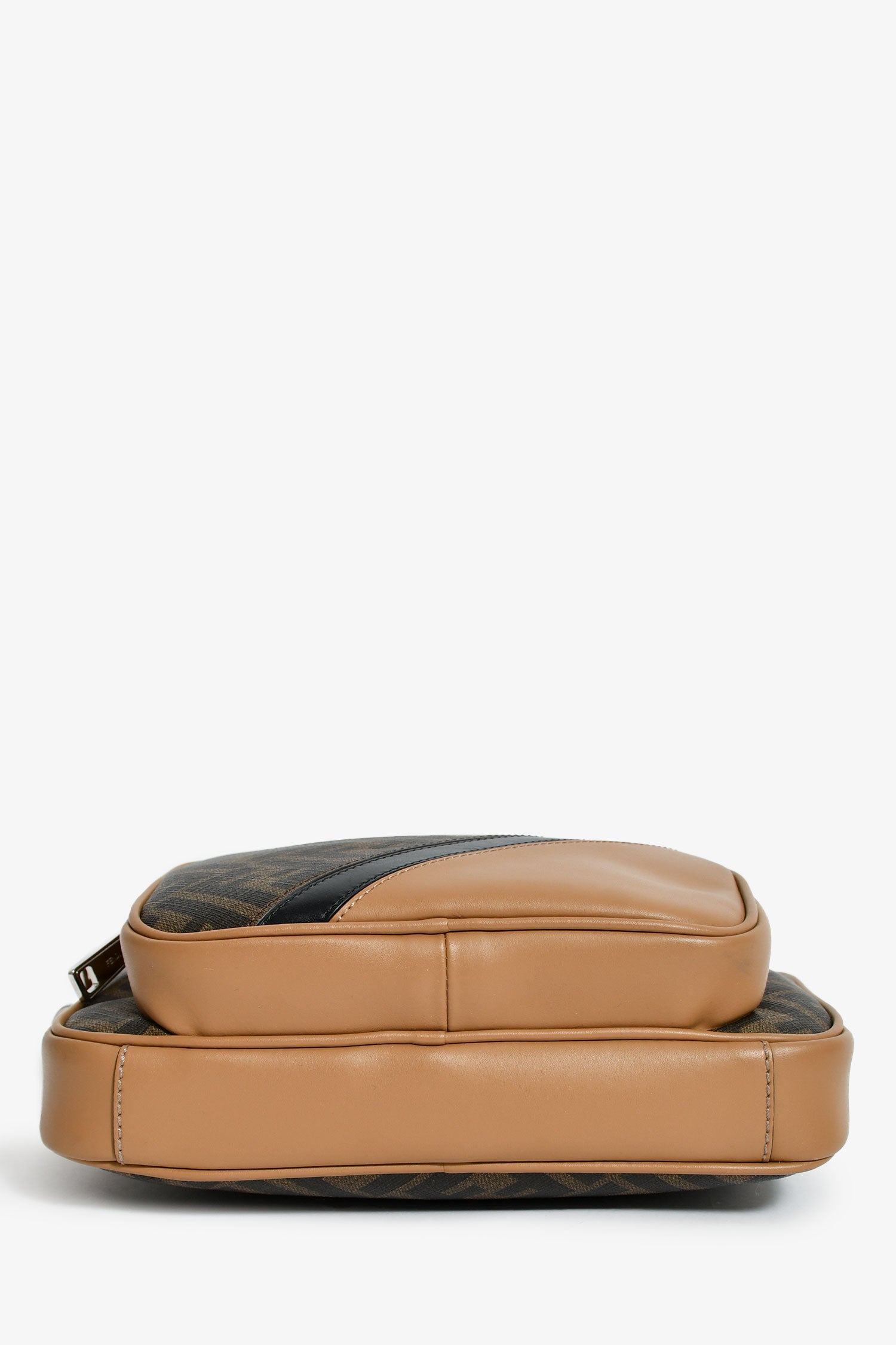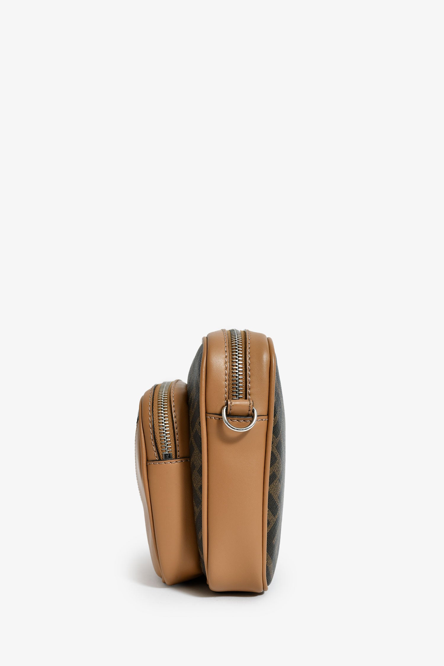 Refresh availabilityFendi Zucca Canvas Diagonal Duo Camera Case. 2 top zip closures. 1 exterior pouch. Webbed and leather crossbody strap. Lined interior. Silver-tone hardware. Tonal stitching.