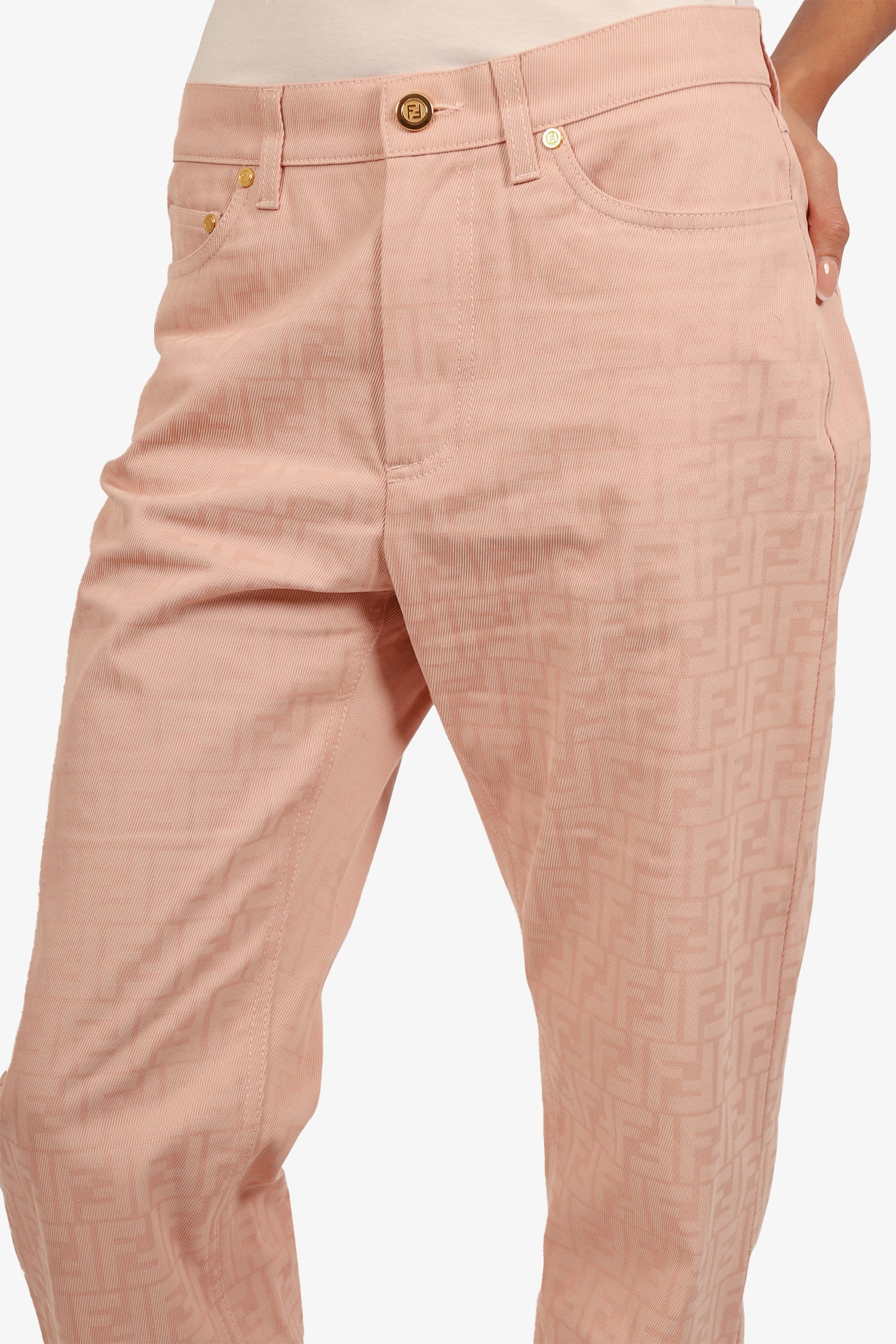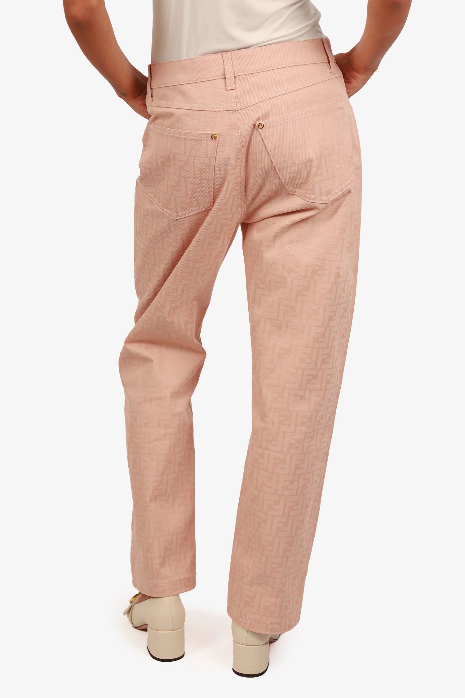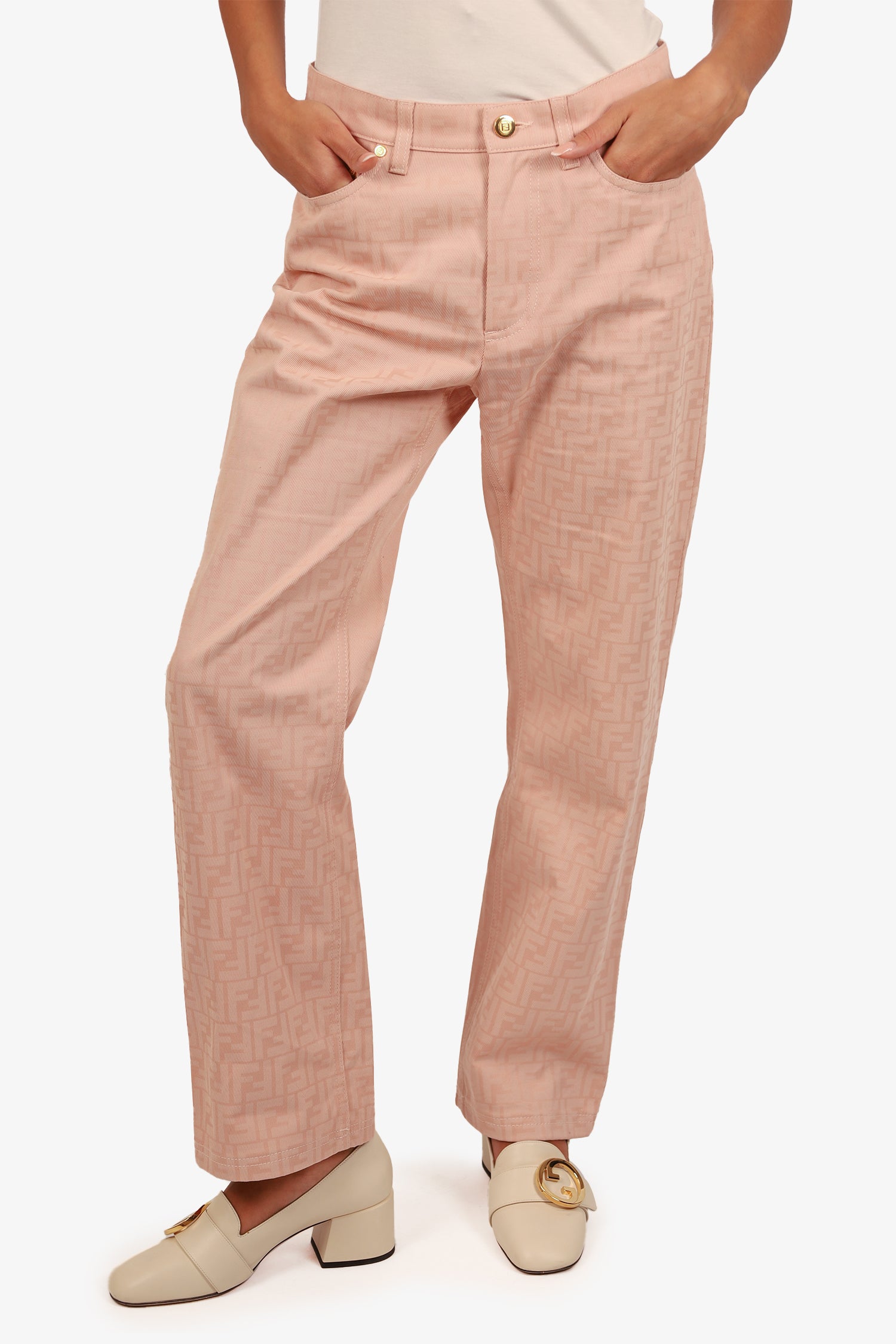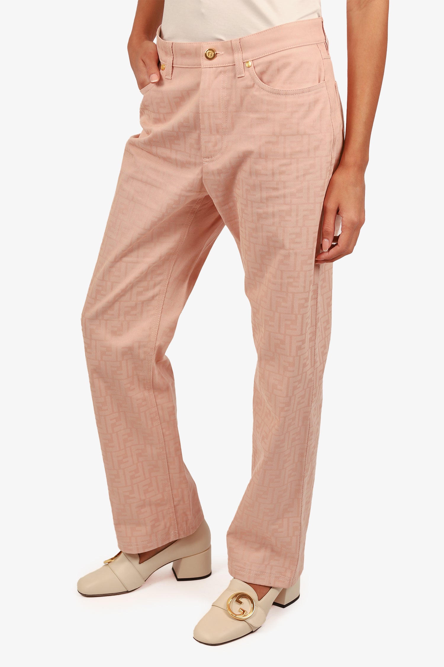 Refresh availabilityFendi Zucca Print Straight Leg Pants. Front zip with button closure. Waistband belt loops. 5 exterior pockets; 2 front side slip, single front mini compartment, 2 rear slip. Gold-tone hardware. Tonal stitching.