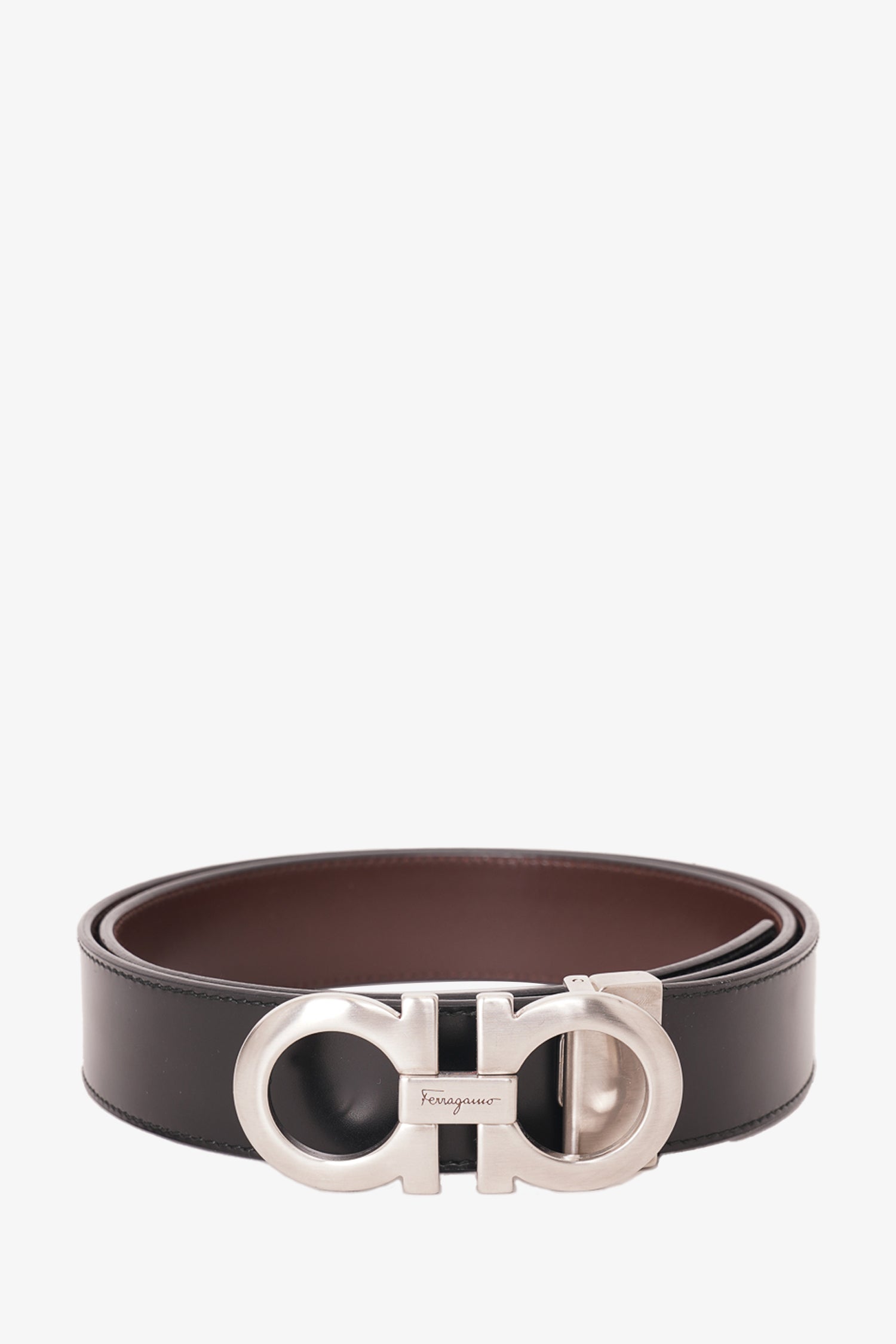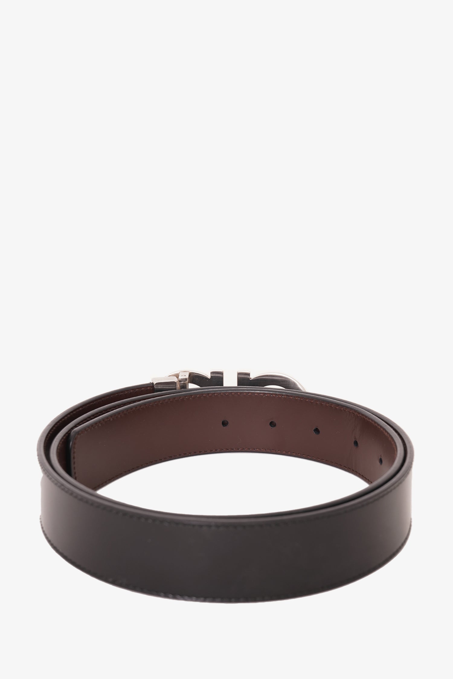 Refresh availabilityFerragamo Black/Brown Reversible Leather Silver Gancini Buckle Belt. Buckle closure. Tonal stitching.