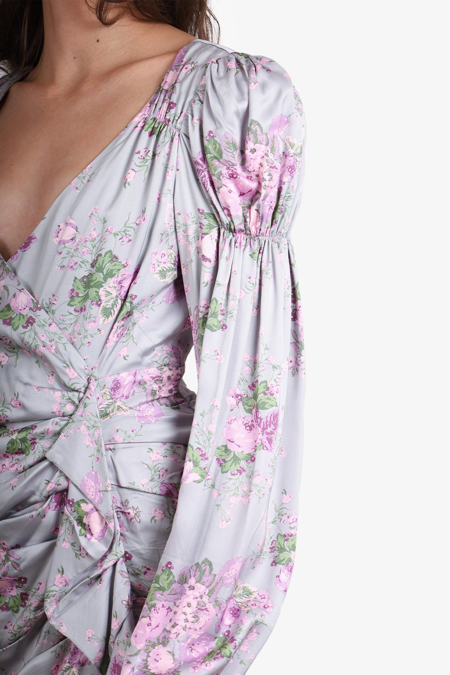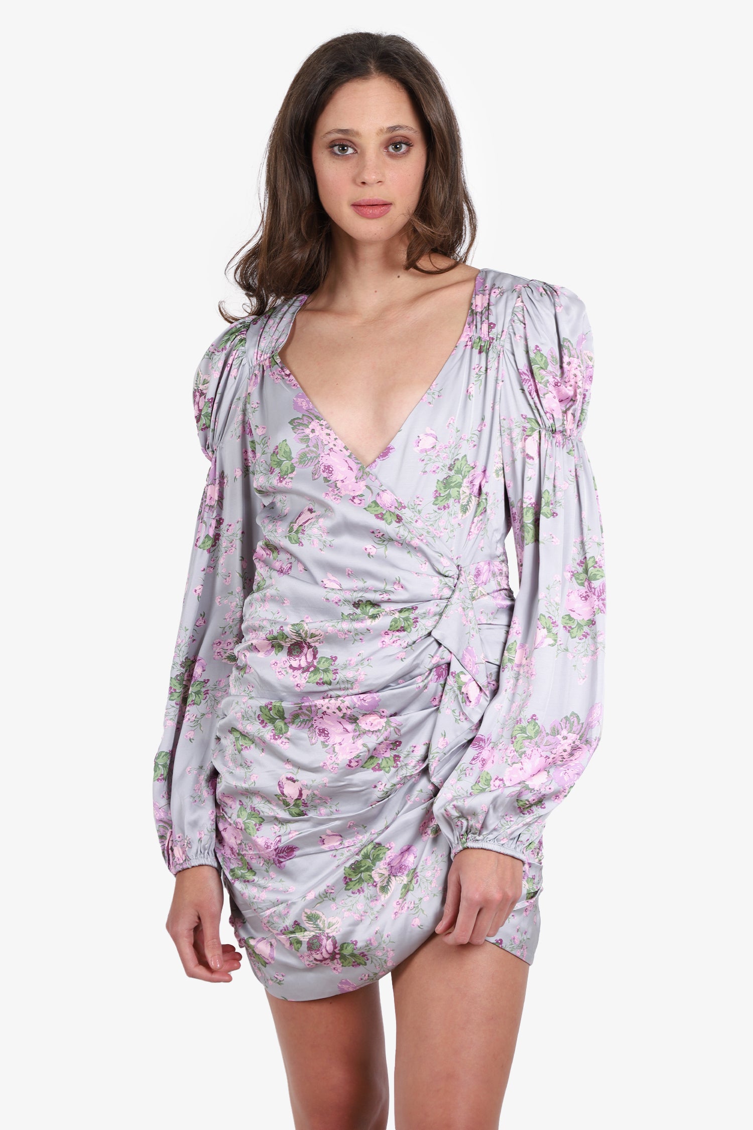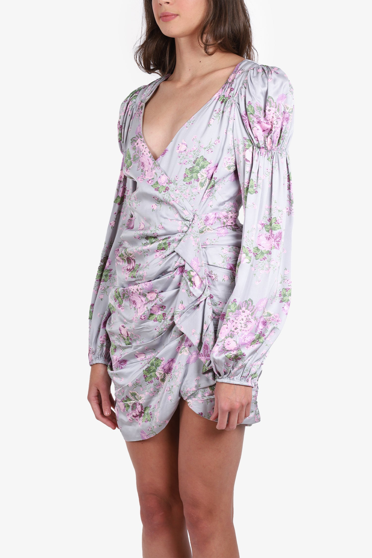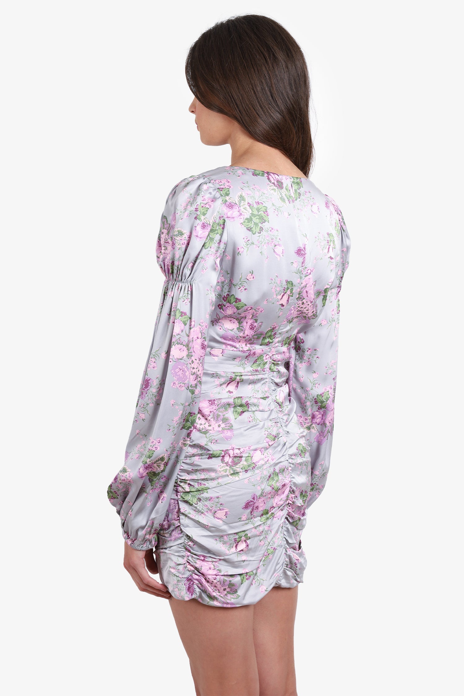 Refresh availabilityFor Love & Lemons Jardin Floral Mini Dress. Plunging neckline. Back zip-up and clip closure. Puffed shoulder with bishop sleeve. Ruched detailing. Interior lining. Tonal stitching.