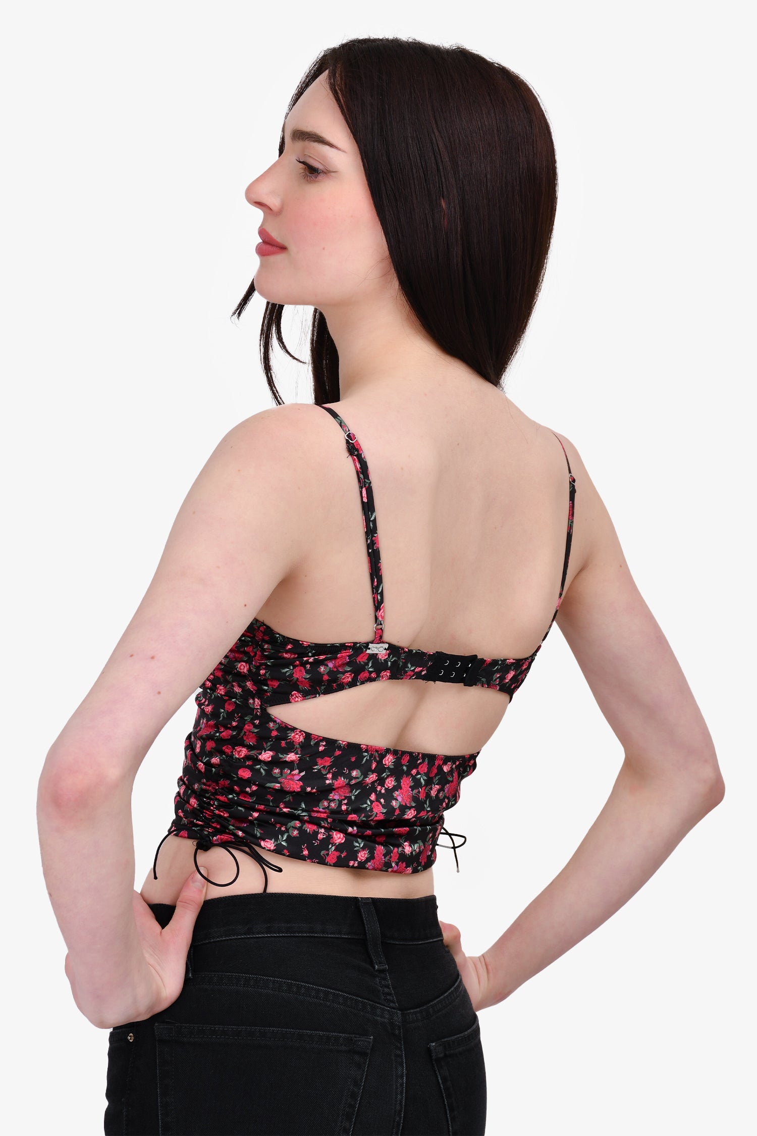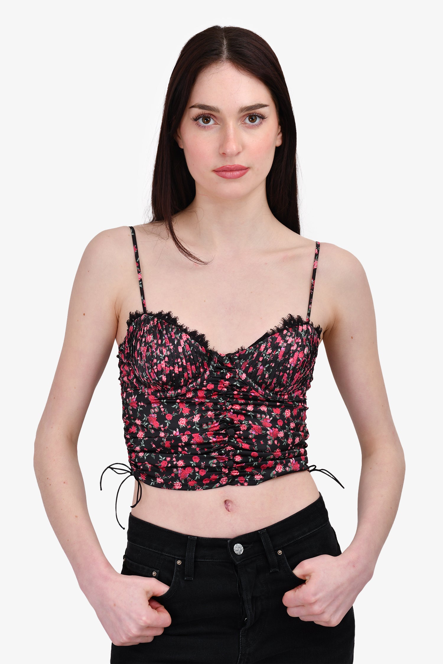 Refresh availabilityFor Love & Lemons X VS Black/Pink Rose Satin Bustier Top. Rear hook closure. Adjustable straps. Tonal stitching.