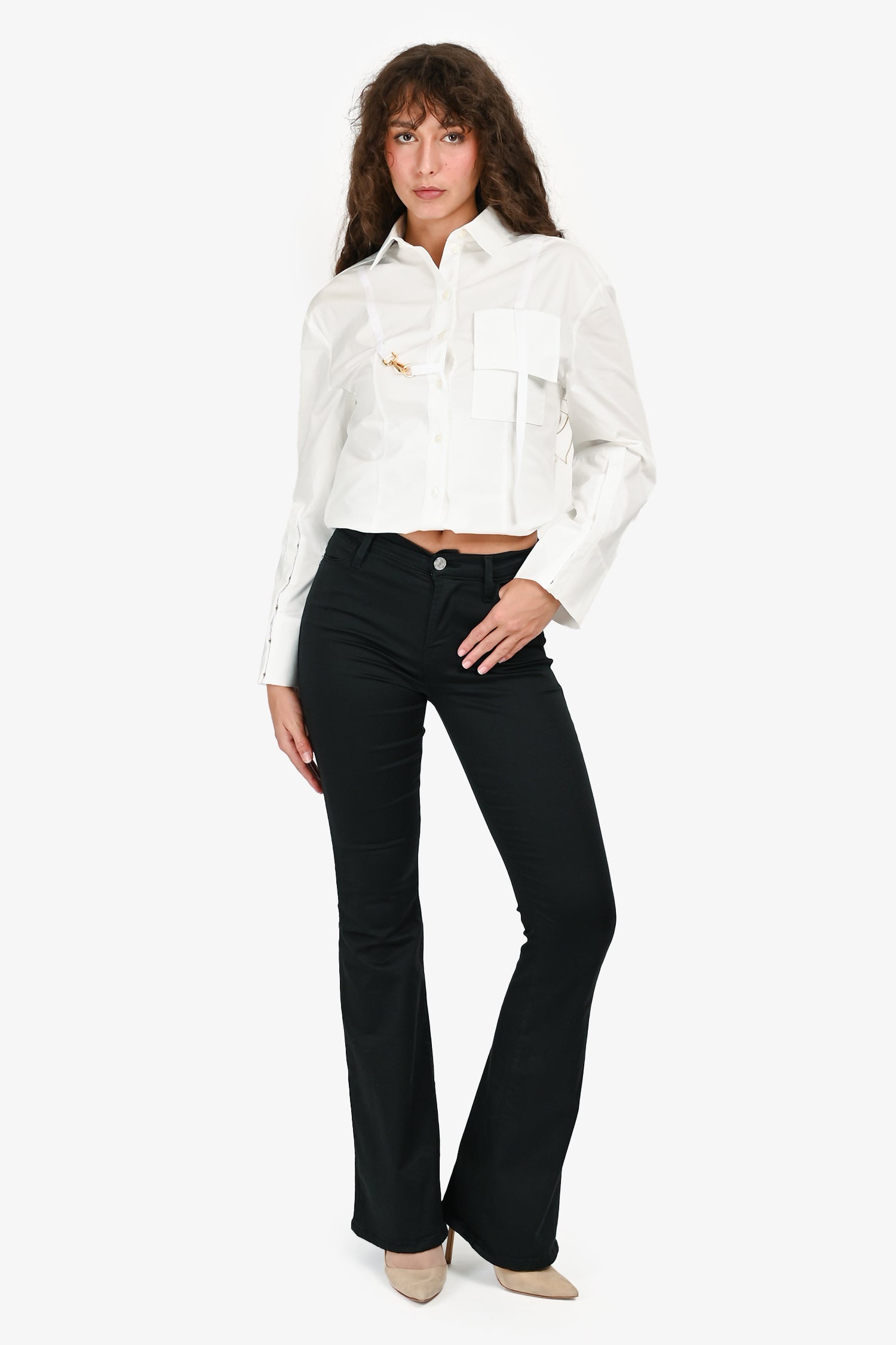 Refresh availabilityFrame Black Cotton 'Le High Flare' Bootcut Pants. Pull-on. Waistband belt loops. Front zip and button closure. 5 exterior pockets; 2 side slip and 1 mini compartment, 2 rear slip. Silver-tone hardware. Tonal stitching.