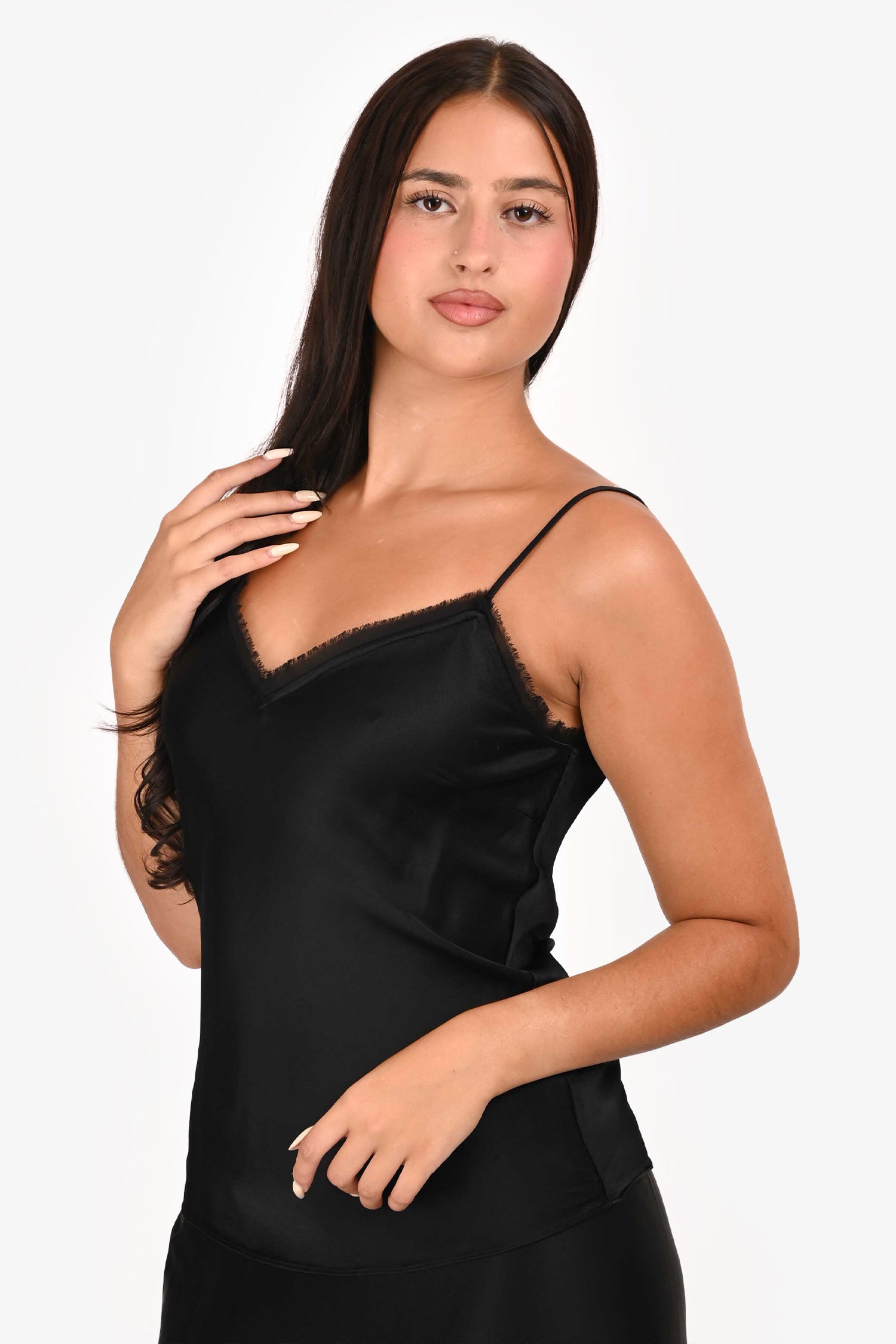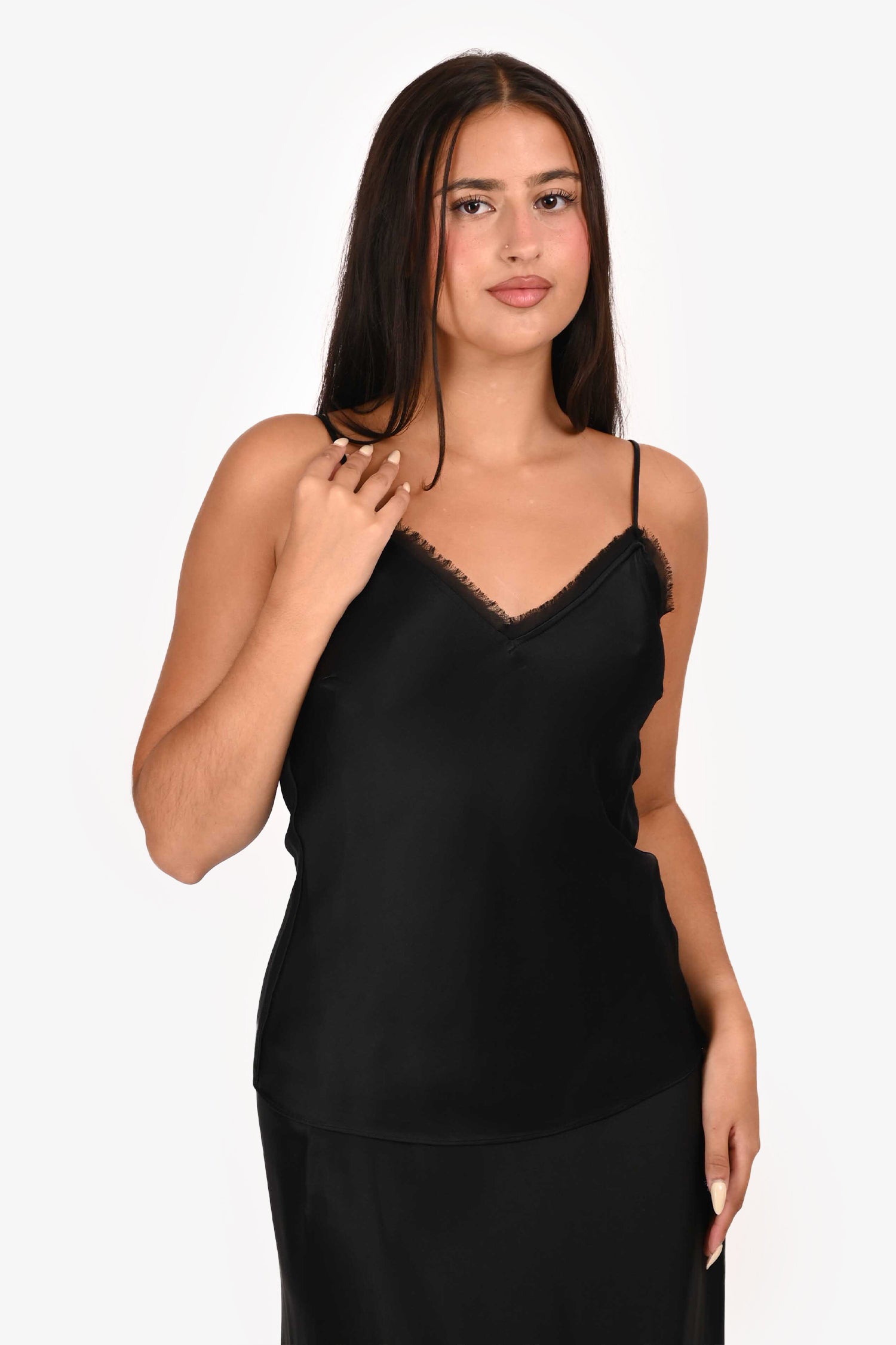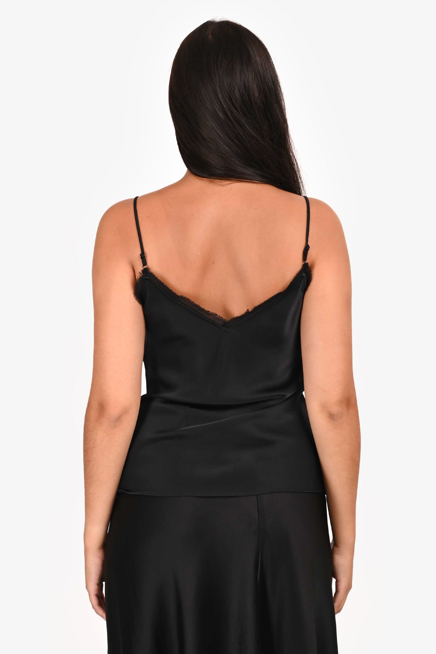 Refresh availabilityFrame Black Satin Cami. V-neckline in the front and back. Adjustable shoulder straps. Two front darts. Fringe detailing on the front and back neckline. Tonal stitching.
