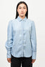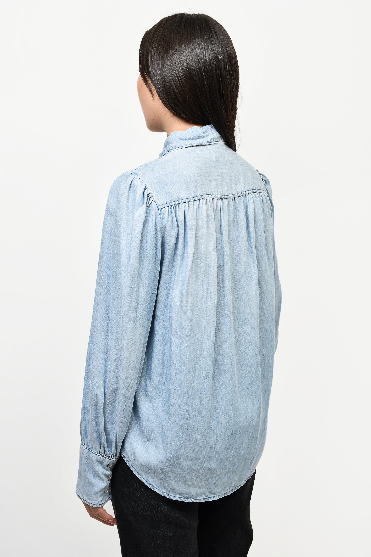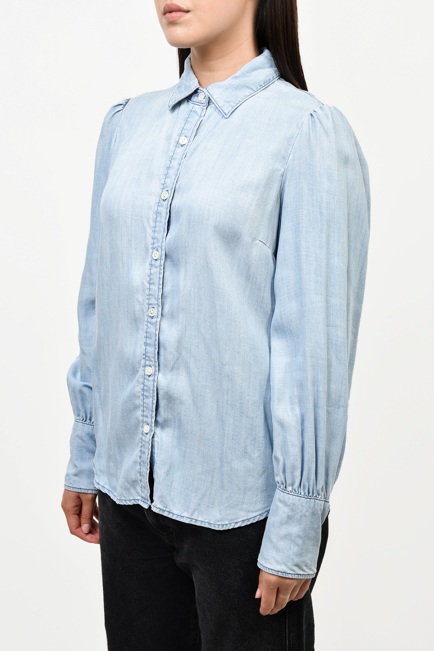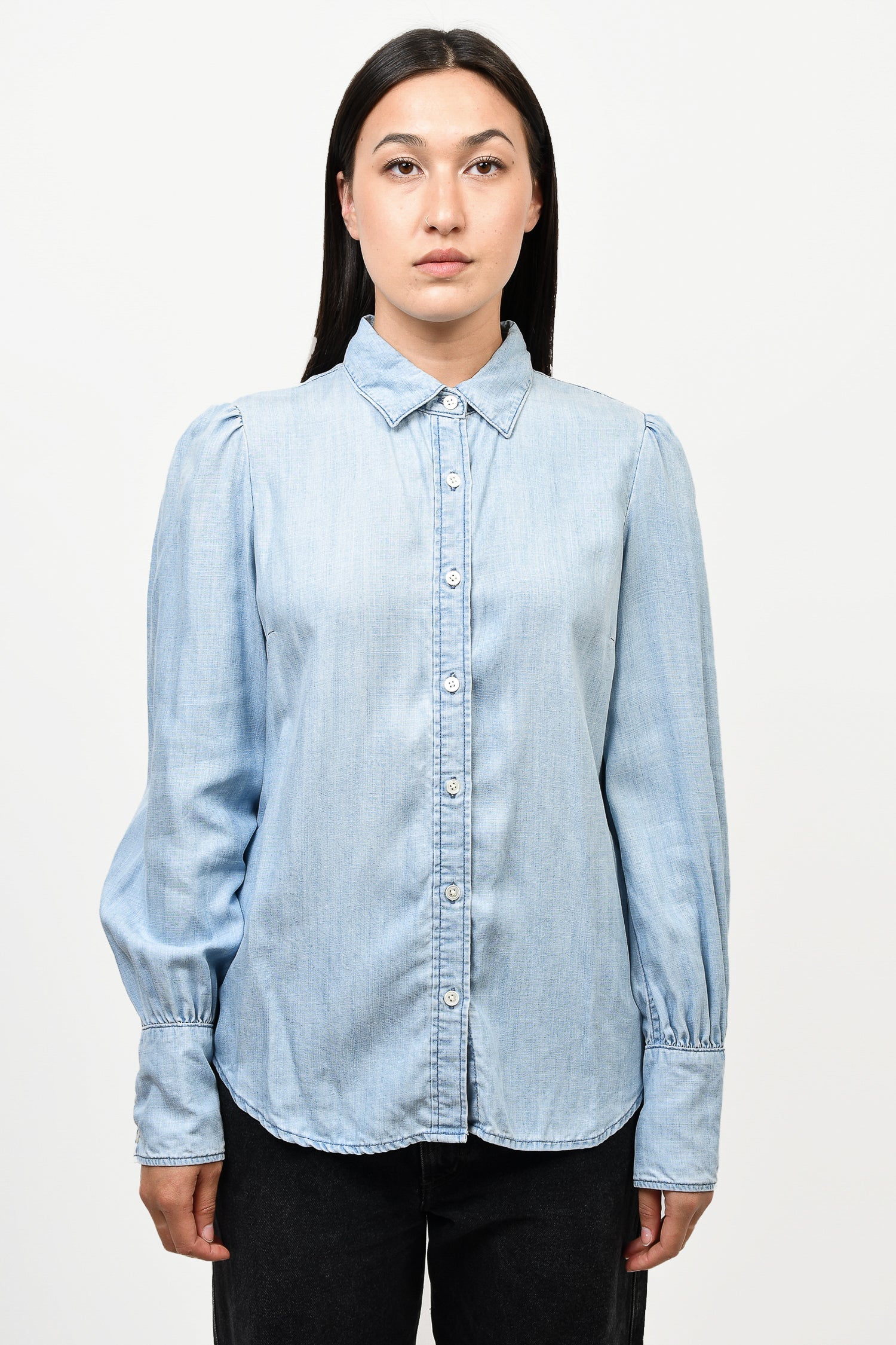Refresh availabilityFrame Blue Denim Button-Up Shirt. Front button closure. Long-sleeves. 3 Button closure on the cuffs. Tonal stitching.