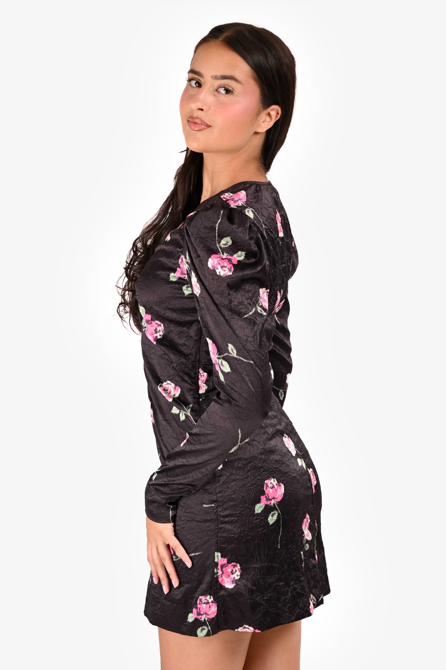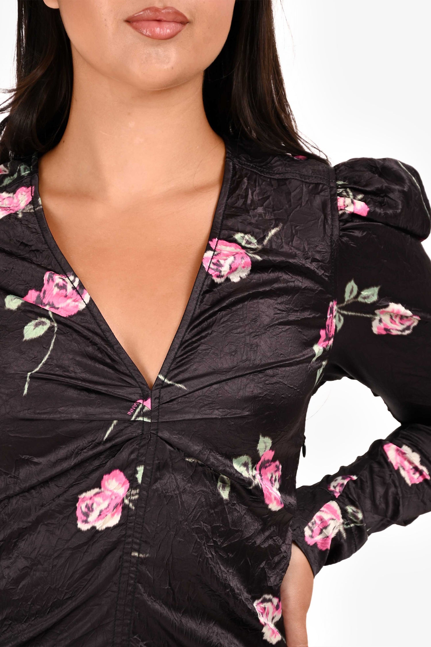 Refresh availabilityGanni Black Floral Satin Mini Dress. V-neckline. Long sleeves. Side zip closure. Tonal stitching.