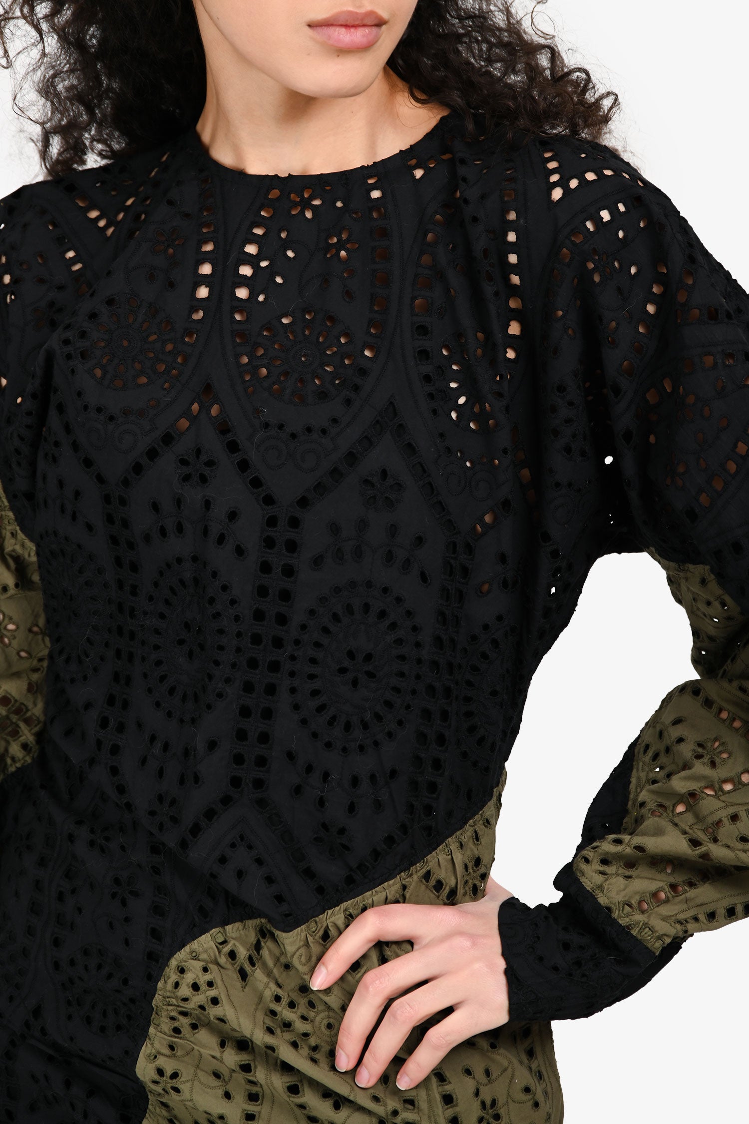 Refresh availabilityGanni Black/Green Perforated Puff Sleeve Mini Dress. Slip-on. Round neckline. Rear zip and hook closure. Unlined. Tonal stitching.