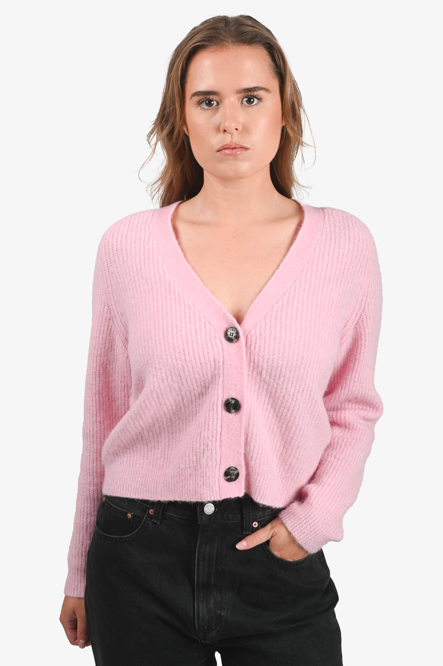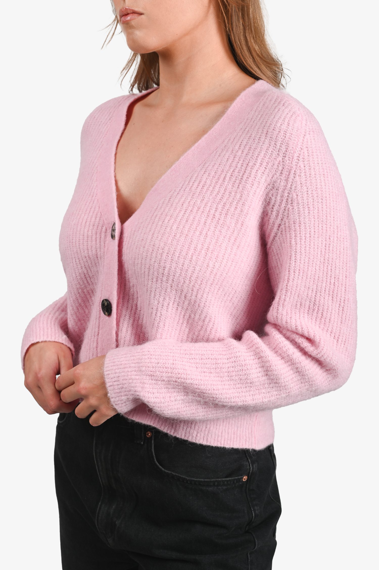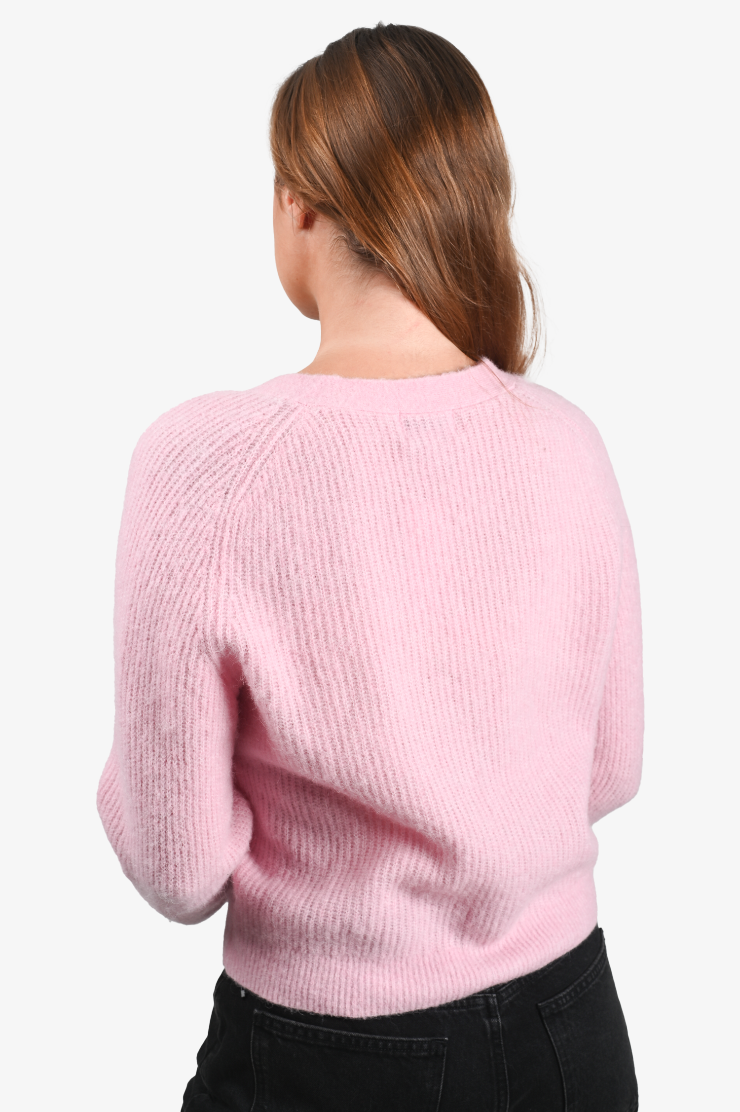 Refresh availabilityGanni Pink Alpaca Wool Knit Cardigan. Front button-up closure. V-neckline. Ribbed neck, cuffs and hem. Tonal stitching.