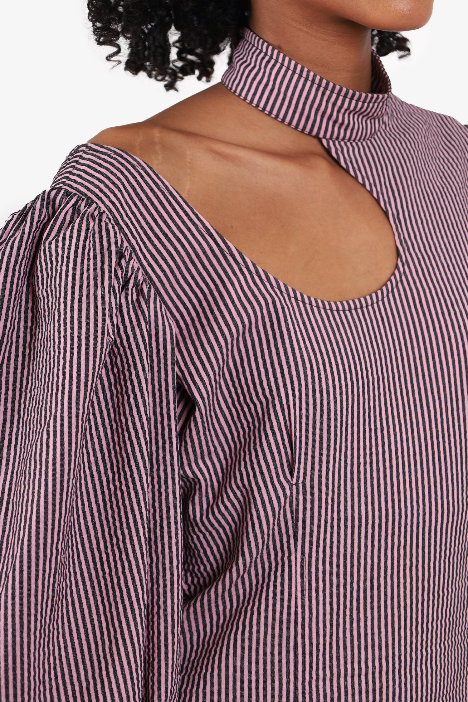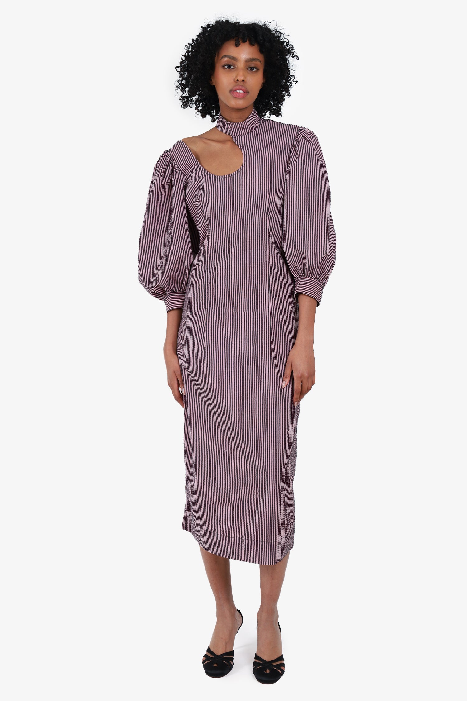 Refresh availabilityGanni Pink/Purple Striped Puff Sleeve Midi Dress. Button closure on neck strap. Puff sleeves. Asymmetrical neckline. Tonal stitching.