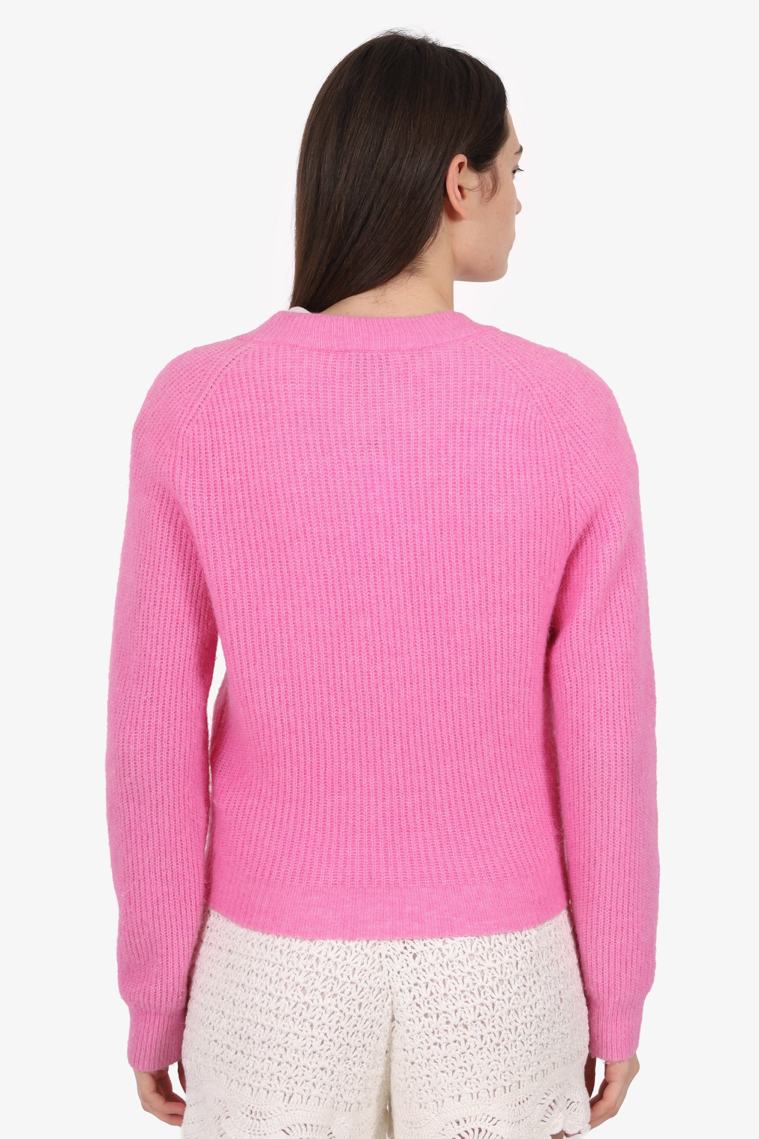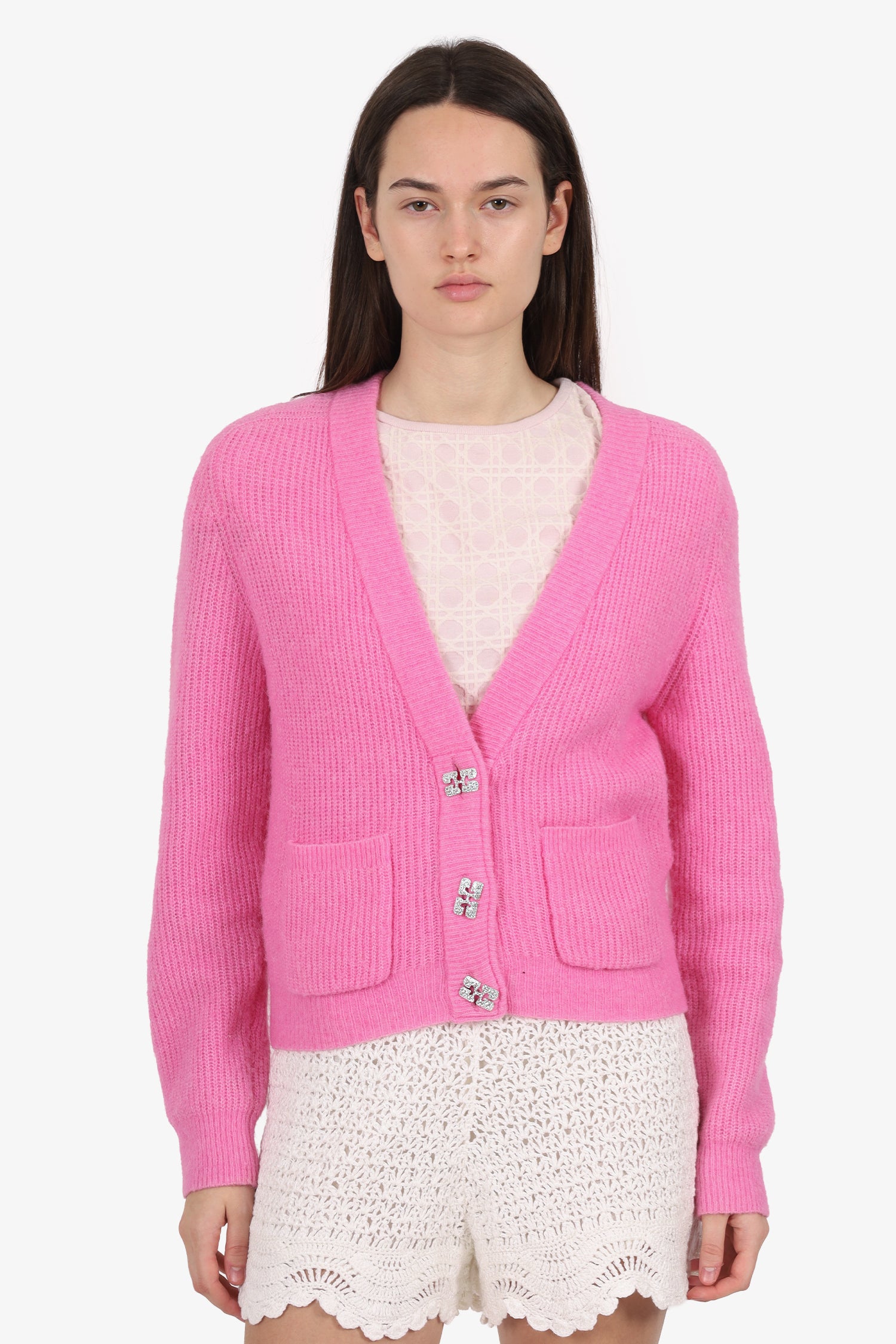 Refresh availabilityGanni Pink Wool Cardigan. Pull-on. V-neckline. Front button-up closure. 2 exterior front slip pockets. Silver-tone hardware. Tonal stitching.