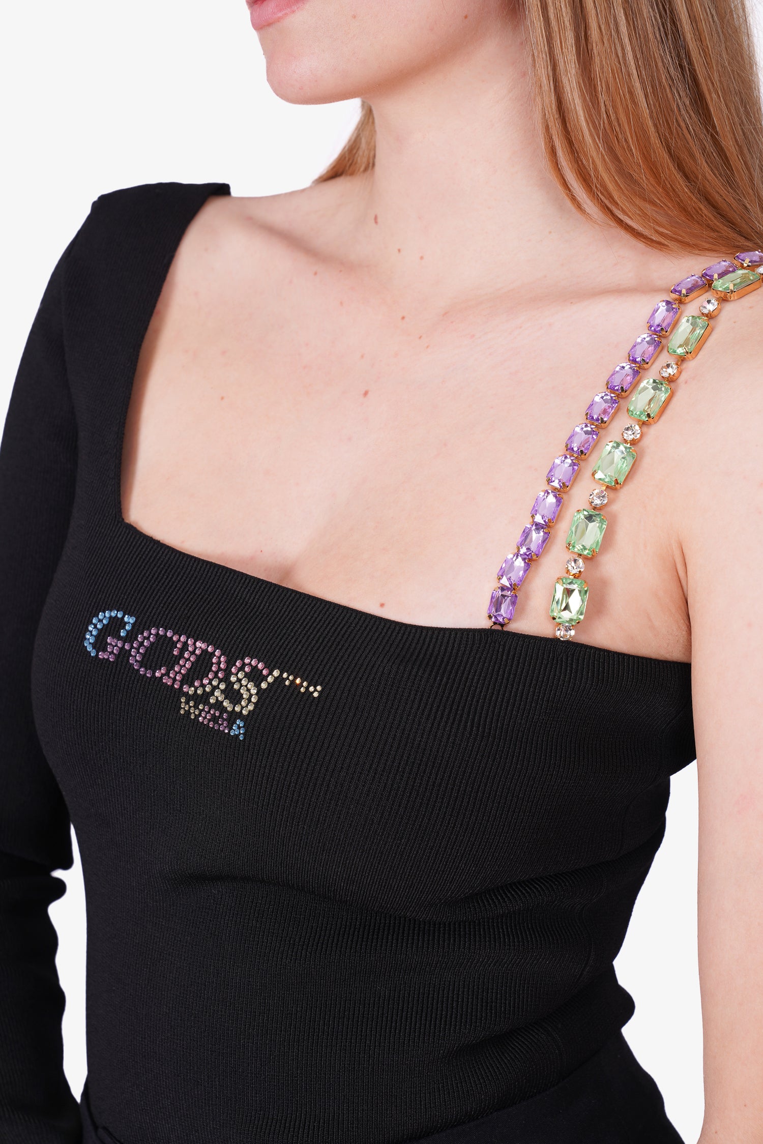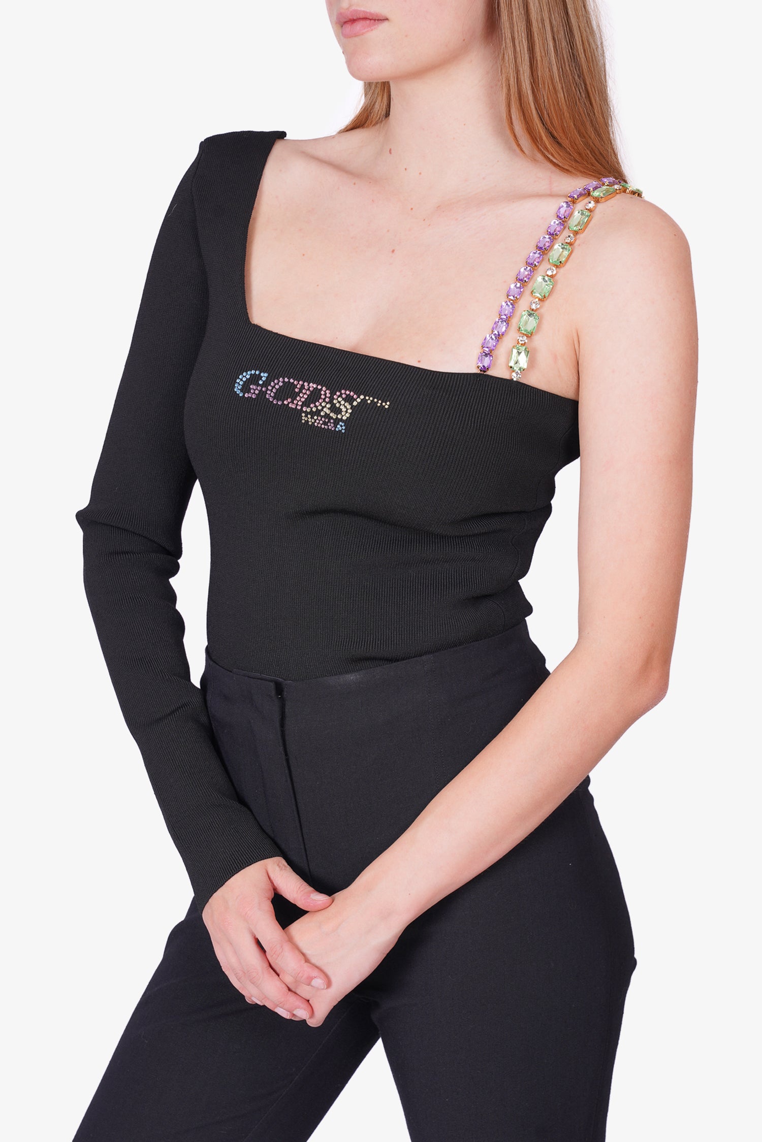 Refresh availabilityGCDS Black Asymmetric Crystal Embellished Ribbed Bodysuit. Adjustable crystal strap. Snap bottom closure. Tonal stitching.