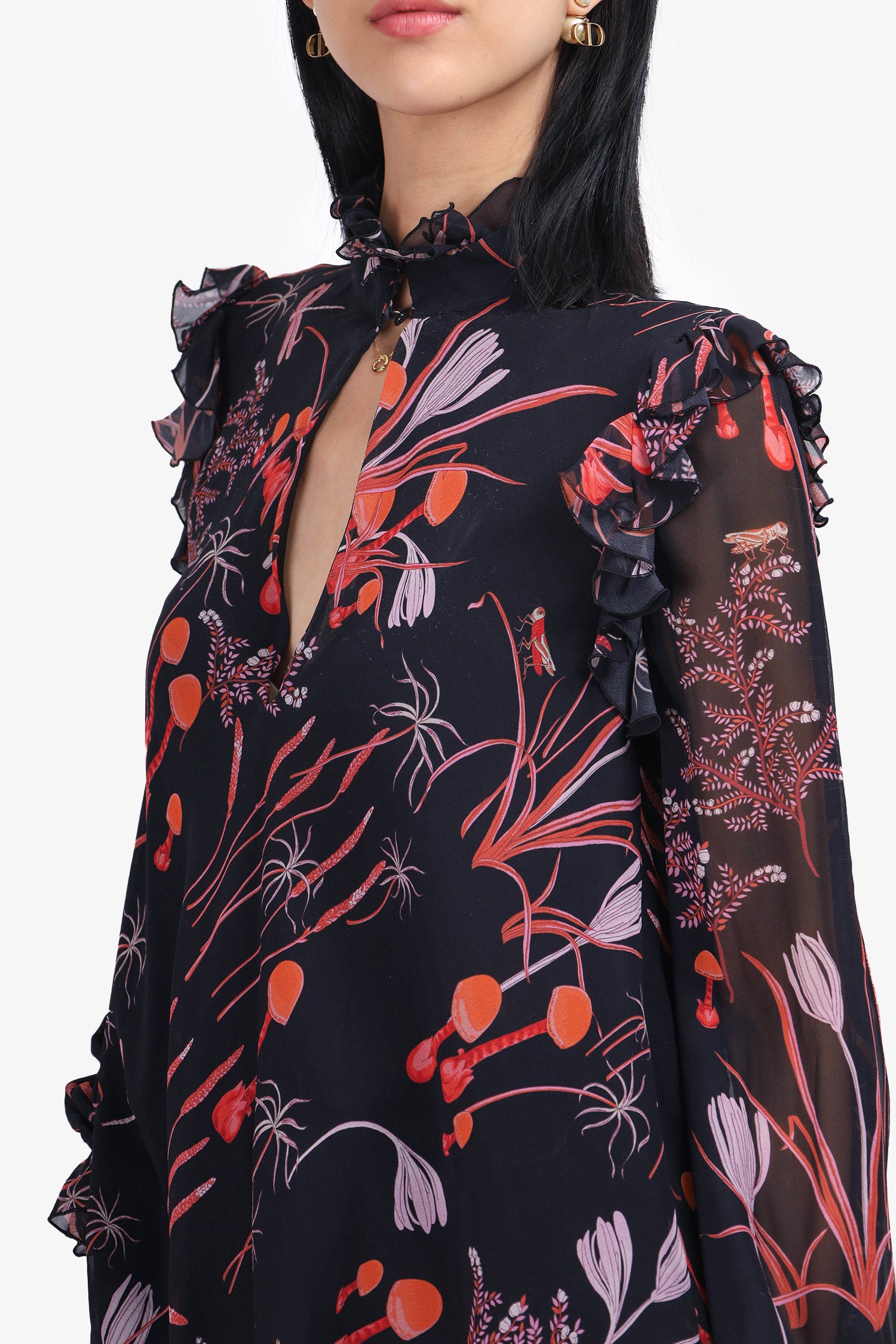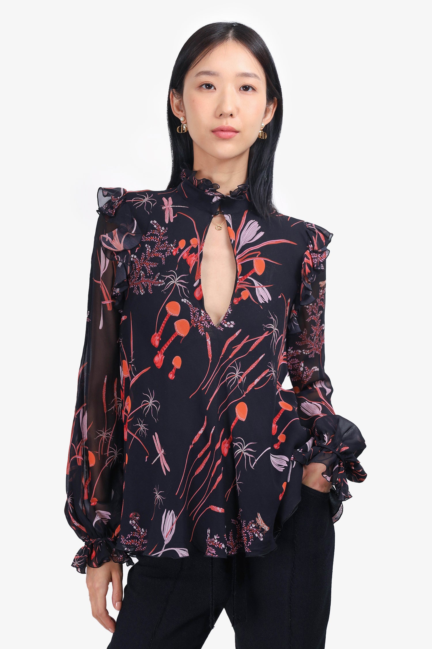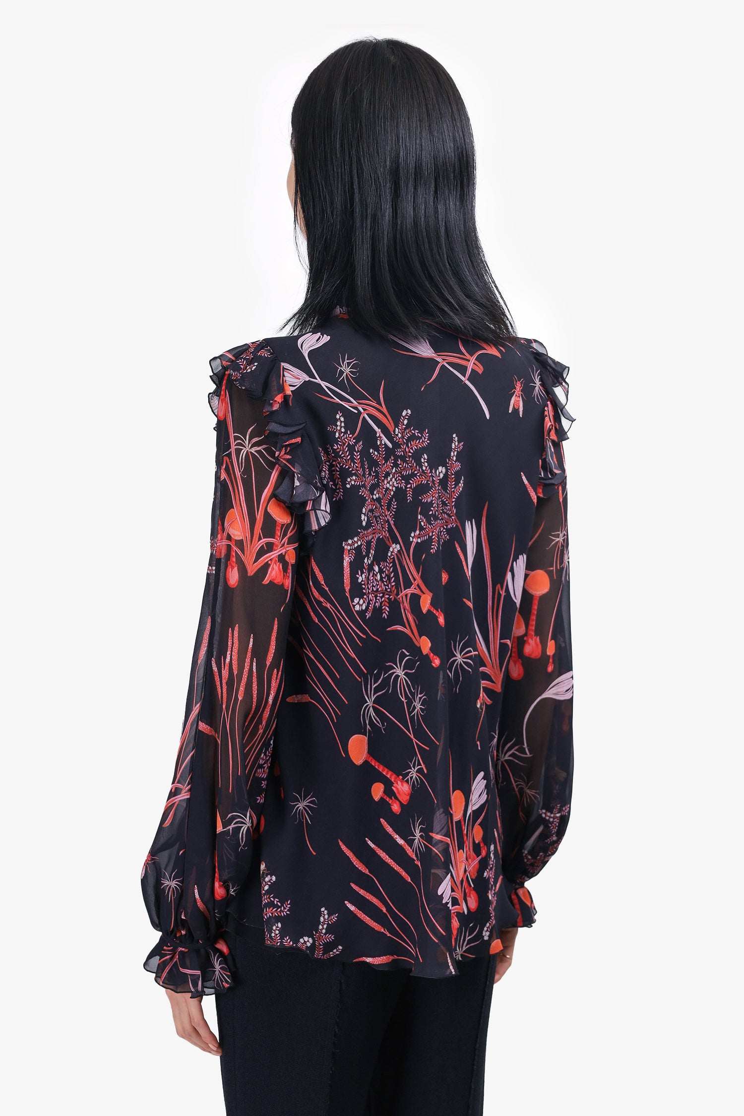 Refresh availabilityGiambattista Valli Black Silk Printed Blouse. Slip-on. V-neckline with ruffled collar. Cinched sleeve cuffs with button-up closure. Ruffled bottom hem. Tonal stitching. Lightly lined.