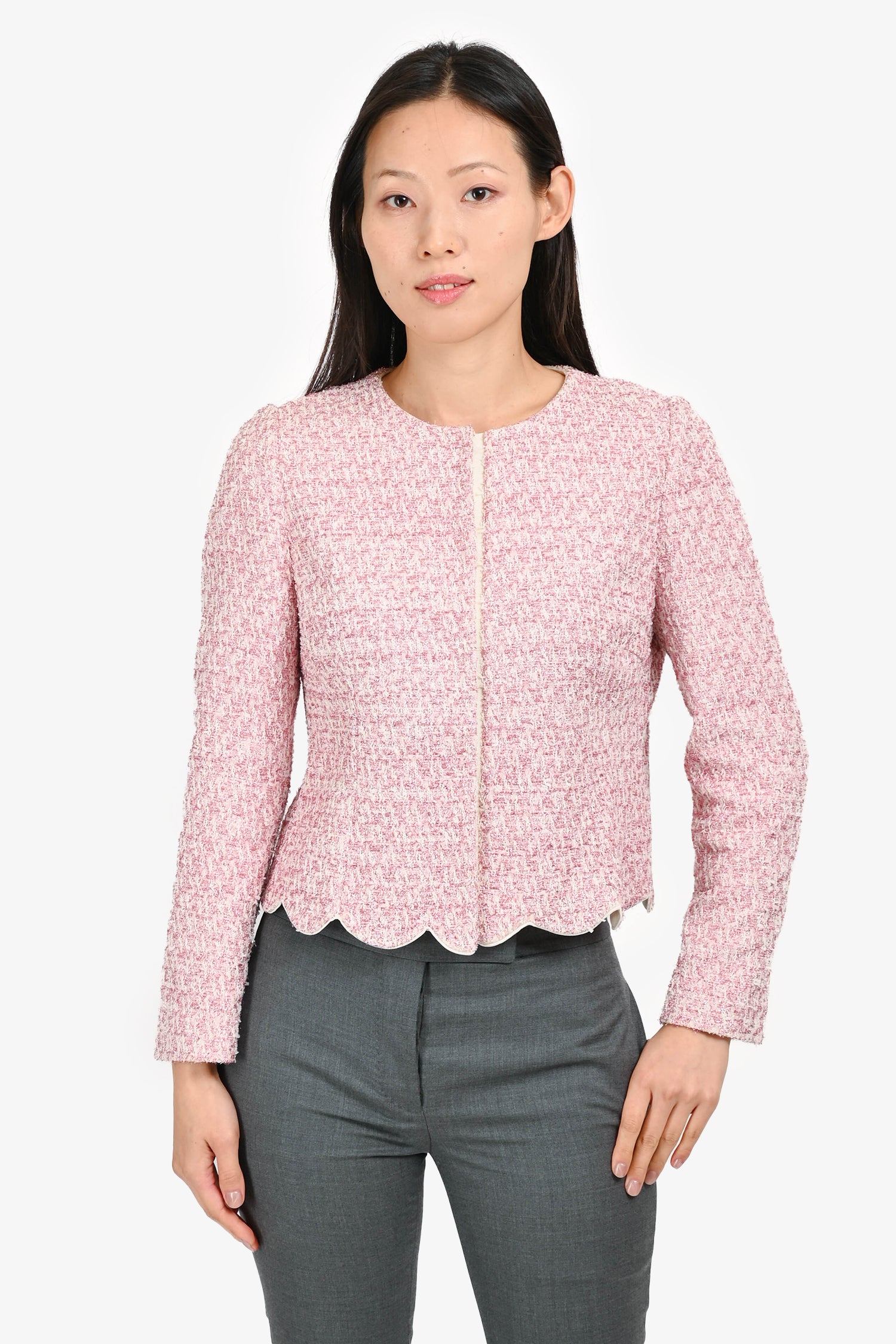 Refresh availabilityGiambattista Valli Pink Metallic Scallop Detail Cropped Jacket. Front snap button closure. Lined interior. Tonal stitching.