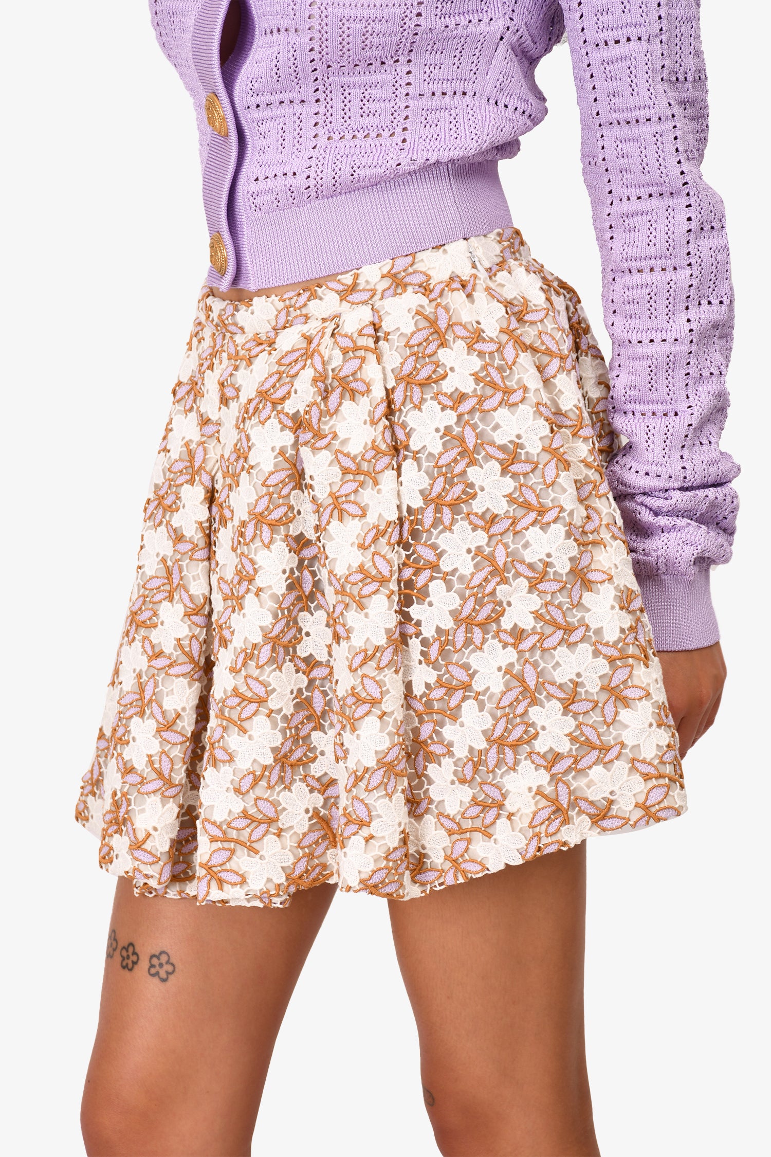 Refresh availabilityGiambattista Valli White/Purple Floral Lace Mini Skirt. Side zipper closure. Pleated throughout. Tonal stitching.