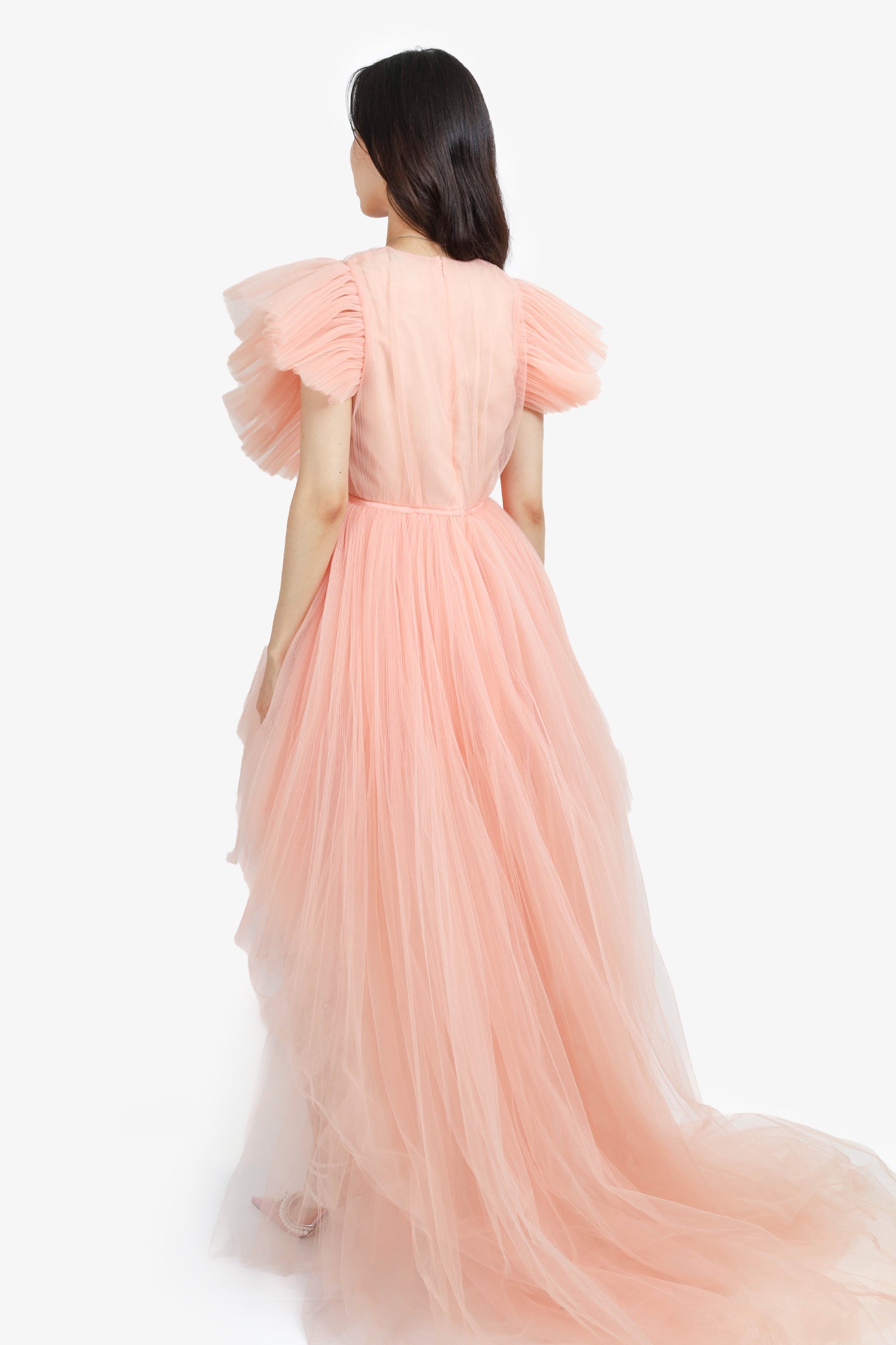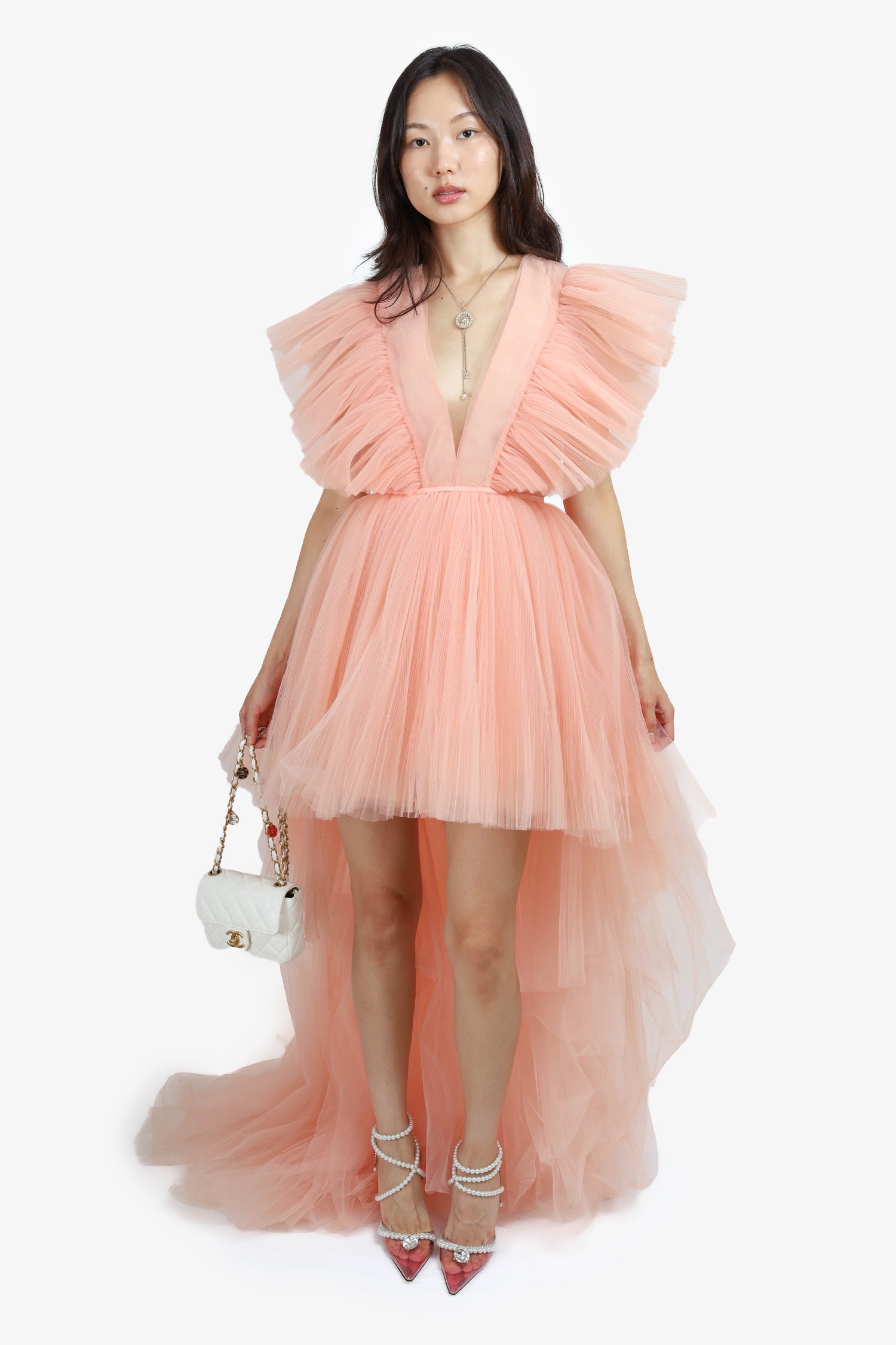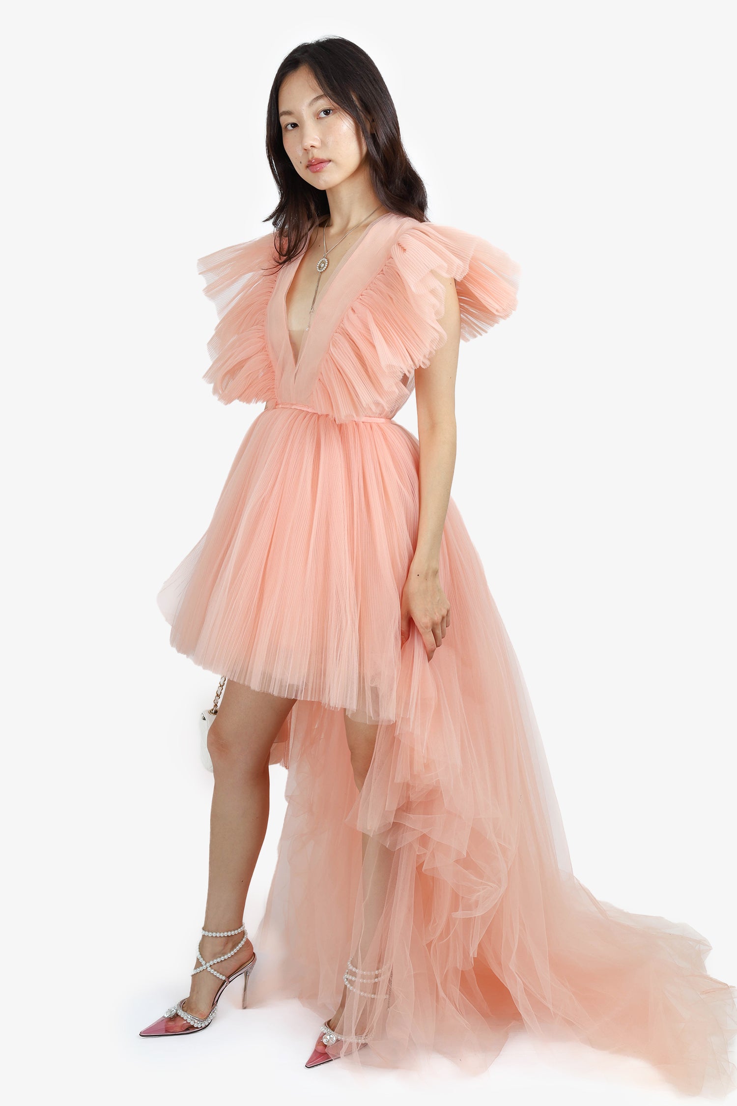 Giambattista Valli x H&M Pink Tulle Gown. Rear zip closure. V-neckline. Lined. High-low hem. Tonal stitching.