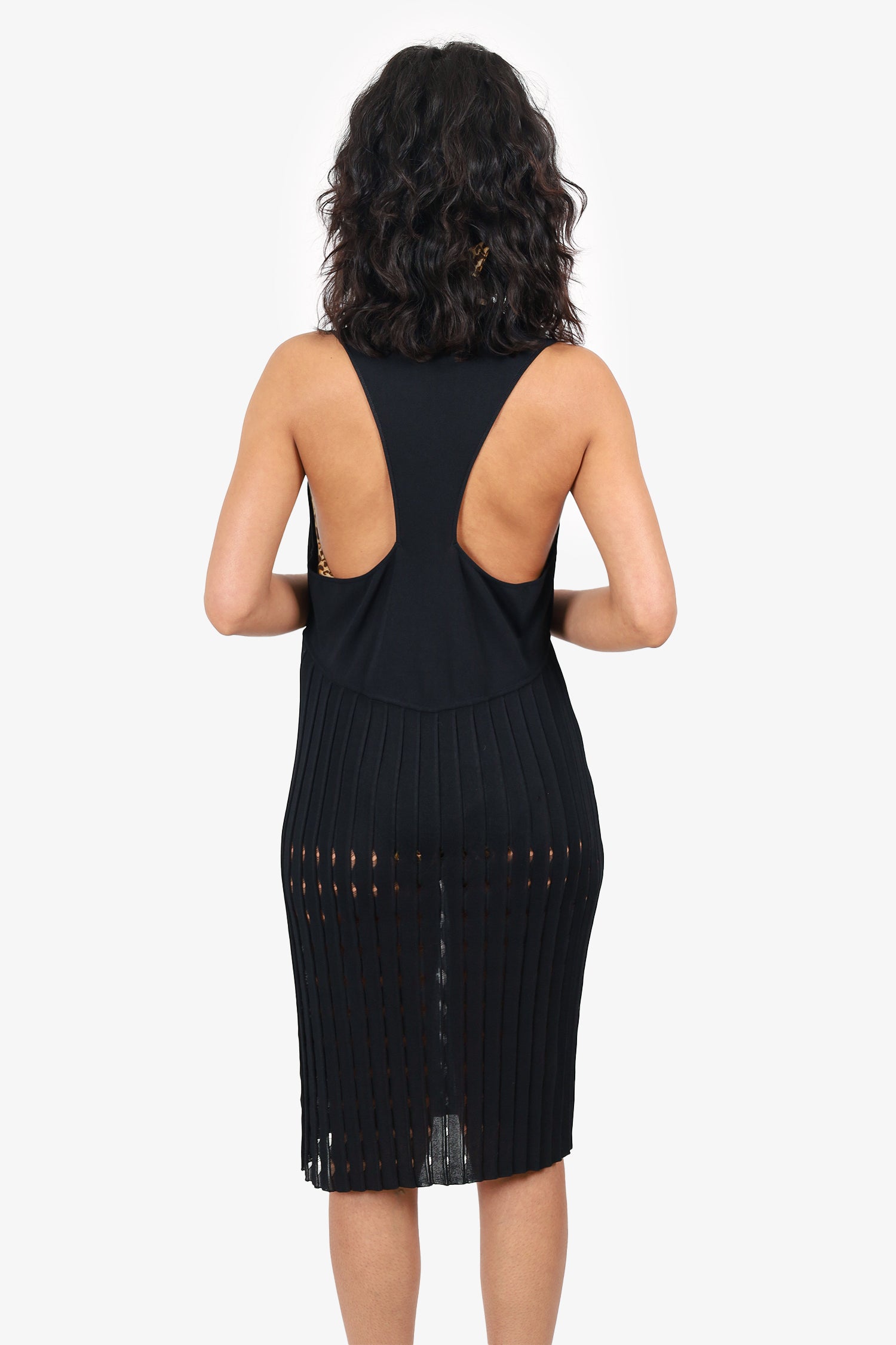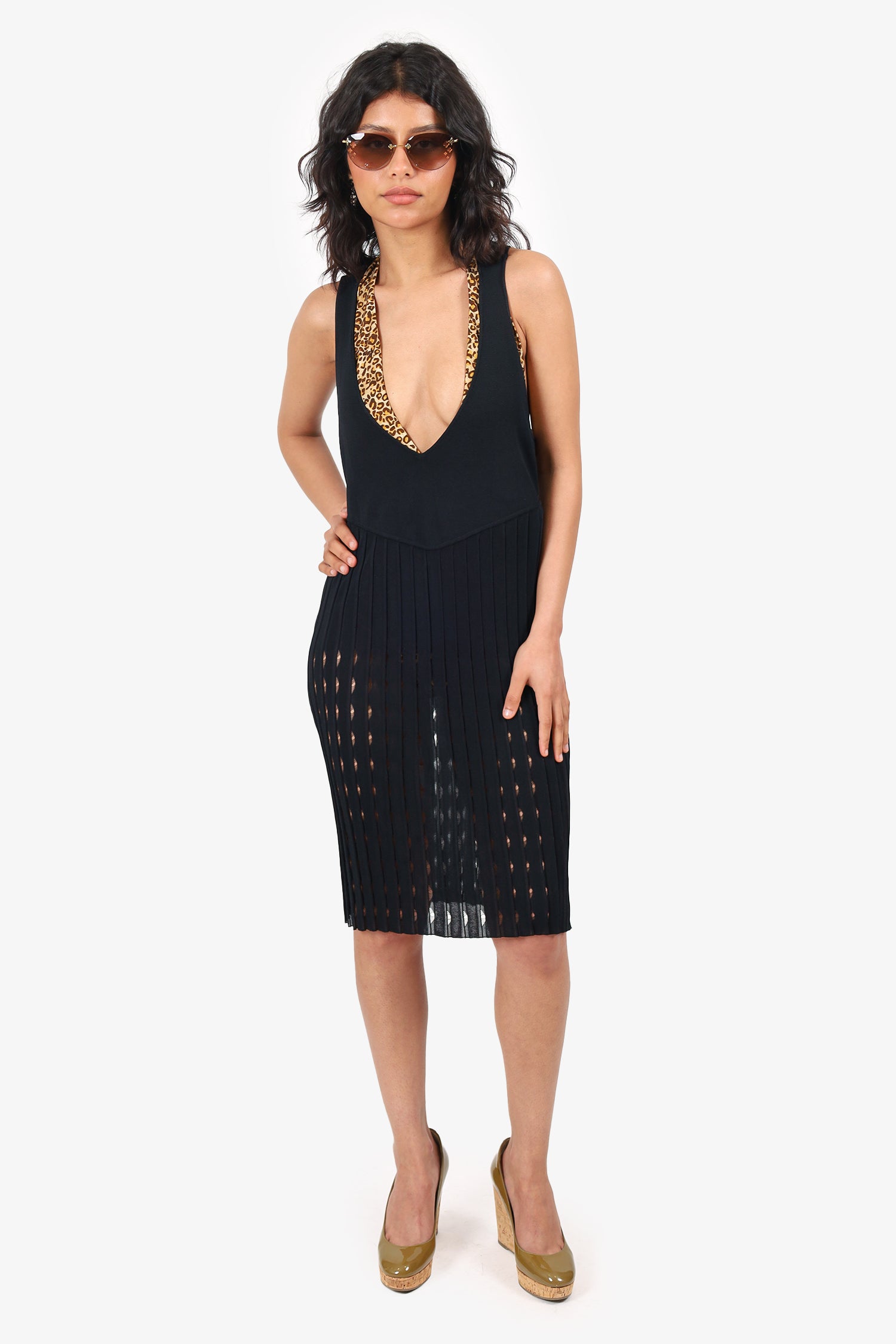 Refresh availabilityGianni Versace Black Knit Pleated V-Neck Sleeveless Dress. Pull-on. V-neckline. Tonal stitching.