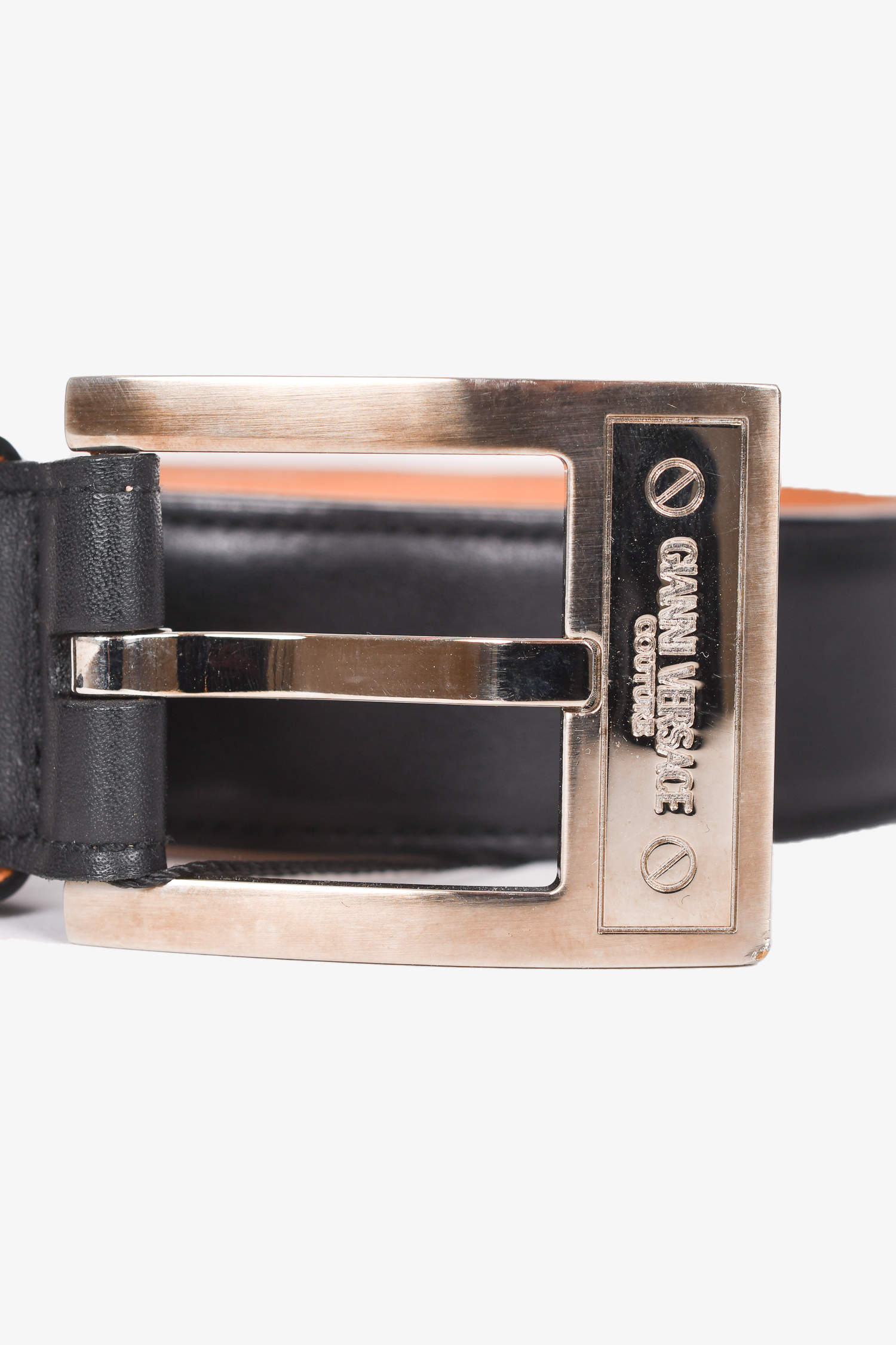 Refresh availabilityGianni Versace Couture Black Leather Belt. Buckle closure. Silver-tone hardware. Tonal stitching.