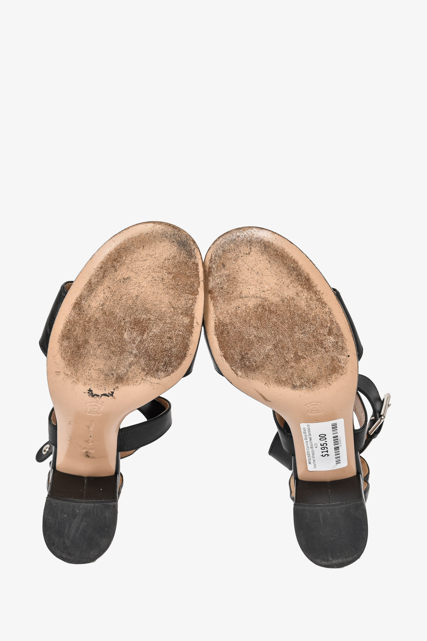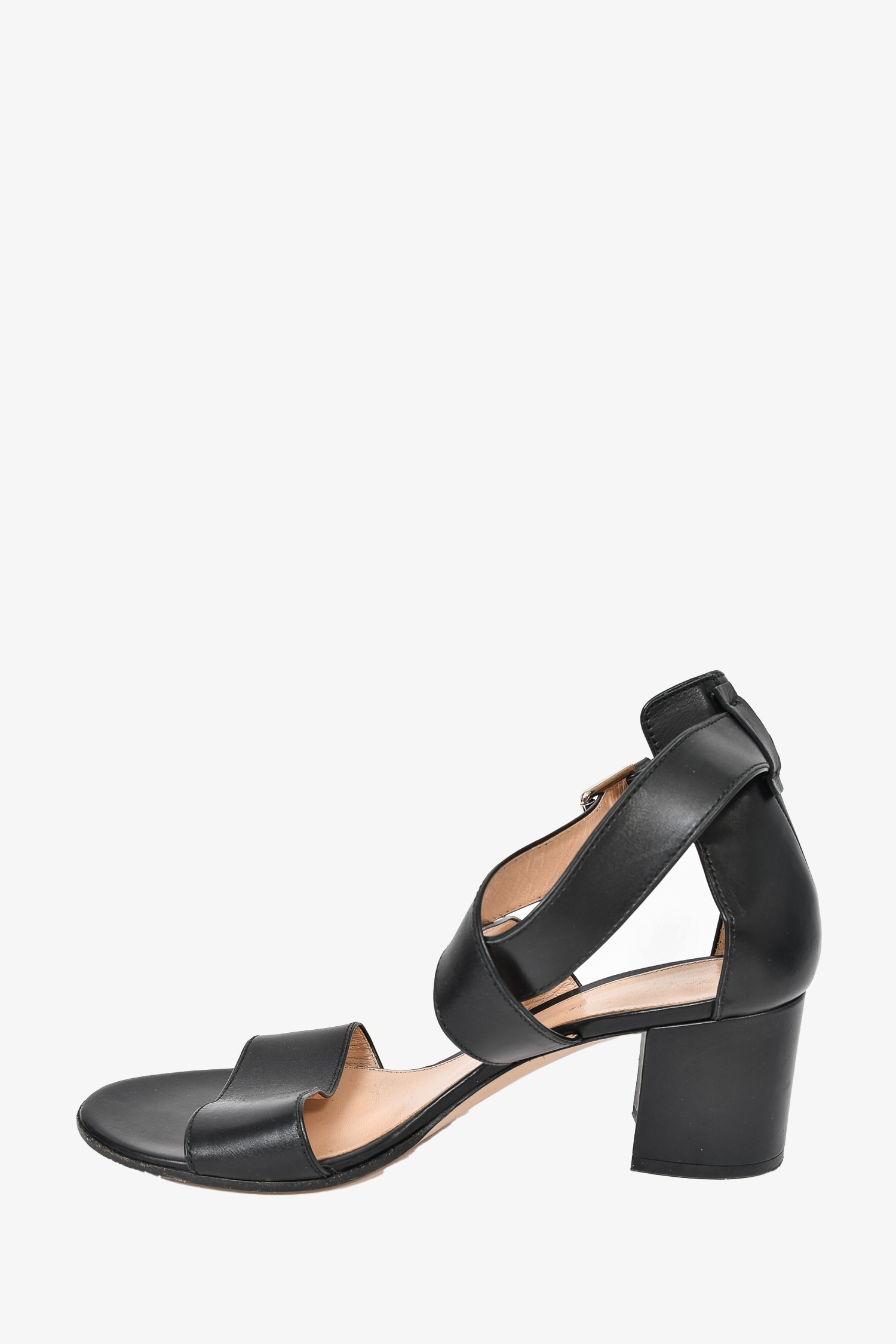 Refresh availabilityGianvito Rossi Black Leather Strappy Block Heel Sandals. Ankle strap with buckle closure. Tonal stitching.