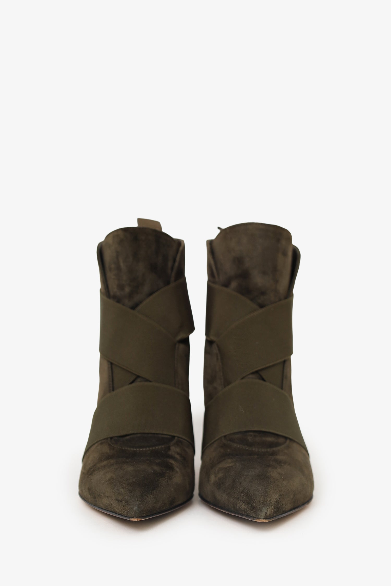 Refresh availabilityGianvito Rossi Green Khaki Suede Pointed Kitten Heel Ankle Boots. Pull-on. Pointed toe. Rear pull tab. Leather lined interior. Tonal stitching.