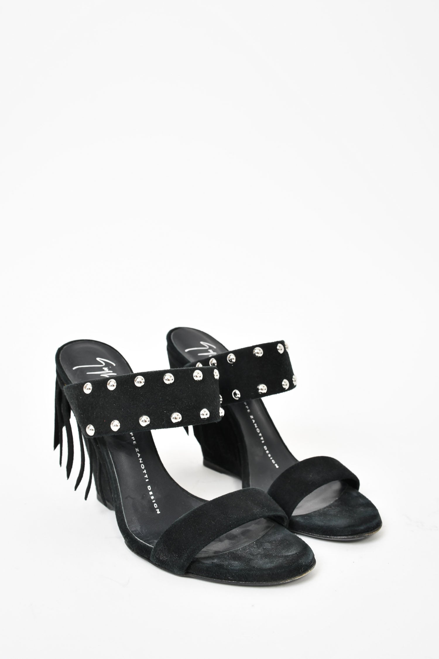 Refresh availabilityGiuseppe Zanotti Black Studded Fringe Wedge. Open toe. Slip-on. Tonal stitching.