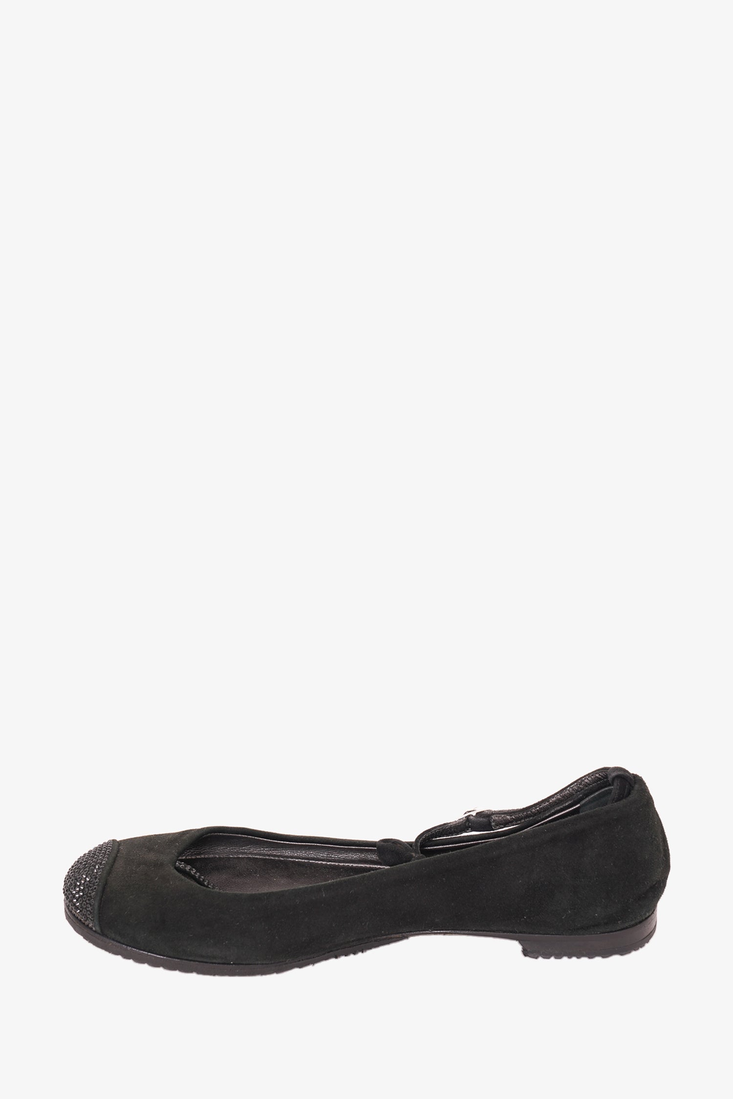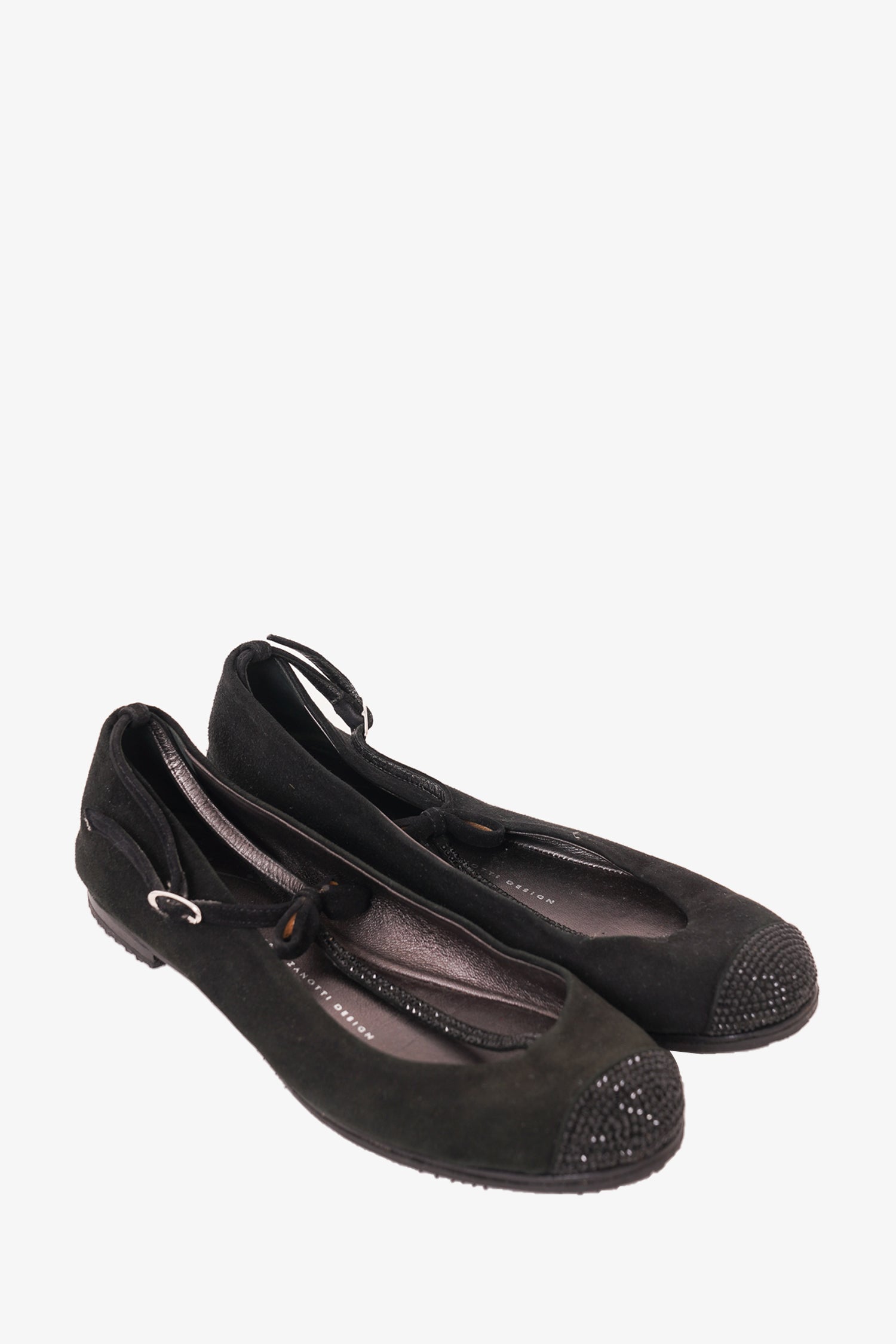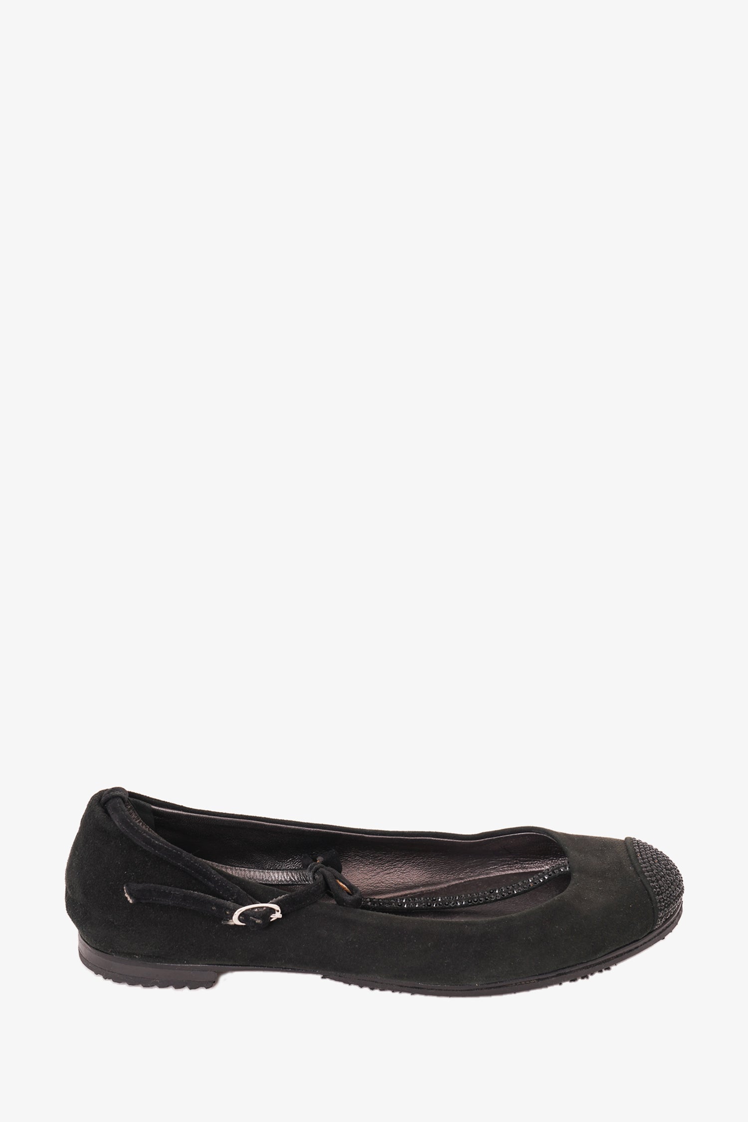 Refresh availabilityGiuseppe Zanotti Black Suede Crystal Embellished Ballet Flat. Round toe. T strap with buckle closure. Tonal stitching.