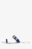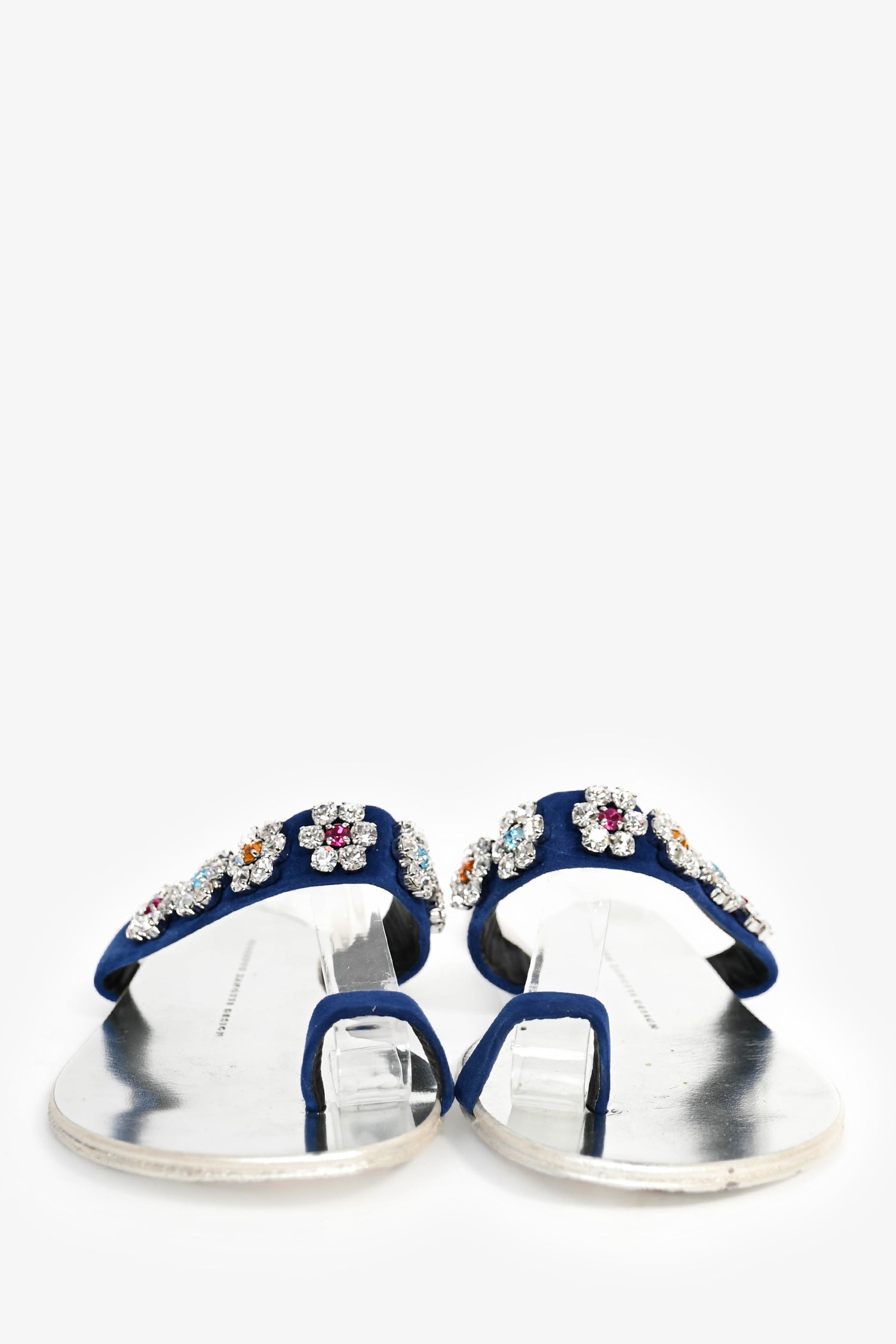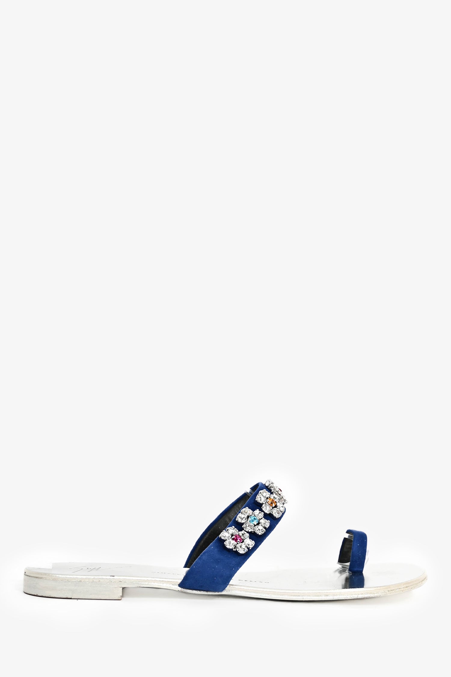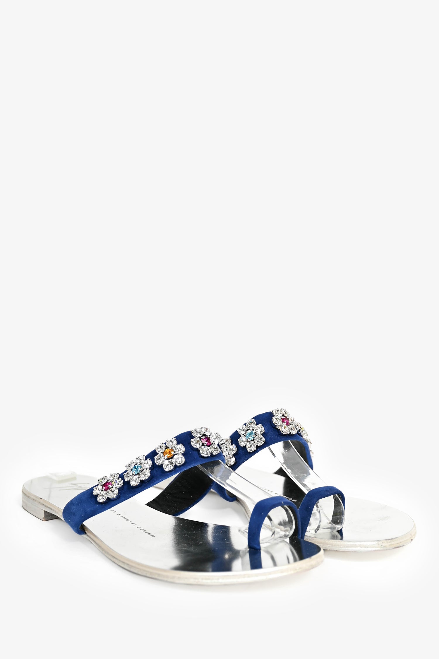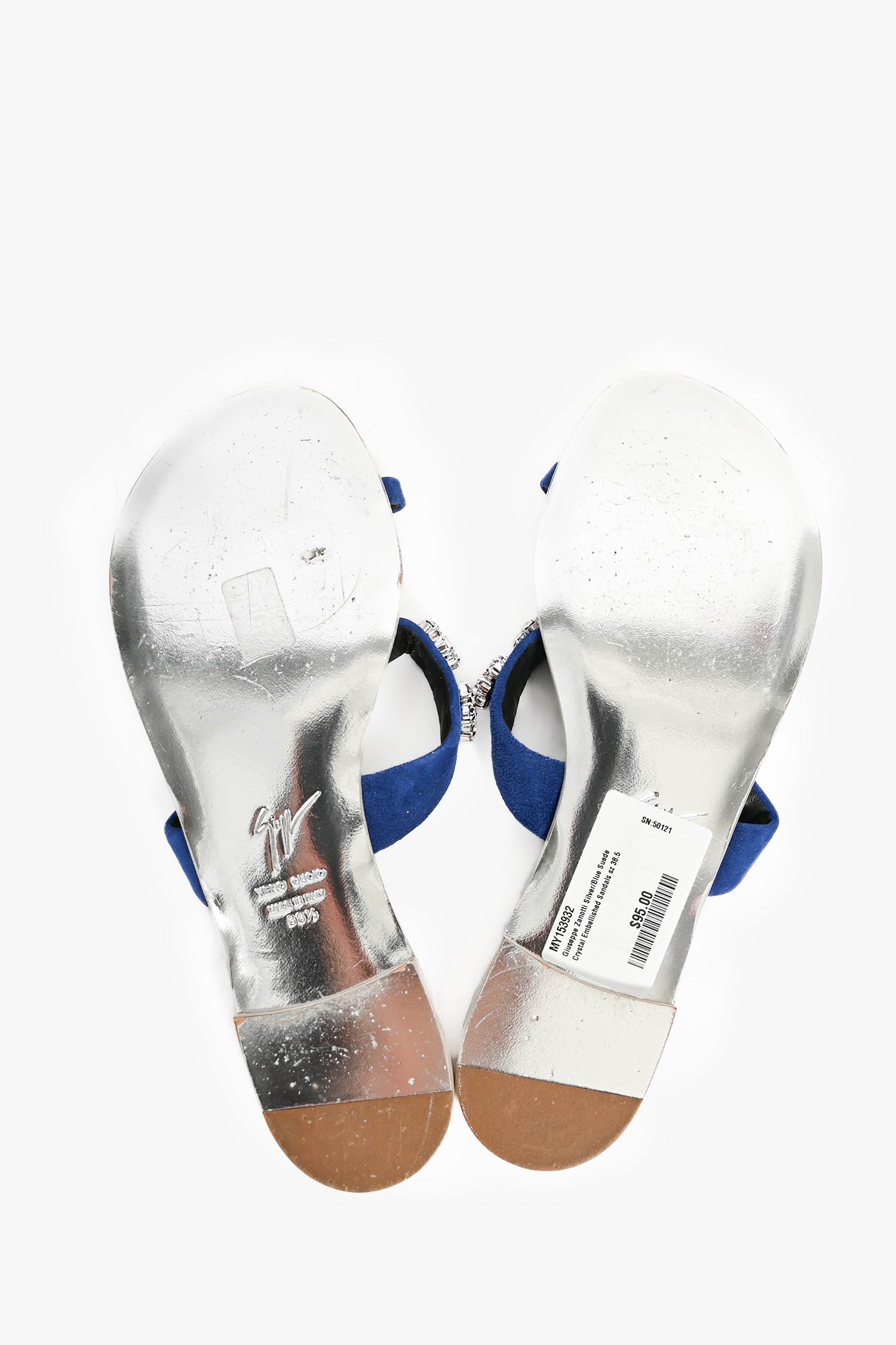 Refresh availabilityGiuseppe Zanotti Silver/Blue Suede Crystal Embellished Sandals. Blue suede trimming with crystal embellishment. Slip-on. Tonal stitching.