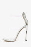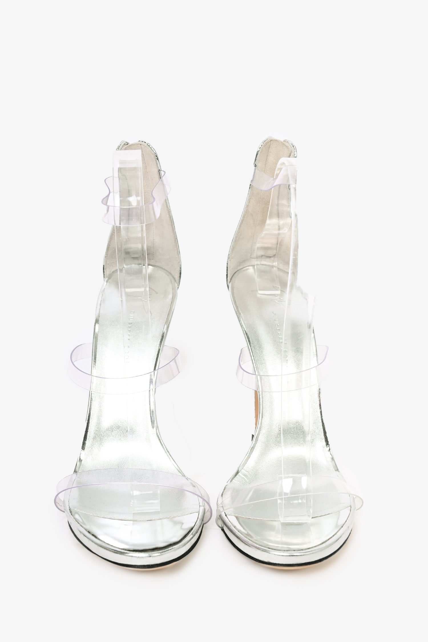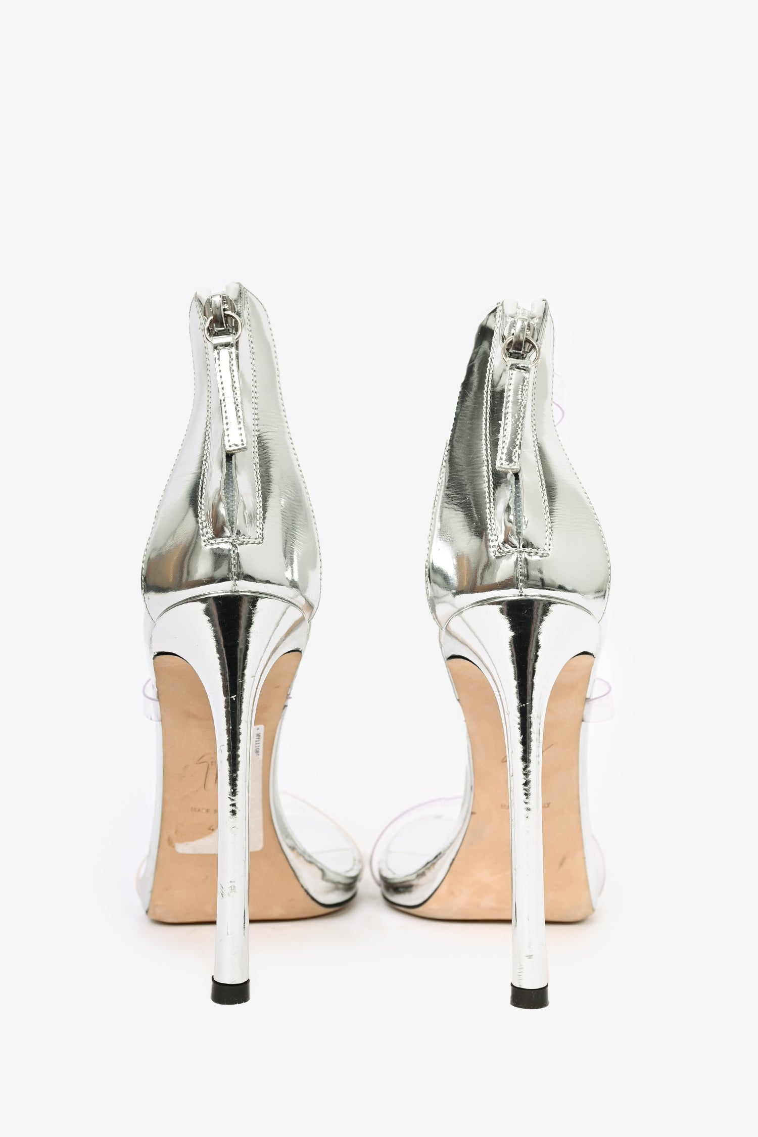 Refresh availabilityGiuseppe Zanotti Silver Leather PVC Strappy Heeled Sandals. Rear zip closure. Skinny heel. Tonal stitching